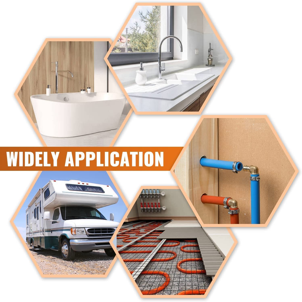 【Package Includes】: Pex Fittings Set includes 25pcs 1/2" PEX Tees 【Non-Pollution】: 1/2" Pex Tee Set is Lead free brass pex fittings, comply with drinking water standard. ASTM F1807 NSF/ANSI 61 Certified. 【Extra-Long Service Life】: High-quality brass pex tee set resists corrosion, rust and high temperature (32℉—200℉). 【Applications】: 1/2" Pex fittings can be used for PEX pipes in plumbing jobs. For Pex Tubing. Great for hot or cold water distribution and and hydronic heating systems in your home, in warehouse or in RV. But NOT UPONOR/Wirsbo EXPANSION SYSTEM & PB TUBE. 【Compatible Products】: 1/2 inch Pex Fittings use with Stainless Steel Clamp Rings or PEX Crimp Copper Rings. (Clamp rings are not included in this set.) 【Warm Tips】: NOT Compatible with UPONOR/Wirsbo EXPANSION SYSTEM & PB TUBE. Product Description SUNGATOR PEX FITTINGS Add to Cart Add to Cart Add to Cart Add to Cart Add to Cart Add to Cart Add to Cart Customer Reviews 4.8 out of 5 stars 2,020 4.8 out of 5 stars 927 4.8 out of 5 stars 2,020 4.8 out of 5 stars 2,020 4.7 out of 5 stars 265 4.7 out of 5 stars 1,005 4.7 out of 5 stars 1,005 Price $31.99 $ 31 . 99 $25.99 $ 25 . 99 $19.99 $ 19 . 99 $29.99 $ 29 . 99 $12.99 $ 12 . 99 $10.99 $ 10 . 99 $25.99 $ 25 . 99 Includes 1/2" PEX Tee 25pcs Elbow x12;Tee x12;Coupling x12 1/2" PEX Coupling 25pcs 1/2" PEX Drop Ear Elbow 12pcs 1/2" PEX Drop Ear Elbow 4pcs 1/2" PEX Female Adapter 6pcs 1/2" PEX Female Adapter 12pcs Size 1/2 inch 1/2 inch 1/2 inch 1/2 inch 1/2 inch 1/2 inch 1/2 inch Applications PEX and PE-RT pipe PEX and PE-RT pipe PEX and PE-RT pipe PEX ,Copper and PE-RT pipe PEX ,Copper and PE-RT pipe PEX ,Copper and PE-RT pipe PEX ,Copper and PE-RT pipe Thread Type PEX PEX PEX PEX to NPT Female PEX to NPT Female PEX to NPT Female PEX to NPT Female Material Brass Brass Brass Brass Brass Brass Brass SUNGATOR 25PCS 1/2 Inch Elbow Pex Fittings Pex Shower Head Fitting Pex to Garden Hose Pex Valve In Kitchen Full-port for control and shut off water flow to fixtures or appliances for maintenance and repair. Pex Ball Valve Create ManiFolds to keep all your shut off valves in one location. 1 INDOOR DROP EAR ELBOW 2 OUTDOOR DROP EAR ELBOW 3 SHUT OFF VALVE 4 IN MANIFOLD Connection Steps 1. Cut the pex tubing. 2. Slip the clamp. 3. Cinch the ring. 4. Done.