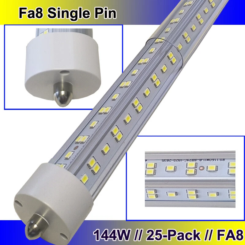 FAST DELIVERY - Ship from New Jersey or Los Angeles Warehouse via FedEx , 3-7 Days Delivered Your Door . SCIENTIFIC DESIGN - 8Ft LED Shop Lights Fixture is Made of 6500K Cold White SMD2835 LED Chip ,Plastic Clear Cover , Aluminum Bracket Housing ,and AC85-277V Constant Current Driver . It can work in -68F to 120F Temperature Conditions EASY INSTALLATION - The Integrated Tube Fixture Can be Install on Wall or Ceiling ,Easily Replace Traditional Fluorescent Tube Bulb . Plug and Play , Free Accessories (Power Cords, Connector , Extension Cords , Clip and Screw ) Come with Tube Lights Together WIDE APPLICATION - Linkable 8Ft Bulbs Widely Used in Garage Ceiling , Barbershop , Schools, Hospitals Basement , Factory Warehouses , Supermarkets Cooler Door , Offices, Shops,Hotels, etc 25Pc 144W T8 8FT FA8 Single Pin Led Tube Light Bulbs 144 8' LED Shop Light 6500K 【No RF & FM Interference】LED Driver have passed Electromagnetic Magnetic Compatibility EMC tests,No cause EMI ,No longer subject to any RF & FM jamming. Never interfering with the signal of your garage roller shutter door,No make noise when you listen radio 【Easy to Install】Just simply bypass the ballast and connection AC85-277V AC power . Not compatible with single-ended powered sockets 【Wide Application】 - 8Ft 144W V Shaped FA8 HO LED Bulb fitted to replace traditional F96T12 T8 T10 T12 fluorescent bulbs. Widely used in Garage,supermarkets, offices , convenience stores , gas stations , warehouse,parking lot,shops, hotels,Refrigerator,coolers or freezers illumination,etc 【High Output】8Ft 144W 18000LM FA8 【Rotate Cap & Swivel End】 Easy Adjust rotated Lighting Direction within 180 degree after Installation