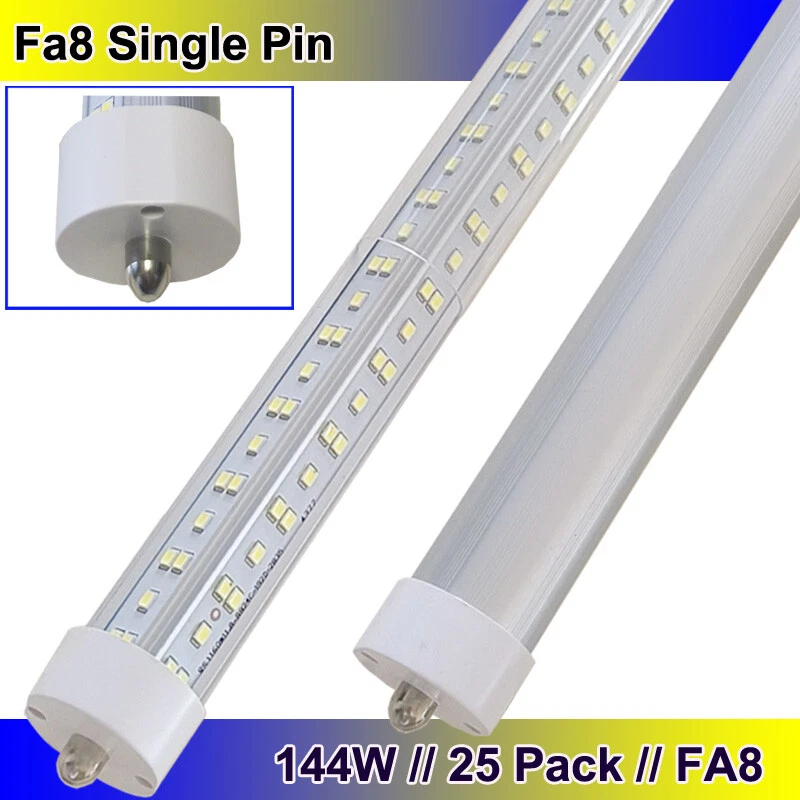 FAST DELIVERY - Ship from New Jersey or Los Angeles Warehouse via FedEx , 3-7 Days Delivered Your Door . SCIENTIFIC DESIGN - 8Ft LED Shop Lights Fixture is Made of 6500K Cold White SMD2835 LED Chip ,Plastic Clear Cover , Aluminum Bracket Housing ,and AC85-277V Constant Current Driver . It can work in -68F to 120F Temperature Conditions EASY INSTALLATION - The Integrated Tube Fixture Can be Install on Wall or Ceiling ,Easily Replace Traditional Fluorescent Tube Bulb . Plug and Play , Free Accessories (Power Cords, Connector , Extension Cords , Clip and Screw ) Come with Tube Lights Together WIDE APPLICATION - Linkable 8Ft Bulbs Widely Used in Garage Ceiling , Barbershop , Schools, Hospitals Basement , Factory Warehouses , Supermarkets Cooler Door , Offices, Shops,Hotels, etc 25Pcs 144W T8 8FT Single Pin FA8 Led Tube Light Bulbs 8' Led Shop Light 6500K 【No RF & FM Interference】LED Driver have passed Electromagnetic Magnetic Compatibility EMC tests,No cause EMI ,No longer subject to any RF & FM jamming. Never interfering with the signal of your garage roller shutter door,No make noise when you listen radio 【Easy to Install】Just simply bypass the ballast and connection AC85-277V AC power . Not compatible with single-ended powered sockets 【Wide Application】 - 8Ft 144W V Shaped FA8 HO LED Bulb fitted to replace traditional F96T12 T8 T10 T12 fluorescent bulbs. Widely used in Garage,supermarkets, offices , convenience stores , gas stations , warehouse,parking lot,shops, hotels,Refrigerator,coolers or freezers illumination,etc 【High Output】8Ft 144W 18000LM FA8 【Rotate Cap & Swivel End】 Easy Adjust rotated Lighting Direction within 180 degree after Installation