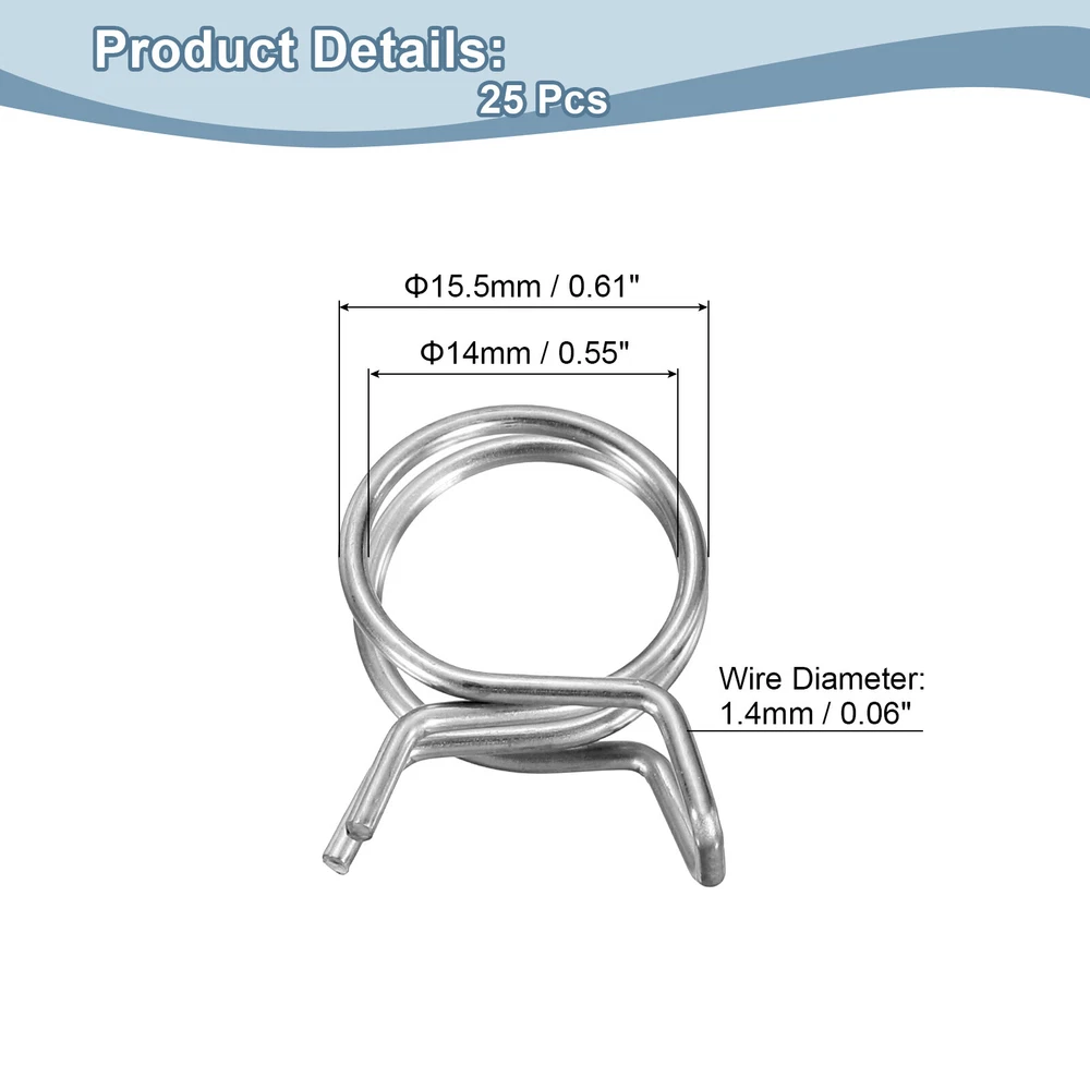 Document Description: Material: Made of stainless steel with a polished surface, these spring hose clamps are corrosion and rust-resistant for long-term use.Design: The spring hose clamps are designed with double-wound wire, which can spread the clamping force around the hose, and is more cost-effective than single-wire clamps.Easy to Use: These spring hose clamps are very easy to use, just use pliers to open the clamp and easily place it on the pipe.Wide Application: Spring hose clamps are widely used in automotive, agricultural, factory, and construction industries. Mainly used for fastening interfaces, they can firmly lock power equipment fuel lines, air hoses, water pipes, silicone hoses, vacuum hoses, automobile fuel lines, motorcycle air pipes, etc.Specification:Material: Stainless SteelFinish: PolishedInner Diameter: 14mm / 0.55inchMaximum Open Inner Diameter: 15.5mm/0.61inchWire Diameter: 1.4mm / 0.06inchPackage Content: 25pcs x Spring Hose Clamp Double Wire Spring Hose Clamp, 50pcs 304 Stainless Steel 10mm Spring Clips USD 11.2 Double Wire Spring Hose Clamp, 20pcs 304 Stainless Steel 6mm Spring Clips USD 7.78 Double Wire Spring Hose Clamp, 20pcs 304 Stainless Steel 5mm Spring Clips USD 7.49 Double Wire Spring Hose Clamp, 20pcs 304 Stainless Steel 3.5mm Spring Clips USD 7.49 Spring Hose Clamp, 50pcs 65Mn Steel 18mm Low Pressure Air Clip, Zinc Plated USD 21.04 Spring Hose Clamp, 10pcs 65Mn Steel 9mm Low Pressure Air Clip, Nickel Plated USD 7.03 25Pcs 14mm/0.55inch Double Wire Spring Hose Clamp Description: Material: Made of stainless steel with a polished surface, these spring hose clamps are corrosion and rust-resistant for long-term use. Design: The spring hose clamps are designed with double-wound wire, which can spread the clamping force around the hose, and is more cost-effective than single-wire clamps. Easy to Use: These spring hose clamps are very easy to use, just use pliers to open the clamp and easily place it on the pipe. Wide Application: Spring hose clamps are widely used in automotive, agricultural, factory, and construction industries. Mainly used for fastening interfaces, they can firmly lock power equipment fuel lines, air hoses, water pipes, silicone hoses, vacuum hoses, automobile fuel lines, motorcycle air pipes, etc. Specification: Material: Stainless Steel Finish: Polished Inner Diameter: 14mm / 0.55inch Maximum Open Inner Diameter: 15.5mm/0.61inch Wire Diameter: 1.4mm / 0.06inch Package Content: 25pcs x Spring Hose Clamp Hot Item Fuel Line Hose Clips, 20pcs 15mm 304 Stainless Steel Tube Spring Clamps(Silver) USD 7.68 Steel Band Clamp 23mm Hose Tube Spring Clips Clamp Black Manganese Steel 20Pcs USD 18.11 Fuel Line Hose Clips, 20pcs 10mm 304 Stainless Steel Tube Spring Clamps(Silver) USD 7.79 Fuel Line Hose Clips, 100pcs 3mm 304 Stainless Steel Tube Spring Clamps(Silver) USD 12.2 Fuel Line Hose Clips, 100pcs 11mm 65Mn Steel Tubing Spring Clamps USD 12.35 Payment We accept eBay payment. Please do not email us to ask for other payment option. We appreciate prompt payment and look forward to your business in the future. Unpaid item will be filed without receiving payment in 7 days from listing ended. Shipping Usually we ship your order out within 24 hours in business day. For shipping and handling charges (S&H) for specific item, please refer to the item listing page for more details. Please make sure your shipping address is correct. We are not responsible for any loss in transit if a wrong address is provided. Return Policy Returns for exchange are permitted and must be initiated by the buyer within 30 days upon receipt. If you would like to return your product(s) for repair / replacement / refund, please kindly contact our customer service representatives via email for an authorized RMA number. Your returned product(s) will not be processed without a completed RMA. About Us We are continually expanding our product selection to better serve your need. We look forward to providing the best sevice to you - our dear customers, so take a look around our store and find the product that you want. You can put your trust in us! If you need any help or have any suggestions, please don't hesititate to contact us anytime , we will reply you within 24 hours and try the best to help you. Description Policy 25Pcs 14mm/0.55inch Double Wire Spring Hose Clamp Description: Material: Made of stainless steel with a polished surface, these spring hose clamps are corrosion and rust-resistant for long-term use. Design: The spring hose clamps are designed with double-wound wire, which can spread the clamping force around the hose, and is more cost-effective than single-wire clamps. Easy to Use: These spring hose clamps are very easy to use, just use pliers to open the clamp and easily place it on the pipe. Wide Application: Spring hose clamps are widely used in automotive, agricultural, factory, and construction industries. Mainly used for fastening interfaces, they can firmly lock power equipment fuel lines, air hoses, water pipes, silicone hoses, vacuum hoses, automobile fuel lines, motorcycle air pipes, etc. Specification: Material: Stainless Steel Finish: Polished Inner Diameter: 14mm / 0.55inch Maximum Open Inner Diameter: 15.5mm/0.61inch Wire Diameter: 1.4mm / 0.06inch Package Content: 25pcs x Spring Hose Clamp Double Wire Spring Hose Clamp, 50pcs 304 Stainless Steel 10mm Spring Clips USD 11.2 Double Wire Spring Hose Clamp, 20pcs 304 Stainless Steel 6mm Spring Clips USD 7.78 Double Wire Spring Hose Clamp, 20pcs 304 Stainless Steel 5mm Spring Clips USD 7.49 Double Wire Spring Hose Clamp, 20pcs 304 Stainless Steel 3.5mm Spring Clips USD 7.49 Spring Hose Clamp, 50pcs 65Mn Steel 18mm Low Pressure Air Clip, Zinc Plated USD 21.04 Spring Hose Clamp, 10pcs 65Mn Steel 9mm Low Pressure Air Clip, Nickel Plated USD 7.03 Hot Item Fuel Line Hose Clips, 20pcs 15mm 304 Stainless Steel Tube Spring Clamps(Silver) USD 7.68 Steel Band Clamp 23mm Hose Tube Spring Clips Clamp Black Manganese Steel 