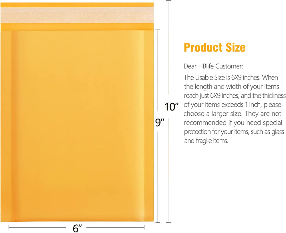 LIGHT WEIGHT MAILERS - This pack of 25 6x10 inch padded envelopes is made from heavy duty plastic, are with fashionable design. CUSHION MAILERS - These mailer envelopes are lined with 80gsm bubble, with unique air cellular layers and 360°strong air bubble technology helping absorb shock during shipment. SELF SEALED ENVELOPES - These bubble mailers come with a self-adhesive tamperproof seal. The adhesive on the fold-over flap is strong enough and goes end-to-end. There's no need reinforcement tape and it doesn't come apart unless you tear it up. Peel and stick lip provides a tamper evident closure. MULTIPURPOSE ENVELOPES - The bubble envelopes feel nice to the touch and are perfect for handwriting, labeling and stamping. These envelopes can be used in offices, at home, in shops, schools and everywhere where there is a need. IDEAL FOR BUSINESS-Our small padded envelopes are sure to set your small business apart from the rest. Build a lasting impression that will keep your customers coming back and save money. Product Description