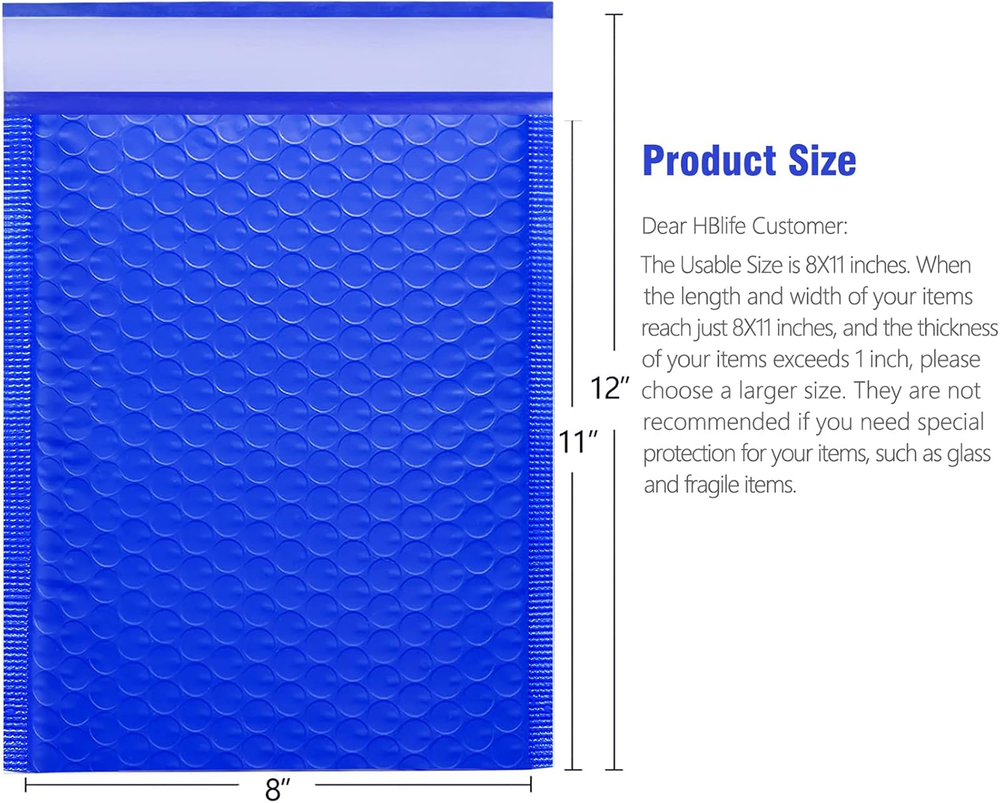 LIGHT WEIGHT MAILERS - This pack of 25 8.5x12 inch padded envelopes is made from heavy duty plastic, are with fashionable design. CUSHION MAILERS - These mailer envelopes are lined with 80gsm bubble, with unique air cellular layers and 360°strong air bubble technology helping absorb shock during shipment. SELF SEALED ENVELOPES - These bubble mailers come with a self-adhesive tamperproof seal. The adhesive on the fold-over flap is strong enough and goes end-to-end. There's no need reinforcement tape and it doesn't come apart unless you tear it up. Peel and stick lip provides a tamper evident closure. MULTIPURPOSE ENVELOPES - The bubble envelopes feel nice to the touch and are perfect for handwriting, labeling and stamping. These envelopes can be used in offices, at home, in shops, schools and everywhere where there is a need. IDEAL FOR BUSINESS-Our small padded envelopes are sure to set your small business apart from the rest. Build a lasting impression that will keep your customers coming back and save money. Product Description