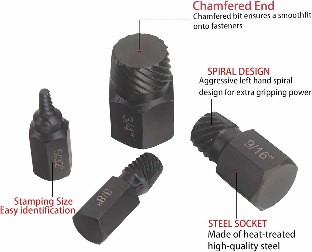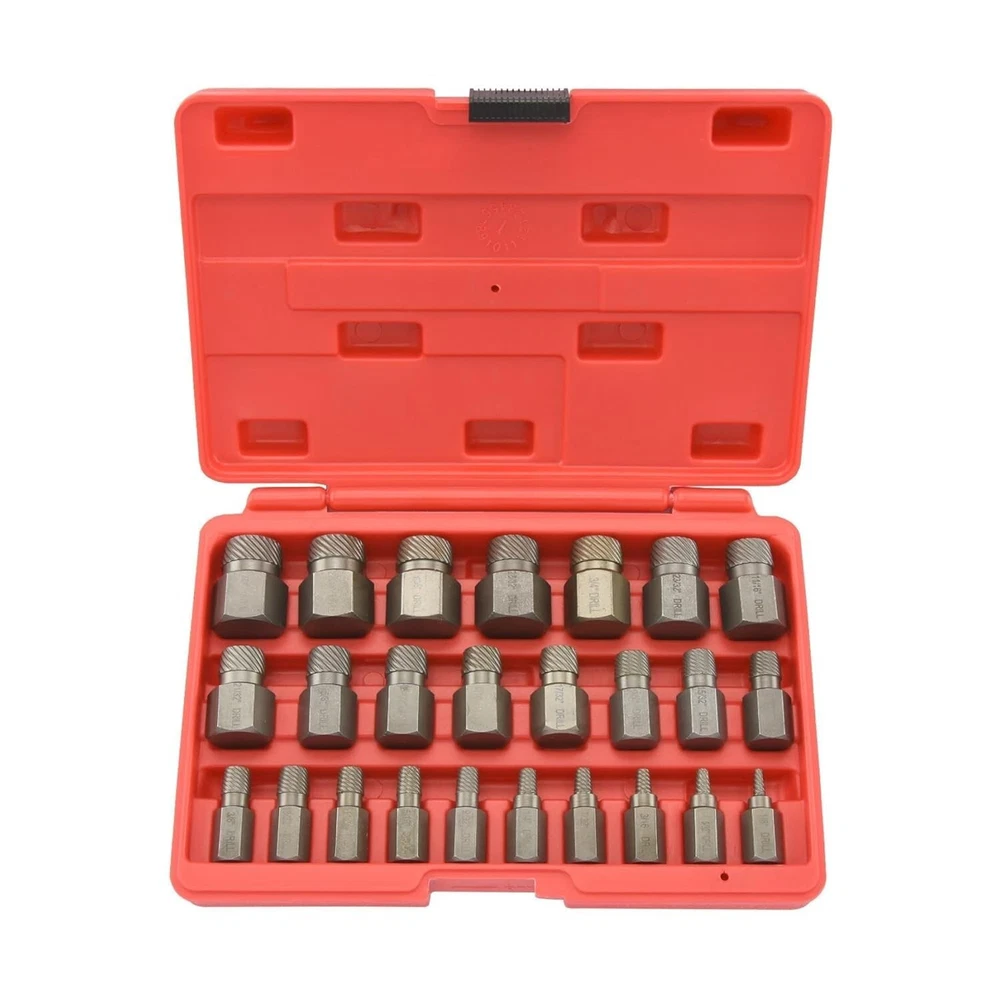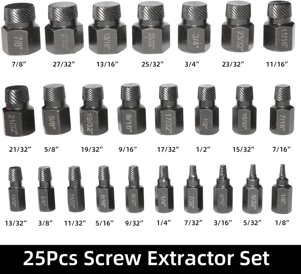 D escriptions: 【PREMIUM GRADE MATERIAL】 This is a professional damaged bolt screw extractor kit made of high-quality high-hardness chrome-molybdenum steel, durable and not easily damaged. Each surface is precision machined and resistant to corrosion. 【HEXAGON HEAD DESIGN】 RIMKOLO easy out screw extractor set that features unique hex head multi-spline design provides maximum torque with wrenches and sockets. Internal left-handed spiral design for extra grip and faster tapping. 【HIGH-VISIBILITY SIZE】 High-visibility laser-etched size is engraved on each easy out bolt extractor for quick selection and easy identification. Whether it's for mechanical maintenance or daily use, it can provide you with great convenience. 【MULTI-APPLICATION】 The screw extractor set can be used to remove broken studs, bolts, hexagon socket screws and fittings, or it can be used with a hexagonal drill bit for a wider range of applications. Suitable for the installation and repair of automobile, machinery, equipment and other products. 【25-PIECE BOLT EXTRACTOR】 The broken screw remover comes with a heavy-duty carrying case, lets all the multi-spline screw extractors stay organized. It contains 7/8", 27/32", 13/16", 25/32", 3/4", 23/32", 11/16", 21/32", 5/8", 19/32", 9/16", 17/32", 1/2", 15/32",7/16", 13/32", 3/8", 11/32", 5/16", 9/32", 1/4", 7/32", 3/16", 5/32", 1/8", meets all your needs. Specification : Material:40CR-V steel Color: Black Weight:1830g Case Size:210*150*47mm Package List: 25PCS * Screw Extractor