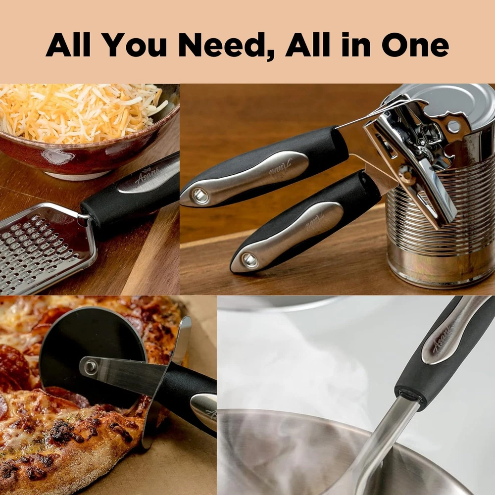 DESIGNED FOR DURABILITY: Upgrade your kitchen with a cooking utensils set crafted to last. Unlike other sets that quickly corrode or bend as you cook or serve, we’ve used high-quality 430 stainless steel that provides superior rust-resistance and sturdiness to suit any dish. HANDLE ANY TASK: This complete 25-piece kitchen utensil set includes a solid turner, slotted turner, solid spoon, slotted spoon, spoon ladle, potato masher, whisk, spatula, tongs, cheese grater, pizza cutter, peeler, can opener, ice cream spoon, wine opener and measuring spoons. CLEANING MADE SIMPLE: The beauty of a durable stainless steel kitchen tool set like this one? The ability to conveniently clean it in the dishwasher (top rack recommended). These kitchen accessories are also non-stick to make clean-up easier and faster. AESTHETICS YOU’LL LOVE: With a clash of sleek stainless steel and contemporary black accents, these cooking essentials add a sophisticated flair to your home or apartment. This kitchen starter set makes a great housewarming or host gift and also a great holiday present for just about anyone. LIFETIME WARRANTY: We’ve backed our kitchenware kit with an iron-clad lifetime warranty to give you total peace of mind and the best bang for your buck. Go ahead, get durable kitchen items that inject sleek style into your space completely risk-free!