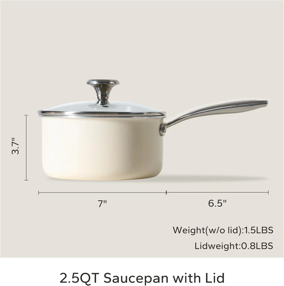 2.5QT SAUCE PAN:This 7"cooking pot perfect for 1-2 servings of sauces, soups, pasta, or oatmeal. Space-saving design fits all stovetops and stores easily in small kitchens CERAMIC NONSTICK COATING (PFAS/PFOA-FREE):Healthy cooking with minimal oil. Scratch-resistant ceramic surface ensures easy cleanup and long-lasting performance. Enjoy worry-free cooking with ceramic pot's toxin-free coating OVEN & DISHWASHER SAFE UP TO 842°F:Stainless steel handles stay cool on all stovetops and withstand high oven heat, transforming these pots into versatile oven-to-table cookware. Dishwasher-safe for quick cleanup after cooking EVEN-HEAT BASE FOR PRECISION COOKING:Thickened aluminum core prevents warping and distributes heat evenly, ideal for simmering sauces or melting cheese without burning SHATTER-PROOF GLASS LID:Vented design reduces boil-overs while monitoring cooking progress. Glass lid locks in moisture for tender results Product Description Redchef Capacity Optional Meet all your needs. Food slides off the surface effortlessly, reducing the need for excessive oil or butter, and making cooking and flipping food more convenient. It's time to throw away all your PTFE toxic nonstick cookware! Ceramic Pot for Cooking Easy to Clean & Dishwasher Safe The smooth and non-porous surface of our ceramic coating (inside and outside) makes it easy to clean. Food residue and stains can be easily wiped off with a gentle scrub or a soft sponge, requiring minimal effort and saving you time in the kitchen. Long Lasting Ceramic Coating Nonstick Pro. Allow for rapid heat transfer and long-time use, saves energy and time, satisfying cookware like induction, gas, ceramic, electric, halogen & solid fuel cookers, even suitable for Oven. 1 Oven Safe 2 Dishwasher Safe 3 Induction Safe Ensuring a safe and healthy cooking experience. 1 Ceramic Coating 2 Stainless Steel Handle 3 Glass Lid 5 Flat Alloy Base Redchef Nonstick Ceramic Cooking Pan Add to Cart Add to Cart Add to Cart Add to Cart Add to Cart Add to Cart Customer Reviews 4.8 out of 5 stars 28 4.8 out of 5 stars 28 4.8 out of 5 stars 28 4.8 out of 5 stars 28 4.6 out of 5 stars 68 4.3 out of 5 stars 1,065 4.5 out of 5 stars 58 Price $49.99 $ 49 . 99 $59.99 $ 59 . 99 $49.99 $ 49 . 99 $59.99 $ 59 . 99 — $79.99 $ 79 . 99 $149.99 $ 149 . 99 Size 2.5QT 3.5QT 2.5QT 3.5QT 11" 8"+9.5"+11" 14 PCS Color Beige Beige Blue Beige Beige Beige Beige Material Aluminum,Stainless Steel Aluminum,Stainless Steel Aluminum,Stainless Steel Aluminum,Stainless Steel Aluminum,Stainless Steel Aluminum,Stainless Steel Aluminum,Stainless Steel Coating Ceramic Coating Ceramic Coating Ceramic Coating Ceramic Coating Ceramic Coating Ceramic Coating Ceramic Coating PFAS & PTFE PFOA Free ✔ ✔ ✔ ✔ ✔ ✔ ✔ Long-Lasting Non-stick ✔ ✔ ✔ ✔ ✔ ✔ ✔ NO TOXIC ✔ ✔ ✔ ✔ ✔ ✔ ✔ Induction Safe ✔ ✔ ✔ ✔ ✔ ✔ ✔ Dishwasher Safe ✔ ✔ ✔ ✔ ✔ ✔ ✔ Oven Safe ✔ ✔ ✔ ✔ ✔ ✔ ✔