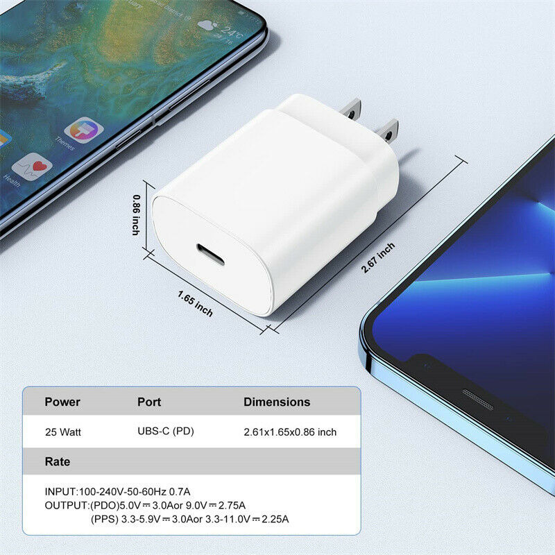 Specification : - Type: 25W PD3.0 fast charge charger - Input voltage: AC 100-240V 50-60Hz - Output power: 25W - Work efficiency: 85% - Working temperature: 0-50℃ - Output voltage: PDO 9V, PPS 3.3-5.9V or 3.3-11.0V - Output current: PDO 2.77A(9V) , PPS 3.0A(3.3-5.9V) or 2.25A(3.3-11.0V) - Output protection: short circuit protection, overvoltage protection, overcharge protection, overheat protection - Applicable products: smart phones, tablet computers, digital electronics and other equipment. Features: 100% Brand New and High Quality! UPDATED FAST CHARGER: # 25W PD3.0: Equipped with USB-C PD 3.0 charging port, Supports 25W output. SAFE AND RELIABLE : Overcharge Protection,Over-voltage,Over-temperature,Short Circuit,Over-current,Over-voltage Protection. Smart IC Chip automatically detects and delivers the optimal charging power for connected devices, to guarantee fast charging. GREAT COMPATIBILITY : Compatible with all USB C powered devices such as MacBook/Pro/Air/iPad Pro 2018, And iPhone 12 Mini,12,12 Pro,12 Pro Max,Xs, Xs Max, XR, X, 8, 7, 6 Plus cables.