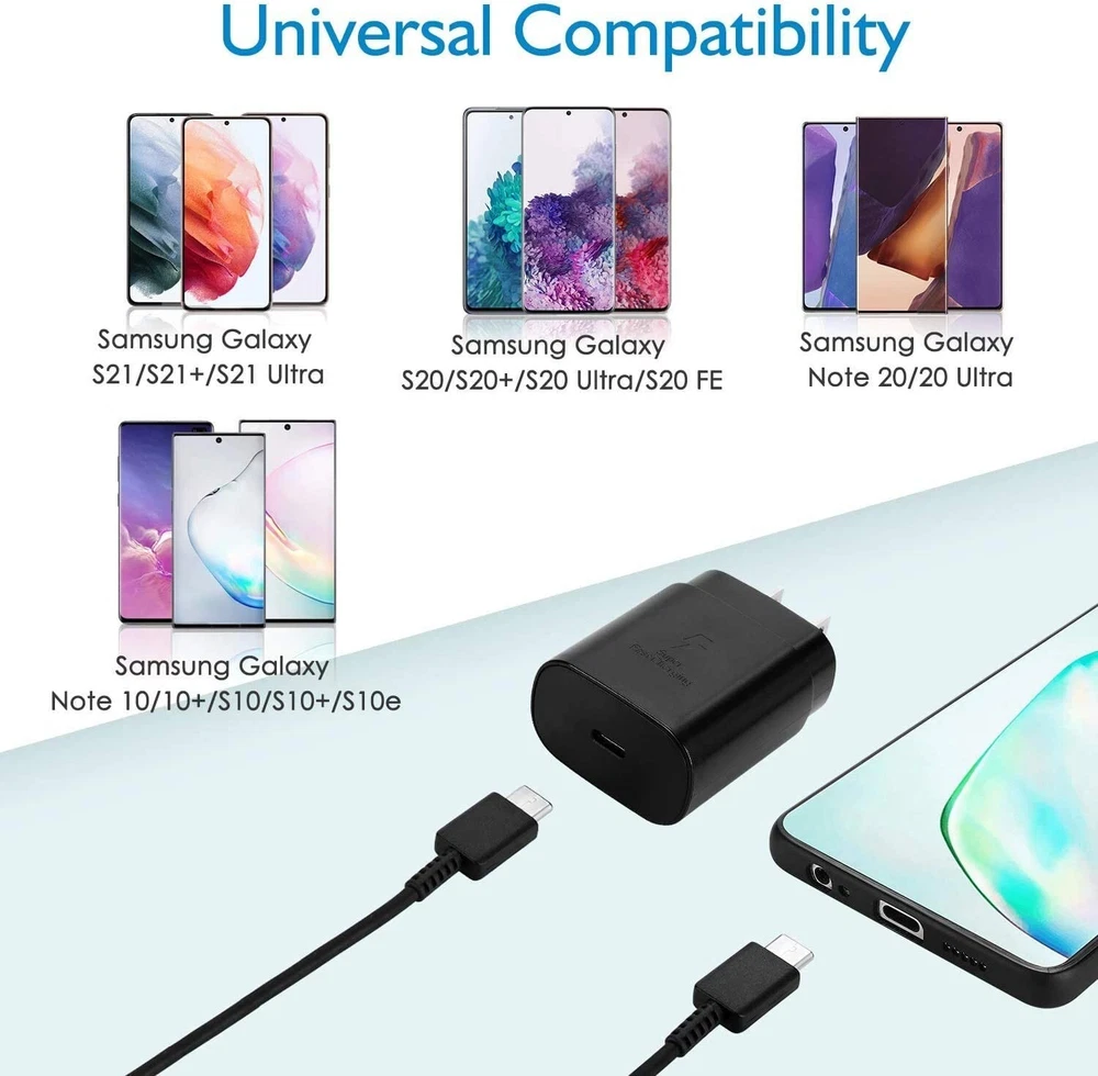 Compatible Brand: Universal, For Samsung Mounting Location: Wall Items Included: Wall Charger Cable Length: 6 ft Brand: Unbranded Number of Ports: 1 Compatible Model: For LG Stylo 4, For LG Stylo 5, For LG Stylo 6, For Samsung Galaxy Note 8, For Samsung Galaxy Note 9, For Samsung Galaxy Note10, For Samsung Galaxy Note10 5G, For Samsung Galaxy Note10+, For Samsung Galaxy Note10+ 5G, For Samsung Galaxy Note8, For Samsung Galaxy Note9, For Samsung Galaxy S10, For Samsung Galaxy S10+, For Samsung Galaxy S10e, For Samsung Galaxy S20, For Samsung Galaxy S20 5G, For Samsung Galaxy S20 Ultra 5G, For Samsung Galaxy S20+, For Samsung Galaxy S20+ 5G, For Samsung Galaxy S21, For Samsung Galaxy S21 5G, For Samsung Galaxy S21 Ultra 5G, For Samsung Galaxy S21+ 5G, For Samsung Galaxy S22+, For Samsung Galaxy S8, For Samsung Galaxy S8 Active, For Samsung Galaxy S8+, For Samsung Galaxy S9, For Samsung Galaxy S9+, Samsung Galaxy S20 FE Material: Plastic Color: Black Features: Fast Charge, Adaptive Fast Charging, Super Fast Charge Type: Wall Charger Connectivity: USB-C, USB-C to USB-C