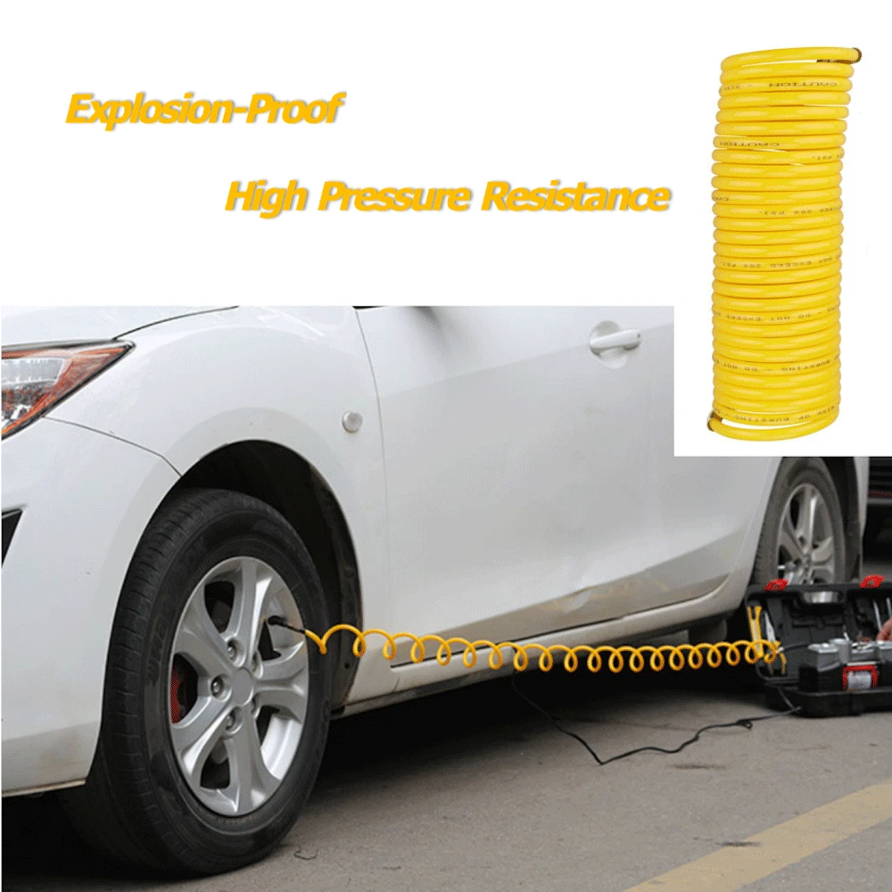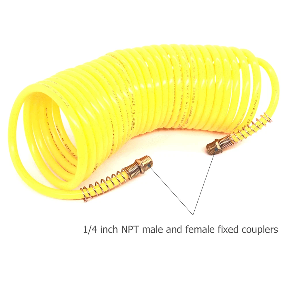 Recoil Air Hose Length: 7.5M / 25 Feet Color: Yellow Connector Size: 1/4 Inch PSI: Max 200PSI Product Feature: 1. 100% New PE Material 2. Thick PE tube, explosion- proof and high pressure resistance, max 200PSI. 3. High powerful elastic force with superior thick spring. 4. 1/4 inch NPT male and female fixed couplers. 5. Curved PE tube design, pull-resistance and fast to get curved after use.