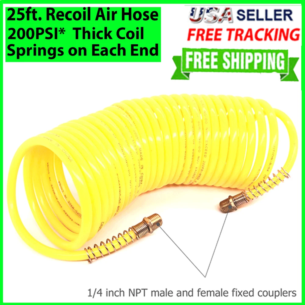 25ft 1/4" Recoil Air Hose Re Coil Spring Ends Pneumatic Compressor Tools 200PSI