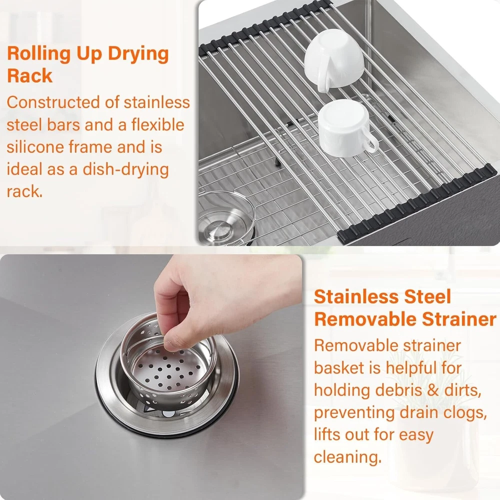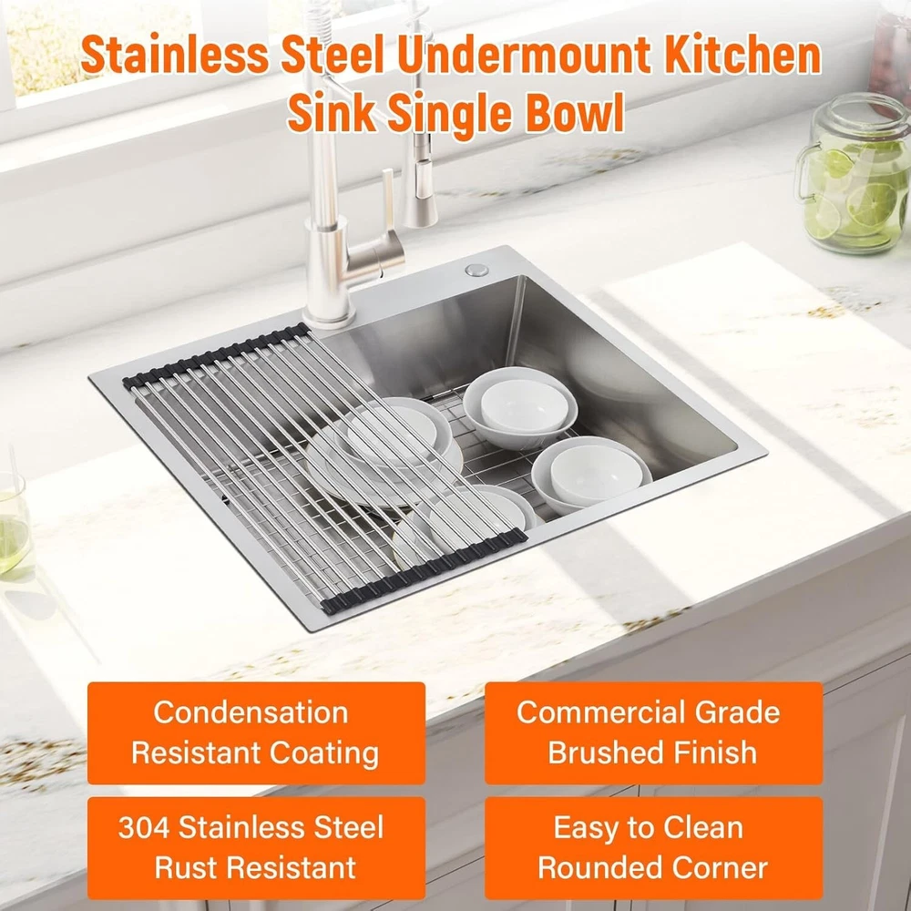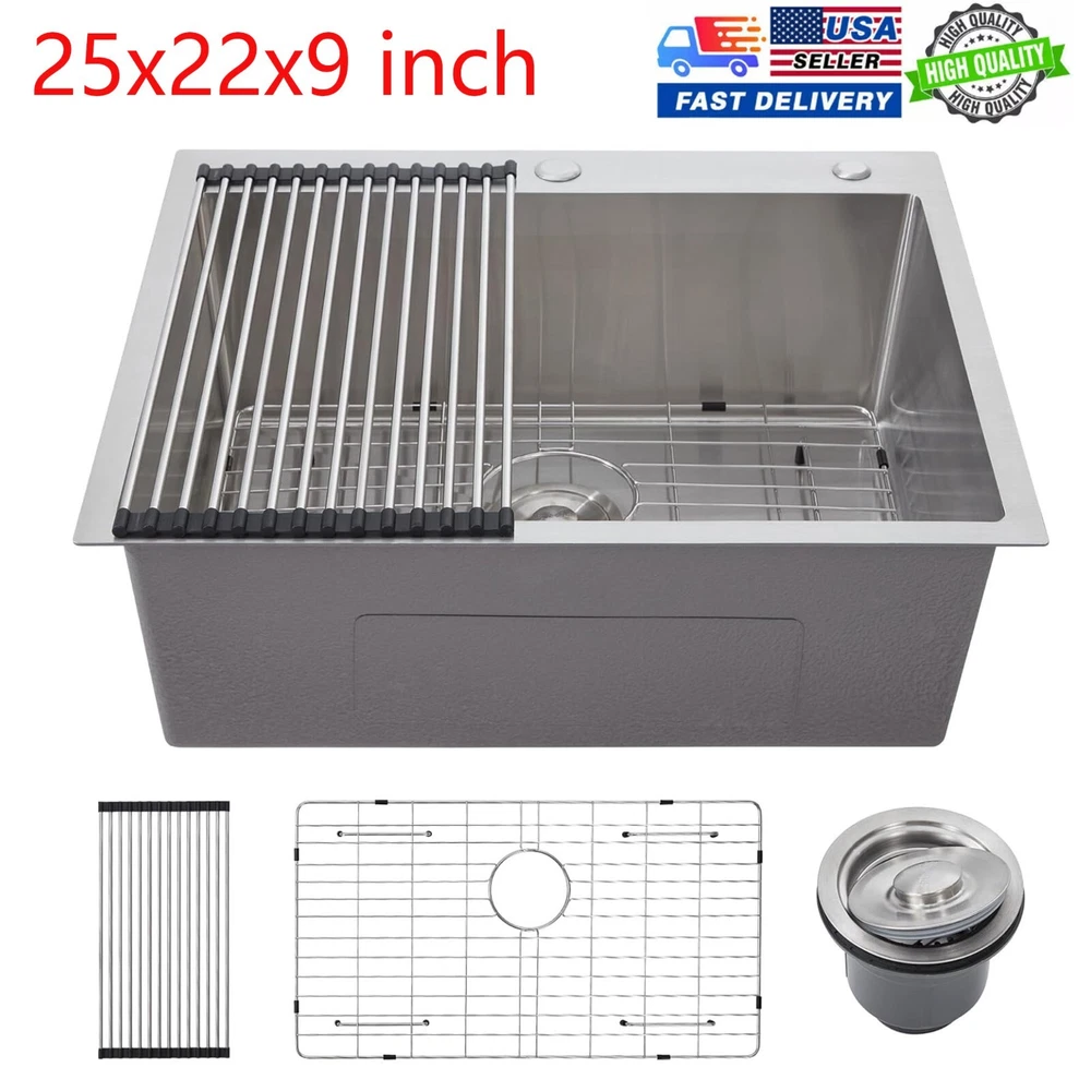 Description: 1. Material : This kitchen sink is made from high-quality 304 stainless steel, offering strength, durability, rust resistance, and easy cleaning. It features an upgraded thickness of 3mm, making it 50% thicker than most standard kitchen sinks. 2. Design: This household dishwasher sink operates quietly, thanks to thicker and softer rubber noise reduction pads. It features an X-shape flow line to prevent clogging and R10° rounded corners for easy cleaning and a modern appearance. 3. Function: Exterior dimensions are 25" x 22" with a bowl depth of 9". This stainless steel drop-in sink is deep enough to accommodate large pots, pans, and cookie sheets, while also concealing dirty dishes waiting to be loaded into the dishwasher. 4. Tip: The package includes a drop-in kitchen sink, a roll-up rack, a bottom grid, a drain assembly, mounting clips, and manual. 5. Occasion: The sink is compatible with any countertop material and can be easily installed and removed without causing damage to the countertops. Package Include: 1x Drop In Kitchen Sink