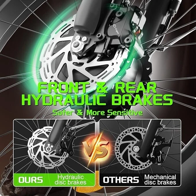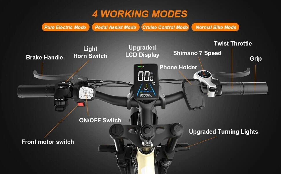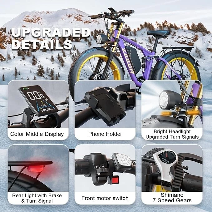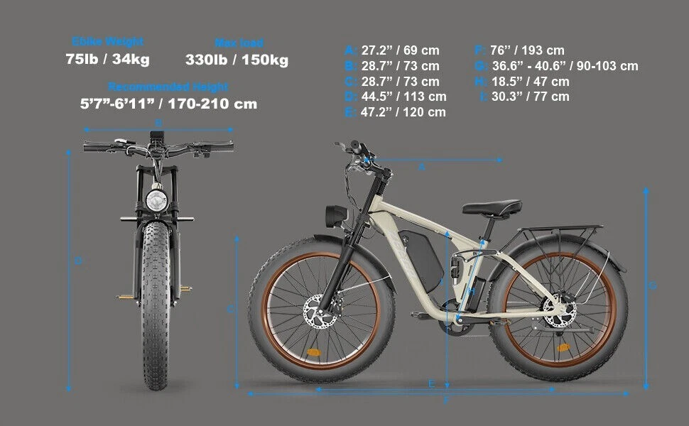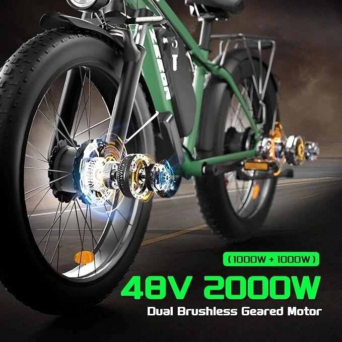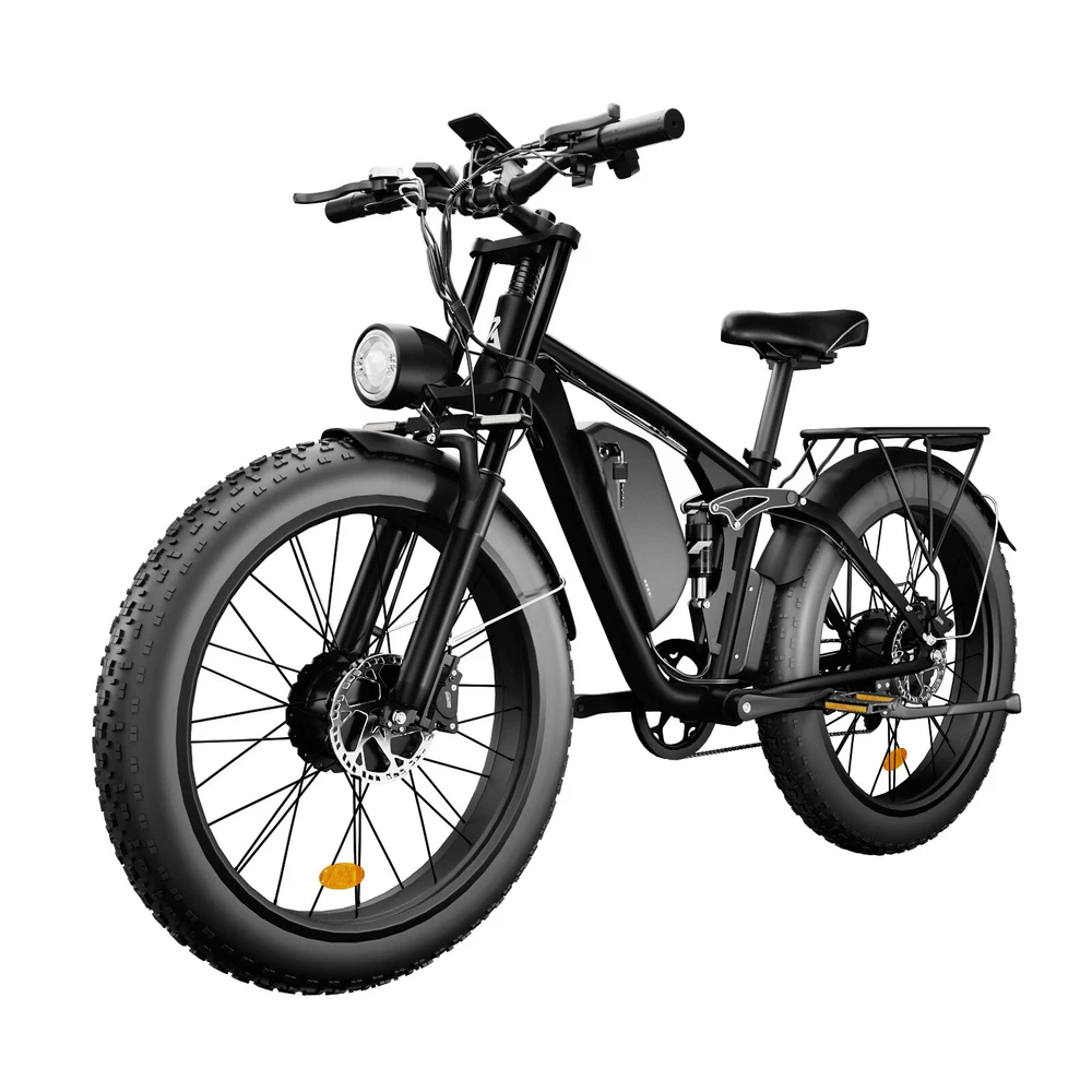 V1 / S1 Full Suspension Description 【Dual Motor Electric Bikes for Adults】 TWO upgraded 48V/52V 1000W high speed Front & Rear brushless motors provide electric bicycles with stronger power and climbing ability, helps to reach the top speed of 35MPH with ease. Removable large capacity 48V/52V 22.4Ah battery offers a long riding range up to 40-60 miles in pedal assist mode. It takes only 5-8 hours to fully charge the battery 【Big Capacity Lithium Battery Ebike】 Large capacity 48V/52V 22.4Ah battery offers ebikes long riding range of 40-60 miles,the waterproof battery of ebike is not only large capacity and long lasting, but it's also removable, convenient to take home or office for charging.Upgraded 54.6V 3A charger completes charging quickly in 5-8 hours 【Full Suspension 26" Fat Tire Electric Bike】 Equipped with a dual-crown front suspension fork and rear shock absorber , which greatly reduces bumps during riding. 26" x 4" fat tires also provide good grip and excellent shock absorption. This full suspension ebike offers a more comfortable riding experience in the snow, beach, mountain, city roads, helps you conquer most road conditions 【Hydraulic Disc Brakes & Shimano 7 Speed Gears】 The ebikes for adults adopt front and rear hydraulic disc brakes, which provides more effective braking in rainy weather, heavy off-road, long downhill and adverse conditions. The bike frame is made of high quality 6061 aluminum alloy, more lightweight and durable. Equipped with professional Shimano 7 speed gears, more accurate and stable 【 5 Riding Modes 】 Enjoy versatile riding with 5 modes: dual motor electric, single motor electric, pedal assist, cruise, and bike mode. With 5 levels of assist, the bike can reach speeds up to 35 mph, depending on battery charge, load, and road conditions. Choose from speeds of 12, 18, 24, 29, or 35 mph.Whether cruising or conquering tough terrain, ride faster, farther, and freer. Don’t just ride—feel the power beneath you! 【Upgraded Lights for Night Riding】 The color LCD display keeps track of real-time speed, battery level, pedal assist level and mileage. This electric bicycle comes with an upgraded bright headlight & turn signals & rear brake light, making you visible and safe at night 【Easy to Assemble】 This e-bike comes 85% pre-assembled. 【1-year warranty】If there is any problem, pls contact us, we’ll reply your message within 24 hours. Pls keep the original bike box for 30 days for possible return Specification Motor 48V/52V 1000W Front & Rear brushless motors Battery 48V/52V 22.4AH lithium-ion battery Display Multifunctional color LCD Display Frame 6061 aluminum alloy Transmission Shimano 7 speed Full Suspension Suspension fork & rear suspension Brake Hydraulic disc brakes Throttle Twist throttle Light Front light & rear brake light & turn signals Tire 26" * 4.0" fat tires 4 Modes Pure electric, pedal-assist, cruise mode, normal bike mode Max Load 330lb (150kg) Range (PAS mode) 40-60 miles (65-95km) Max Speed 35MPH (56KM/H) Charging Time 5-8 hours Bike Size 76.0"*28.7"*44.5" (193*73*113CM) Package Size 58.3"*12.6"*31.5" (148*32*80CM) Bike Weight 75 lbs (34 kg) Package Weight 97 lbs (44 kg) F1 Description 【Dual Powerful 1000W Motors】 The electric bike is equipped with high-speed front & rear 1000w motors, top speed is up to 35MPH . It has stronger hill-climbing performance and offers more power for daily commuting and long travel. You can get excellent riding experience in the snow, beach, mountain, city road, and conquer most road conditions 【Large Capacity Battery 】 With a removable 48V 22.4Ah battery, this fat tire electric bike supports a longer range up to 40-60 miles in pedal assist mode. Your adventures and daily commutes will become wilder and more cost-effective. Upgraded 54.6V 3A charger completes charging quickly in 5-8 hours 【Hydraulic Disc Brakes & Suspension Fork】 The hydraulic disc brakes enable the ebike to brake more quickly and smoothly when riding at high speed, shortening the braking distance even on a wet road. The lockable suspension fork helps you pass rough terrain with less effort. The 26" x 4" fat tires provide good grip and excellent shock absorption for greater durability 【Excellent Riding Performance】 Electric mountain bike frame is made of high quality 6061 aluminum alloy, more sturdy and durable. Equipped with professional 7 speed gears, more accurate and stable. Upgraded headlight, turn signals and rear brake light, intelligent LCD display, this electric bicycle will be a better choice for long time travel and night riding 【4 Working Modes】 Pure electric mode, pedal-assist mode (5 levels), cuise mode, normal bike mode. This adult electric bike can meet your daily commuting needs and outdoor needs, either it is to explore new trails outdoors, get in some exercise, or rush into work 【Professional Customer Service】 1-year warranty. If there is any problem, pls contact us, we’ll reply your message within 24 hours. Pls keep the original bike box for 30 days for possible return Specification Motor 1000W dual motors,brushless front & rear motors Battery 48V 22.4AH lithium-ion battery Display Multifunctional color LCD Display Frame 6061 aluminum alloy Transmission Shimano 7 speed Fork Suspension fork Brake Hydraulic disc brakes Charger 54.6V 3A US Standard Throttle Twist throttle Light Front light & rear brake light & turn signals Tire 26" * 4.0" fat tires 4 Working Modes Pure electric, pedal-assist (5 levels), cuise mode, normal bike mode Max Load 330lb (150kg) Range (PAS mode) 40-60 miles (65-95km) Max Speed 35MPH (56KM/H) Charging Time 5-8 hours Bike Size 76.0"*28.7"*44.1" (193*73*112CM) Package Size 58.3"*11.4"*30.3" (148*29*77CM) Bike Weight 73 lbs (33 kg) Package Weight 93 lbs (42 kg) The item is UL 2849 certified with a link to the UL Product iQ < https://productiq.ulprospector.com/en >