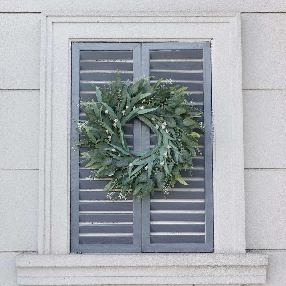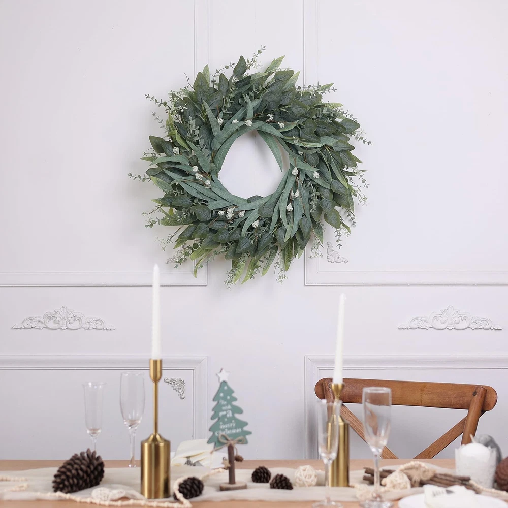 26'' Eucalyptus Wreath for Front Door 【Lifelike wreath】 : This eucalyptus wreath is made of 3 different shapes of high-quality eucalyptus leaves and is also embellished with white eucalyptus fruit and seeds, which makes it look more vibrant and lifelike. 【Quality materials】 : Eucalyptus leaves are made of high-quality silk and plastic, berries are made of high-quality plastic, durable, wind and water resistant and will not fade, suitable for indoor and outdoor decoration. 【Perfect size】 : At 24-26 inches in diameter and up to 26 inches when fully unfolded, this large, vibrant wreath is ideal for most home doors and Windows. 【Versatile】 : The front door wreath can be used for all seasons, whether it is in the hallway, window, fireplace, living room, kitchen, farmhouse, etc., it can effortlessly decorate your home. Perfect for weddings, birthday parties, Easter, Valentine's Day, Mother's Day, Thanksgiving and other holiday decorations. This green wreath will bring a pleasant atmosphere all year round. 【Tips】 : In order to prevent damage during transportation, the wreath is tightly packed in the carton, you only need to easily adjust the stem of the eucalyptus leaf to unfold, to obtain the best appearance, achieve the perfect display.