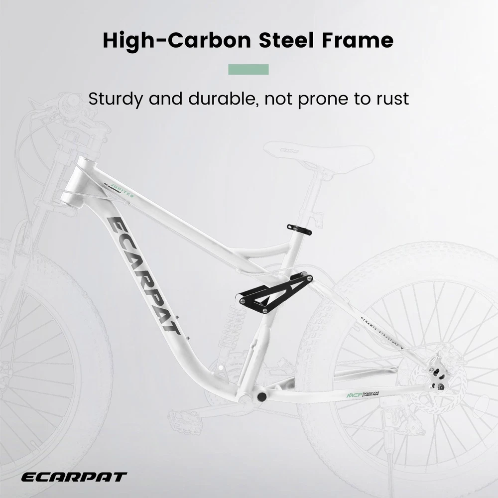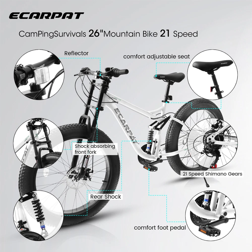 【High Tech Frame】Steel soft tail frame has better strength, stability and toughness, which can better absorb vibration. Compared with aluminum frame, rider is not easy to feel fatigued during riding,enjoys the adventure on mountain roads, forest paths and highways. 【Full Suspension】Full suspension bike has better shock absorption,adapt to more terrains,giving you a more comfortable ride on rough roads and provide a durable riding experience.In addition,Soft tail ensures that the tires are fully gripped to maintain control on descents. 【Professional Drive Train】SHIMANO twist grip shifter is precise and simple to control, a wide range of gears gives you more control for climbing and room to get low on descents, corners and jumps.Internal shift and brake cable make cables last longer by protecting them. 【4 INCH FAT TIRE】Width up to 4 inches, 5 times more wear resistance than ordinary bicycle tires. Strong grip and anti-skid, fully able to challenge any terrain, conquer any off-road trails and urban roads. 【85% assembled】Arrives 85% assembled, all you need to do is install the front wheel, handlebars, saddle and pedals and you're ready to enjoy the ride. We will also provide instructions and an installation video.