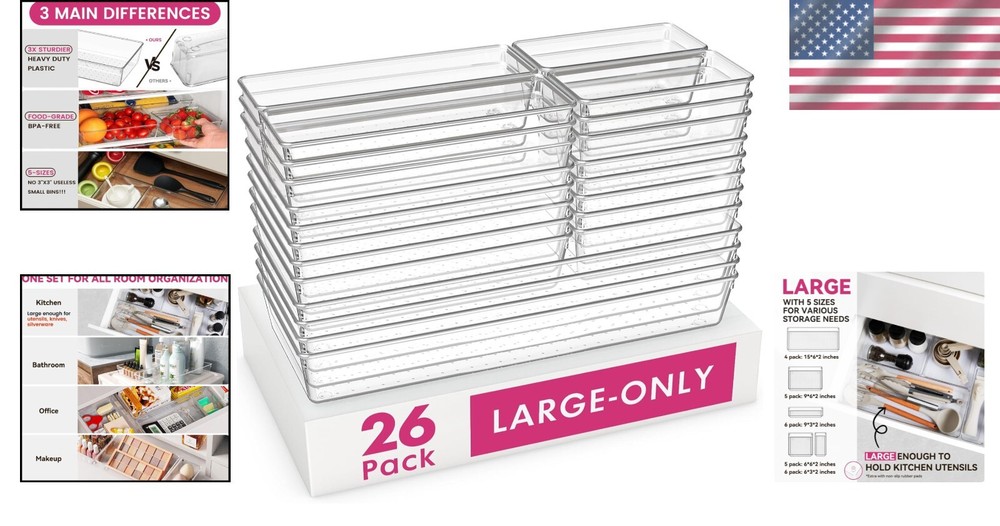 26 Pack Large Clear Plastic Bins - Heavy-Duty Storage for Versatile Organization ‹ › ‹ › ‹ › ‹ › ‹ › ‹ › ‹ › ‹ › ‹ › 26 Pack Large Clear Plastic Bins - Heavy-Duty Storage for Versatile Organization - BPA-Free & 26 Pack All Large-Size Organizers to hold all your items in drawers Features: Larger sizes with 5 different dimensions to accommodate a variety of items. Includes: 4 pack large trays (15x6x2 inches), 5 pack (9x6x2 inches), 5 pack (6x6x2 inches), 6 pack (6x3x2 inches), 6 pack (9x3x2 inches) . Crafted from premium PET plastic for food-grade quality that is crack and scratch-resistant. No unpleasant odors, making these organizers perfect for food storage as well. 2 inches in height to fit seamlessly into any drawer, be it in the kitchen, bathroom, office or craft room. Stackable design with wider bases for optimized storage utilization. Includes silicone non-slip pads for stability when drawers are opened or closed. Benefits: Robust construction ensures long-term usage and durability. Versatile usages from organizing cosmetics, utensils, office supplies to craft materials. Effortlessly maintain cleanliness with easy wipe-down care. Stackable features enhance space efficiency, allowing a tidy and uncluttered environment. Rest assured with quality assurance – a replacement set provided if standards are not met. Why choose our 26 Pack Large Clear Plastic Bins? A clutter-free space is just a choice away! Our 26 Pack Large Clear Plastic Bins are the epitome of organization – designed with keen attention to detail and functionality. Made from premium PET plastic, these bins are perfect for organizing everything from kitchen utensils to office supplies. Their multi-use capabilities and stackable nature ensure a maximum utility of your storage spaces. Choose our bins for a refined and systematic approach to organization, while transforming any cluttered drawer or space into a harmonious sanctuary of order. Experience the difference today with our reliable and stylish storage solution! Shipping Free & Fast Shipping - We offer free shipping to most of the USA with a normal delivery time of 3-7 days. However, due to the current situation, additional delivery time (up to 3 weeks) may be required for some items. Alternative Carriers - We may use alternative carriers (e.g. USPS, FedEx, UPS, etc.) to ensure your package arrives safely and on time. Due to the use of multiple carriers, we are unable to provide a tracking number automatically. Handling Time - Orders are processed and shipped within 1-2 business days of receiving cleared payment. Shipping Restrictions - Shipping to Alaska, Hawaii, Puerto Rico, Guam, and other US territories may incur shipping charges or delivery restrictions. Please contact us before ordering, or your order can be refunded/cancelled. State Restrictions - There may be restrictions based on your state of purchase. For example, certain items may not be shipped to California due to state regulations. Contact for Tracking Updates - If you require tracking updates or have any concerns about the delivery of your order, please feel free to contact us, and we will be happy to assist you. Return Please see our eBay Return Policy. Thank you. Payment We accept all major credit cards, PayPal, and Apple Pay for your convenience. Your payment information is secure and encrypted to ensure a safe and seamless transaction. Please complete your payment within 3 days of purchase to avoid any delays in shipping. Feedback Your feedback is extremely important to us. We strive to provide the best products and customer service possible. If you are satisfied with your purchase, please take a moment to leave us a positive review. If you have any concerns or issues with your order, please contact us before leaving negative feedback. We are committed to resolving any problems and ensuring your satisfaction. Contact Us If you have any questions or concerns, please feel free to reach out to our customer support team. You can contact us through the eBay messaging system. We are available Monday to Friday, 9:00 am to 5:00 pm EST, and we will do our best to respond to your inquiry within 24 hours. Thank you for supporting our small family business! UPC: Not Set Unit Quantity: 26 Material: Plastic,PET plastic Features: Stackable,Crack Resistant,BPA-Free,Lightweight,Scratchproof Mounting: Free Standing Brand: Unbranded Item Height: Drawer Organizer Bins Item Length: Drawer Organizer Bins Item Width: Drawer Organizer Bins Type: Storage Basket Capacity: 81 - 120 Quarts Item Depth: 2 in Item Weight: Less Than 2 lb MPN: Not Set Model: Not Set Number of Items in Set: Twenty-Six Piece Color: Clear Number in Pack: 26 Shape: Rectangular Number of Compartments: Multiple Sections Pattern: Not Set Finish: Glossy Style: Modern Country/Region of Manufacture: Not Set Original/Reproduction: Not Set Unit Type: Unit Assembly Required: Not Set