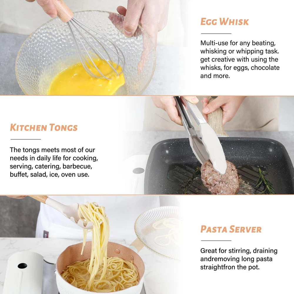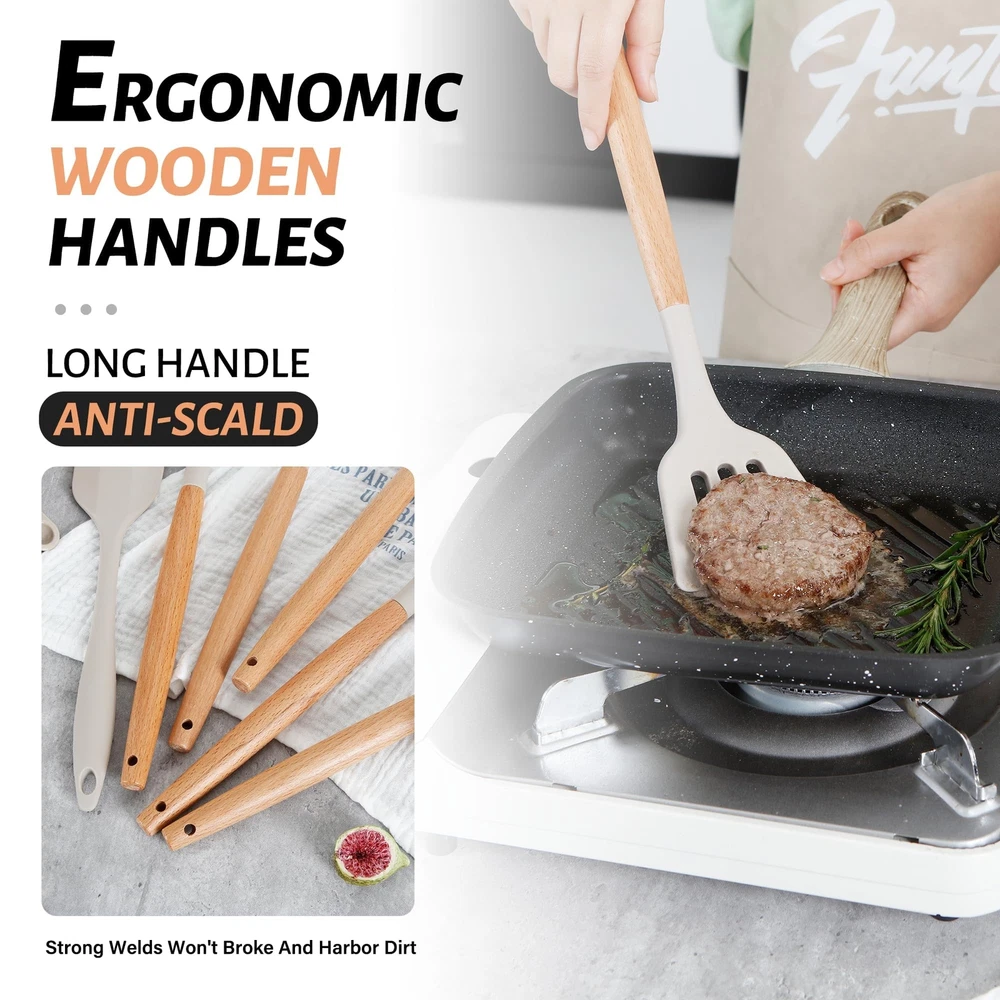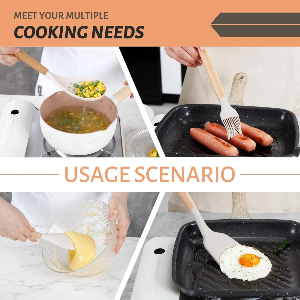 26 PCS KITCHEN UTENSILS SET: We have carefully considered most of the scenarios in which kitchens are used and have handpicked 26 different kitchen cooking utensils set to meet all your cooking needs to cook the perfect dish. Kitchen tongs and spatula set, measuring cups and spoons set, pasta server, solid and slotted turners, skimmer, basting brush, utensil holder, etc. Each piece of silicone utensils for cooking is upgraded to a large size with a perfectly balanced weight and elegant design FOOD GRADE SILICONE COOKING UTENSILS SET: The cooking utensils set is made entirely of odorless food-grade silicone, which is BPA-free and has good scratch resistance to protect the non-stick coating on the cookware and ensure that the cookware surface is not scratched or dented. The silicone kitchen utensils does not react with food or beverages and will not retain odors or colors, you don’t have to worry about the health of your families. And the upgraded silicone thickness for better quality and durability DURABLE & HEAT-RESISTANCE: The kitchen utensils features durable silicone utensil head and ergonomic wooden handle that offer a comfortable grip and heat resistant. This design feature makes cooking more enjoyable and less strenuous on the hands, especially during longer meal preparations. And the silicone kitchen utensils can withstand temperatures up to 446°F/230°C, and they won't melt when stirring food directly in the pan EASY TO CLEAN AND STORE: The higher and stronger welded joints between the silicone cooking utensils and wooden handles eliminate any gaps where food can get trapped, making cleaning a breeze. Simply rinse gently with water. Due to the wooden handle, we don't recommend soaking in water for a long time or dishwasher cleaning. The kitchen cooking utensils set feature hanging holes on the handles to let you hang these to store them without taking much space. The cooking utensils set also come with a holder for storage GREAT KITCHEN TOOLS: Each piece of kitchen utensils offers a perfectly balanced weight and elegant design that will enhance your kitchen decor. From baking and frying to sautéing and grilling, these cooking utensils have proven their worth in various culinary endeavors. The exquisite packaging and reasonable price make it the ideal housewarming gifts wedding gifts, birthday gifts, Christmas gifts, etc. If you have any questions during the purchase or use, please feel free to contact us, we will be happy to help you