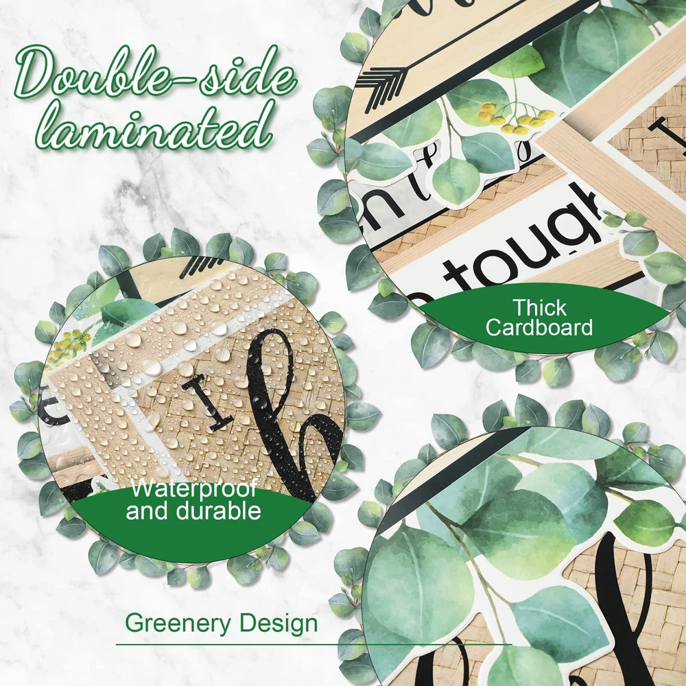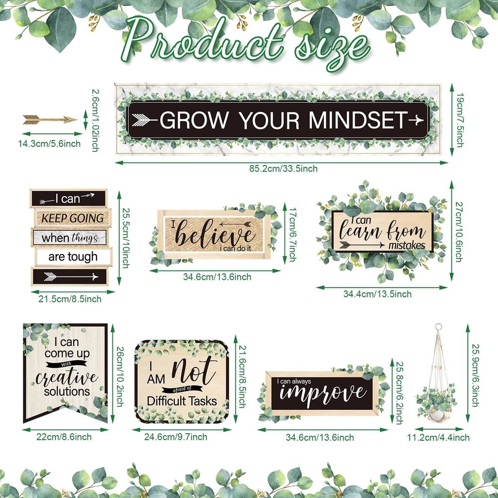 Feature:Interesting and eye catching:The grow your mindset mini bulletin boards are designed with colorful words and pictures, come with eucalyptus adorable design, very interesting and bright, the text can help to enhance the learning experience.Wide applications:These positive wall art prints are suitable for wall decorations, party pendants and photo props, pasting to anywhere you like to decorate your room, bring color and life into your room.Specifications:Material: 250 gsm cardstockSize: as pictures shownPackage includes :4 x Adhesive dots26 x Growth mindset postersWarm notes:Please allow slight size errors due to manual measurement.The colors may be slightly different from pictures due to different screens. Package Includes: 26 pieces different growth mindset posters with 4 pieces glue points dots, includes one 'GROW YOUR MINDSET'; The growth mindset poster for classroom is a great way to remind them to put kids mindsets in check every once in a while Eucalyptus Style Design: these motivational bulletin board sets decorations are designed with eucalyptus, colorful and very novel, these pictures help children increase their curiosity about the world and stimulate positive attitude, appearance and creative imagination Help Foster A Growth Mindset: these classroom posters contain 17 positive attitudes, can be the uplifting teacher kids remember for the whole life, positive growth mindset posters inspire little minds to dream big, give your little learners the encouragement, they need and set them up for life success Quality and Suitable Size: these positive posters for classroom are made of 250 gsm cardstock, covered with quality PET film for added waterproof, tear resistant and reusable. the bulletin board's maximum size is 13.4 inch, minimum size is 10.2 inch, suitable size of motivational posters decorations are nice for preschool, elementary, middle and high school Easy Way to Mount: the elementary classroom poster pack has no sticky, extra glue point dots are offered which comes with package, so you can easily apply these positive accents on the wall; When you have to move something, it's able to gently pull it off of the wall without messing up wall paint or poster