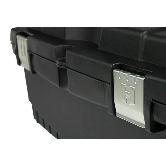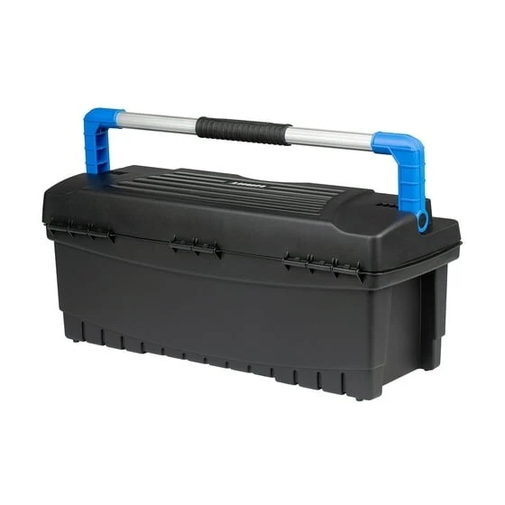 The HART 26 Inch Toolbox delivers large capacity and portable storage for your tools and hardware. This lightweight box is ready to make your life easier with reliable tool storage. Metal latches provide a secure closure and a wide handle keeps this box in your hands.The deep storage compartment and a removable tray which add an extra layer of organization. The HART 26" Toolbox gives you a simple style that's perfect for personal or professional use. The HART 26" Toolbox is made from resin, meaning it won't chip, scratch, or rot. Made to withstand both heat and cold, this rugged box can be used in just about any weather conditions. HART 26" Toolbox, Resin Tool Storage and Organization, Black with Blue Accents Perfect for professionals, hobbyists, and DIY-ers alike Rugged polypropylene resin construction is weather resistant and reliable A sturdy resin carrying handle for easy transportation; folds down when not in use Two lid compartments to hold small tools and parts A removable utility tray to access the spacious bottom storage compartment Two sturdy metal latches keep your items secure The metal latch on back keeps the lid from falling shut while you work Durability and longevity makes this a must have for any garage, job site, craft room, and more Pad Lockable (lock not included)