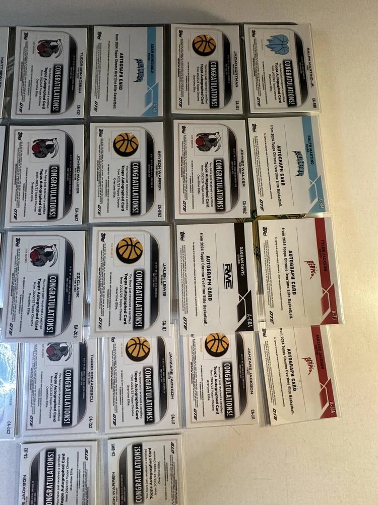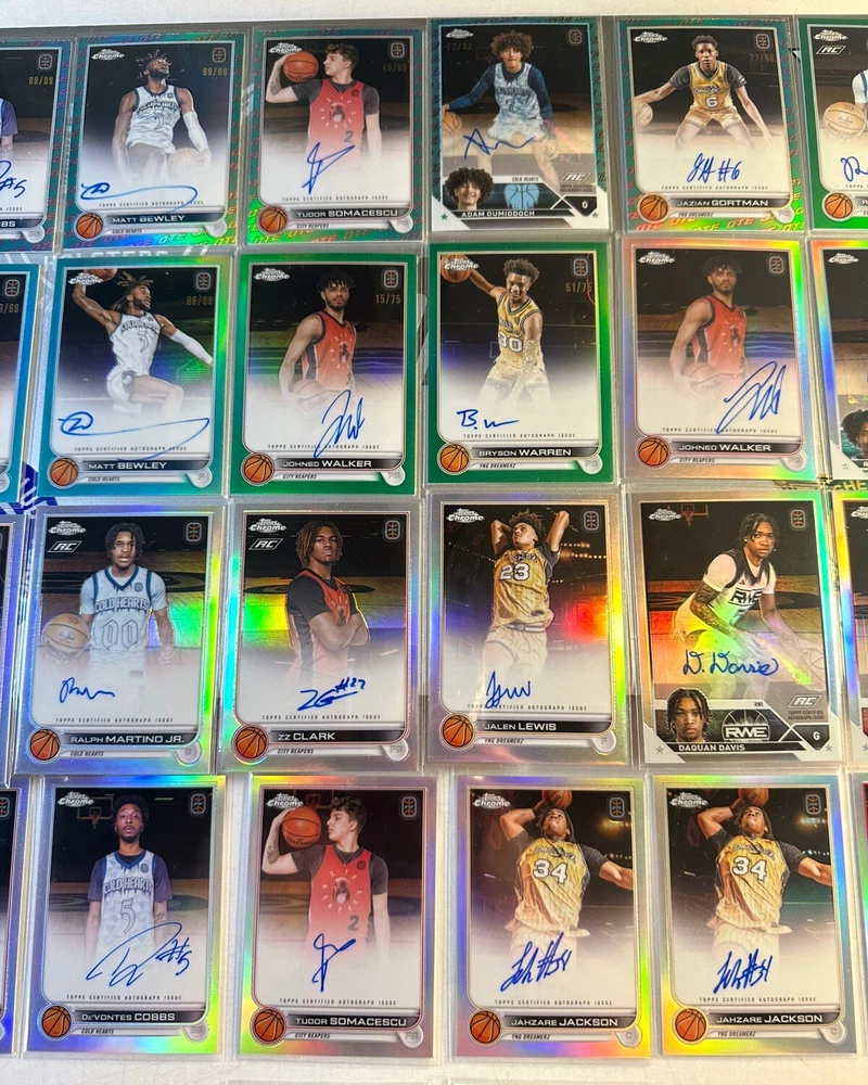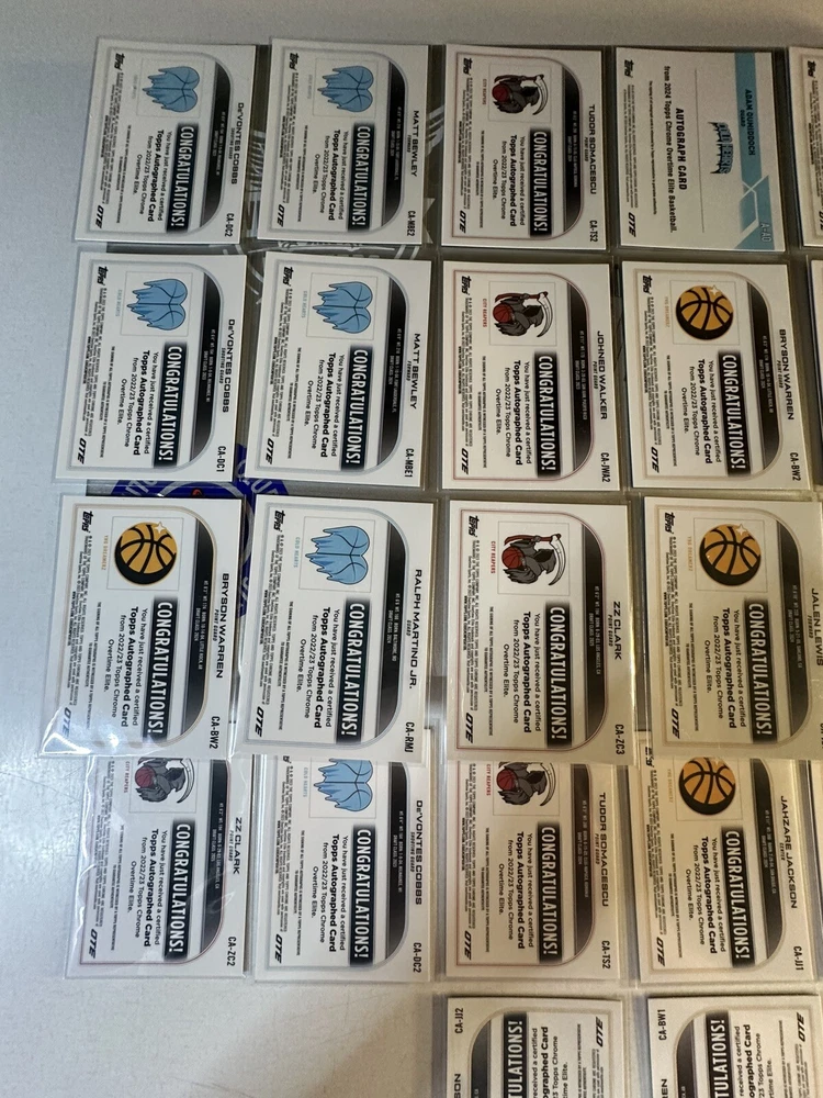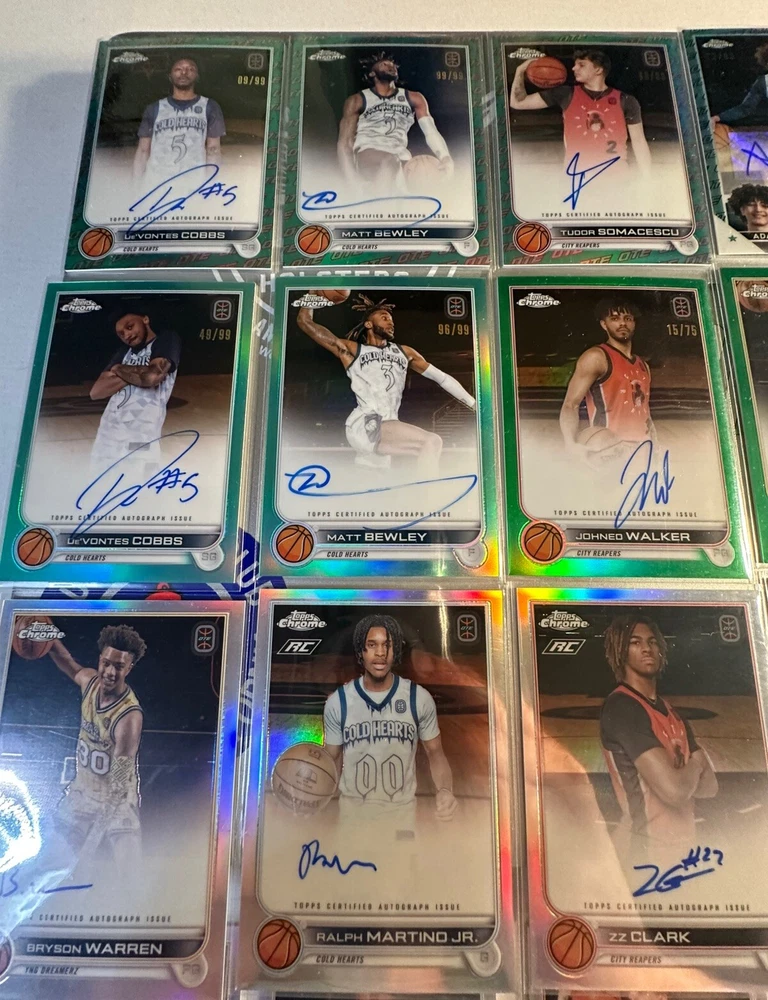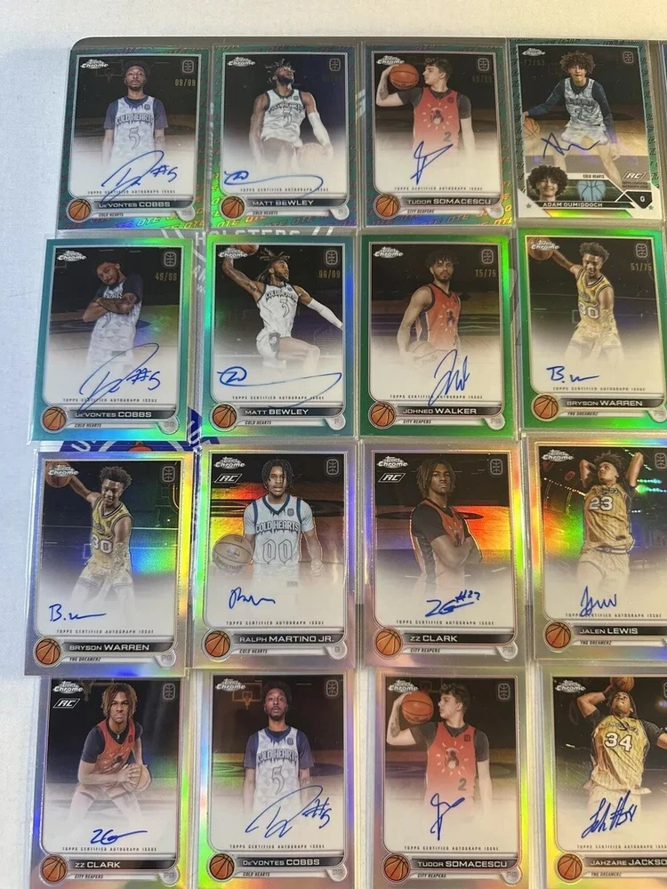 2022-24 TOPPS CHROME ote Autographs 1 - /25 orange basketball Bryson warren 3x - #/75 green Ralph martino johned walker Bryson warren 2x - Aqua /99 devonte cobbs matt Bewley 5x - aqua ote /99 Devonte cobbs matt Bewley tudor somacescu jazian gortman adam oumiddoch 15x Silver non numbered – zz clark (2), devontes cobbs, tudor somacesco, jahzare Jackson (4x), tyler Jackson, ralph martino (2x), johned walker, daquan davis, Jalen lewis, Bryson warren