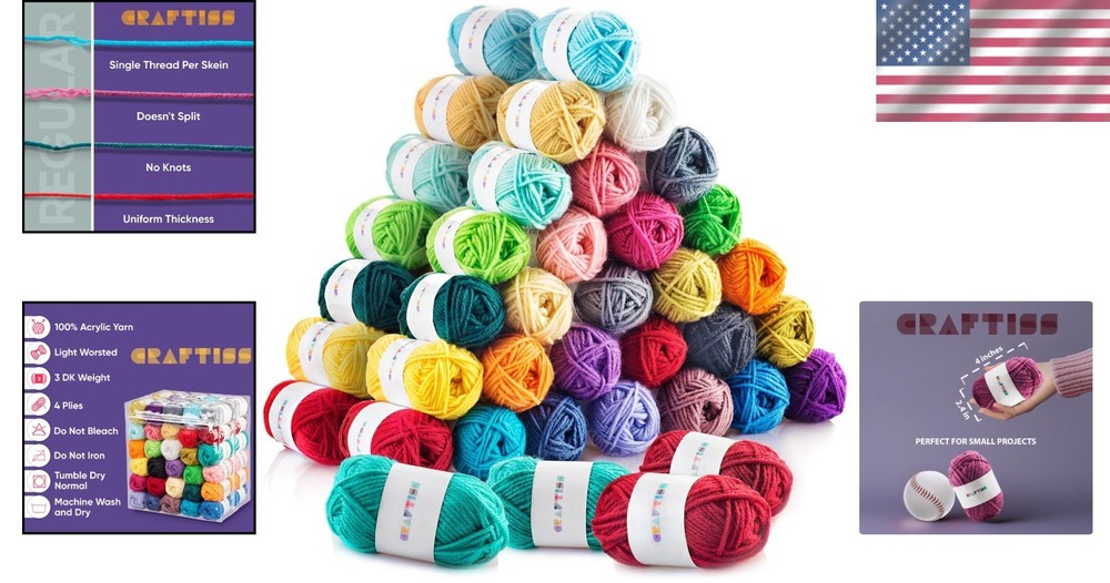 Unit of Sale: Pack/Set Color: Multi-Color Product Care Instructions: Machine Wash Shape: Ball Fiber Content: Acrylic Material: Acrylic Compatible Crochet Hook Us Size: 3.25 Mm Or D/3 Number Of Items: 60 Brand: Unbranded Type: Mini Skein UPC: Does Not Apply gtin13: Does Not Apply Weight: 3 - DK/Light Worsted Compatible Crochet Hook Metric Size: 3.25 Millimeters Item Weight: 2.7 Pounds Material Composition: 100% Acrylic Item Length: 43.7 Yards Suitable For: Crochet, Knitting, Crafts Style: Plain