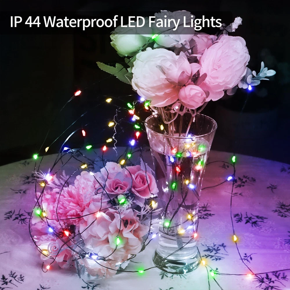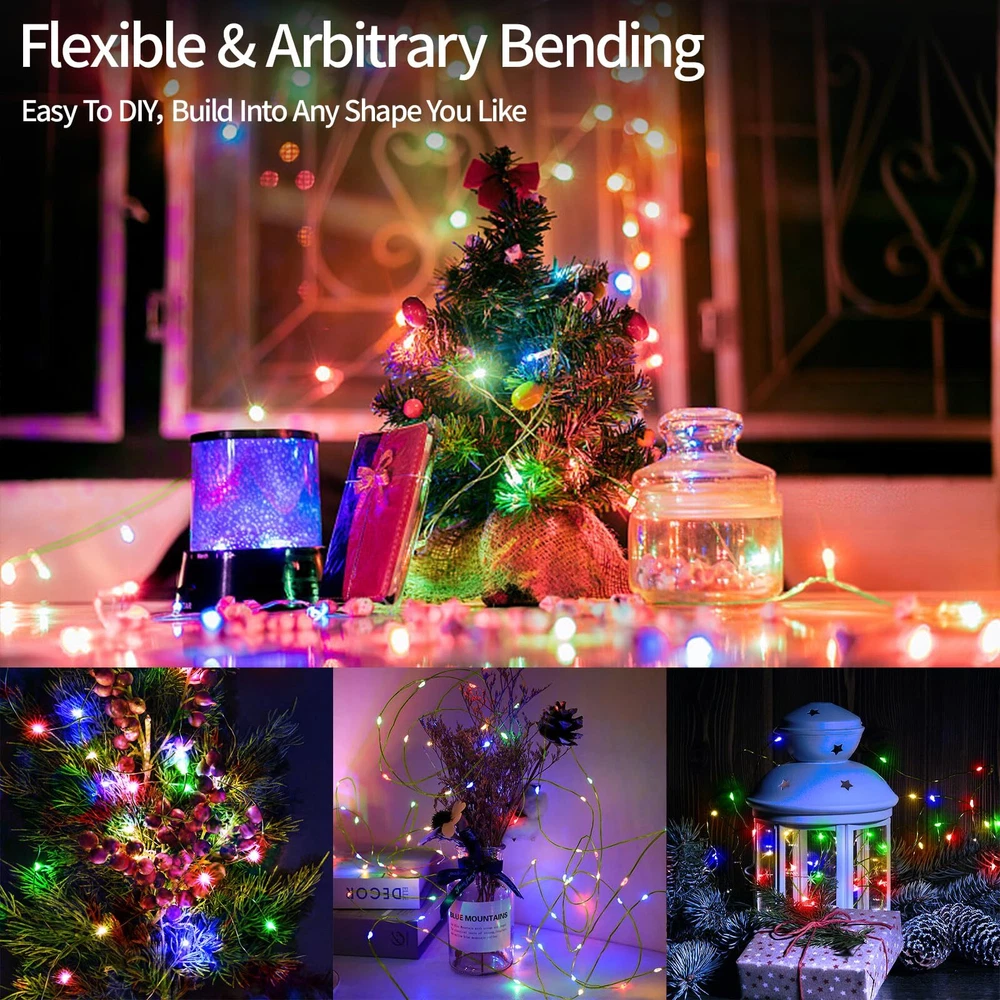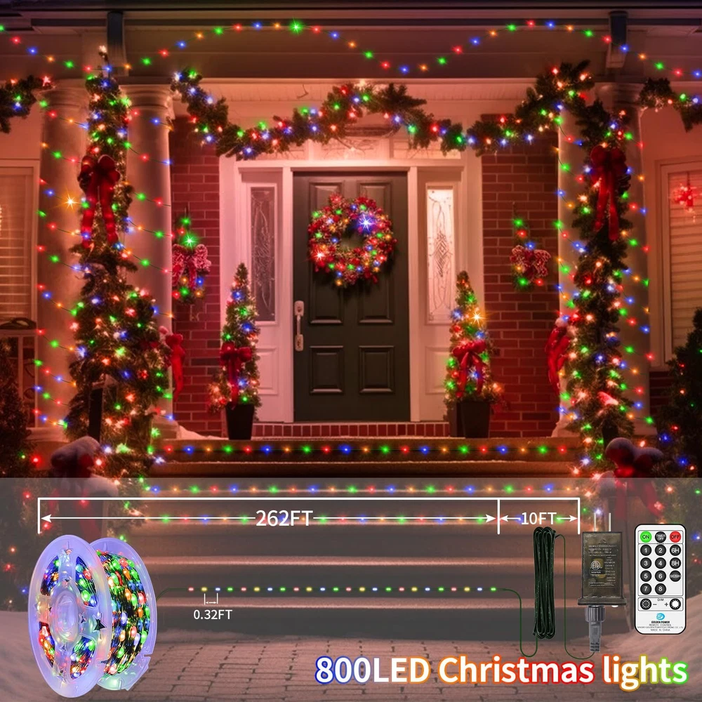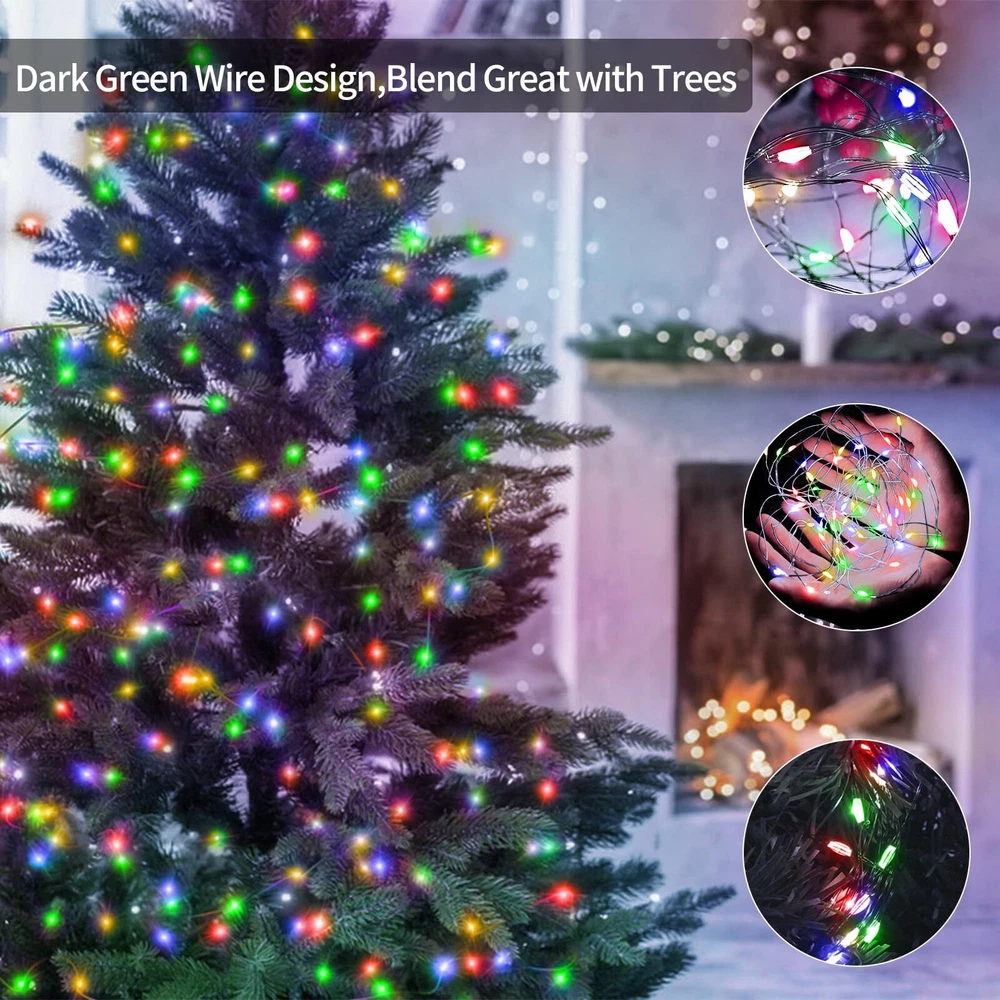 Green Copper Wire Design: The green wires of Christmas LED lights are similar in colour to trees and garlands, can be better hidden inside Christmas trees, greenery, comes with a reel for easy storage DIY Plug in Fairy Lights: This string lights adopted 3 copper wires and 800 pcs super bright lamp beads, it is very durable & flexible and the bendable copper wire string lights can be easily built into the shapes you want Multifunctional LED String Lights: 8 lighting modes function; Three timer modes: 6 hours on, 18 hours off/8 hours on, 16 hours off/6 hours on, 6 hours off, 3 hours on, 9 hours off; Memory: No need to reset last time setting; 4 level brightness adjustment:25%-50%-75%-100% to meet your need Waterproof Outdoor Christmas Lights: Our string lights with IP44 waterproof design, which can be widely applied to indoor and outdoor decoration (keep the power plug dry) What You Get: 1 x 800 LED Fairy Lights; 1 x Plug in;1 x Remote Control; 1 x Reel; 1 x User Manual
