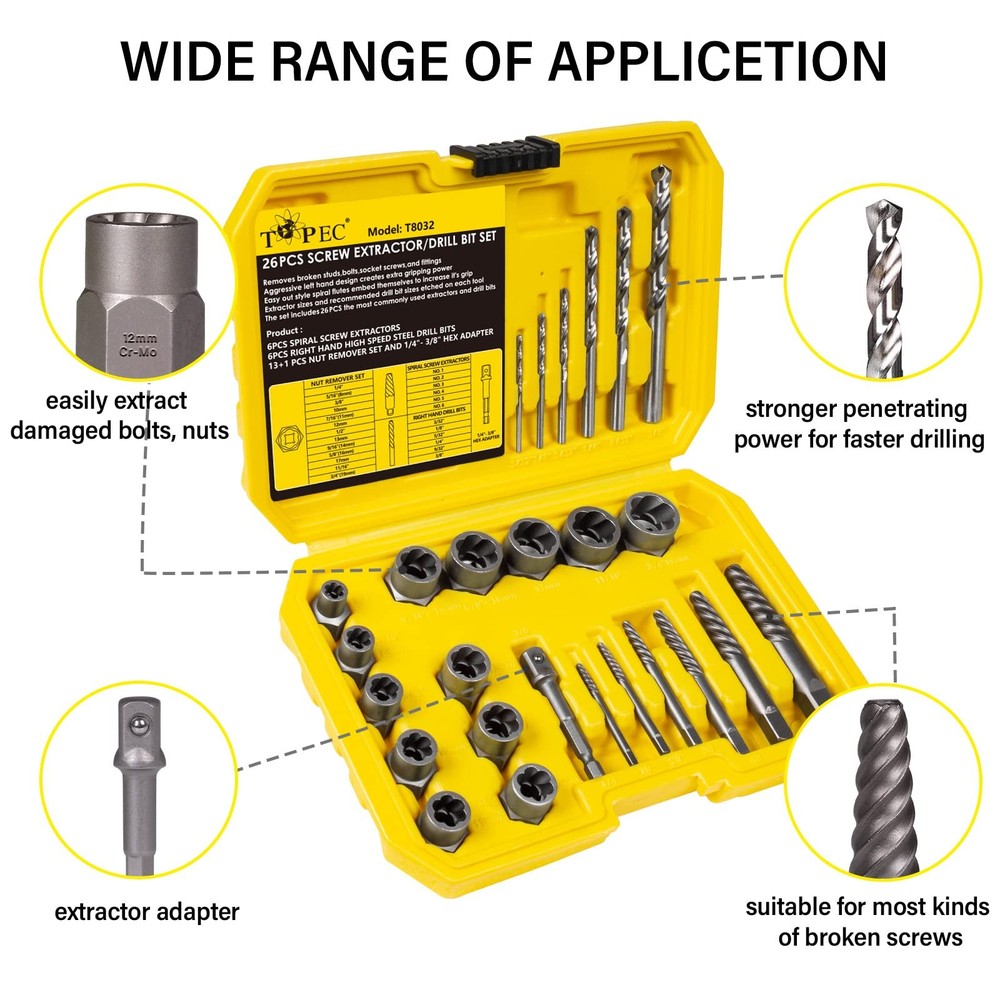 Spiral Flute Screw Extractor Set for Removing Rusted and Stripped Screws, Bolts and Other Fasteners 【26-PIECE MULTIFUNCTIONAL EXTRACTORS SET】: This is a set of 3-in-1 screw & nut remover kit and drill bit kit. It contains 13pcs nut removers, 6pcs right hand high speed steel drill bits, 6pcs spiral screw extractors, 1pcs hex impact grade socket adapter. Multiple specifications and sizes to meet your various work needs. 【EXACT SIZE】: Screw remover kit parts have clear specifications printed on them, Nut Removers Size: 1/4inch, 5/16inch (8mm), 3/8 inch, 10mm, 7/16 inch (11mm), 12mm, 1/2inch, 13mm, 9/16inch (14mm), 5/8 inch (16mm), 17mm, 11/16 inch, 3/4 inch (19mm). Drill Bits Size: 3/32", 1/8", 5/32", 1/4", 9/32", 3/8". Spiral Screw Extractors Size: 1#, 2#, 3#, 4#, 5#, 6#. Included 3/8"-1/4" hex adapter. 【HIGH QUALITY】: The nut remover/spiral screw extractor are made of high hardness chrome-molybdenum steel. Reverse spiral groove design bending down to provide maximum grip force to easily remove damaged bolts, nuts, broken screws. The right hand drill is made of HHS and the head is designed with a 135° angle. which is not easily worn and has strong penetration. Surface titanium nitride coating, effective anti-corrosion and rust prevention, extending service life. 【WIDELY USED】All premium industrial grade bolt extractors are strictly designed. The grip is firm, not easy to fall off, and provides more torque. Easily remove damaged bolts, nuts and screws even if they are peeled, rusted or frozen. Suitable for power drills, flat or allen wrenches, tap adapters. 【PREMIUM SERVICE】 - If you have any problems with our products. Contact our professional after-sales service team through Amazon, the after-sales team will contact you and solve your problem in time.