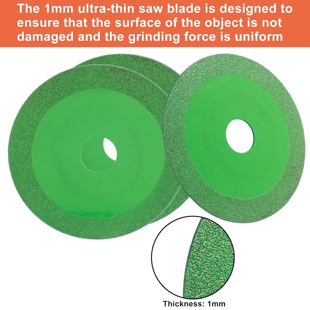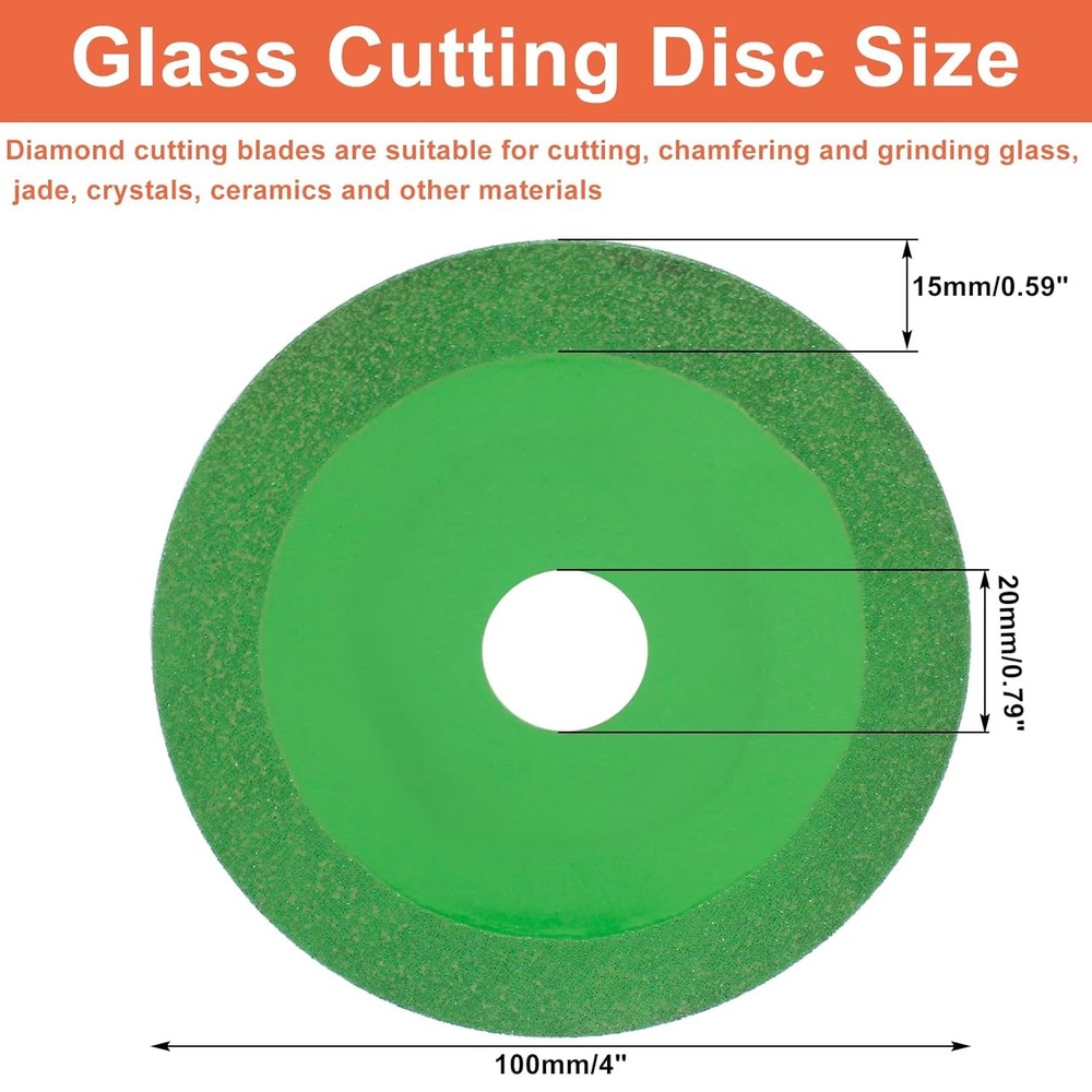 Product Features 🎄 【Premium Material】The glass cutting disc for the glass grinder is made of high manganese steel matrix material, highly rigid, sturdy, and durable. Continuous rim design with fine diamond particles achieves precise, chip-free cuts allowing you to work quickly and effectively. 🎄 【Efficient Use】4-inch diamond ultra-thin cutting saw blade for angle grinder/stone saw / circular saw, the ultra-thin design can minimize the contact area between the glass cutting disc and the cutter, achieving faster and cleaner cuts. 🎄 【Size】4-inch (diameter 100 mm ) diamond saw blade with 3/4 inch (diameter of the inner hole 20 mm), suitable for 4inch angle grinder/stone saw/circular saw, Ultra-thin hard matrix, cutting, grinding, seam cleaning can be, Both dry and wet cutting can be used. 🎄 【Wide Application】Suitable for Smooth Cutting, Chamfering, And Grinding Of Glass, Jade, Crystal, Wine Bottles, Ceramics, Ceramic Tiles, And Other Materials. Product Specification Package Included 📦2/6 x Glass Cutting Disc