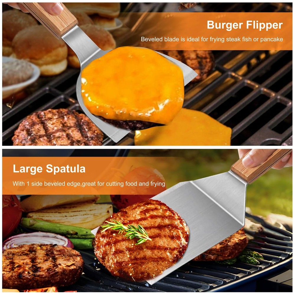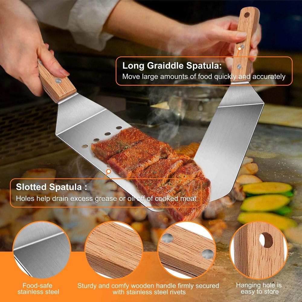 26 Pieces Griddle Tools Set - Fall in Love with Grilling All Over Again Our griddle utensils set is a complete set of grill accessories you will need to perfectly accent your outdoor grilling on the coming holidays. They will satisfy all your needs for cooking, would be your great companion in the indoor/outdoor kitchen. Each of griddle tool has its unique use. Easy to Clean & Dishwasher Safe All griddle tools are made of food grade stainless steel, they are easy to clean, and also can be put into the dishwasher for saving your time. 26 Pieces in total Food Grade Stainless Steel Anti-rust, Anti-deformation Heat-insulating wooden Handle Easy to Wash, Dishwasher Safe Well-packaging Christmas Gift Package Include: 1 X Long Solid/Perforated Spatulas 1 X Oversize Turner Steak Flipper 1 X Pizza Server, Griddle Chopper 2 X Squeeze Bottles, Salt Shakers 1 X Burger Press, Cleaning Pad 1 X Scissors, Thermometer, Apron 10 X Hanging Hooks 1 X Durable Storage Bag What Makes This Griddle Kit Different? 1.Oversized restaurant style stainless steel griddle spatulas are great for flipping burgers, pancakes, veggies and all other grill or griddle applications. 2.Made of high-quality stainless steel material, the flat top griddle accessories are heat-resistant and rust-proof, safer and more durable for long-term use. 3.The handles of grill accessories are made of heat-insulating wooden Handle to offer firm and comfortable grip, equipped with hanging hole for easy storage. 4.The grill cleaning brush pad with handle keeps your hands from being burned by the heat, which is effectively remove stubborn stains and restore griddles original luster. 5.Pressing down food with the burger press, which makes them tender inside and crisp outside and cooks more evenly to increase the flavor of food. [ All In One Griddle Accessories Kit ] The complete 26PC griddle tool kit covers all your grilling needs, includes Long solid/perforated griddle spatulas, oversize turner, steak flipper, pizza server, griddle chopper, 2 squeeze bottles, cleaning pad, scissors, meat thermometer, 2 salt shakers, apron, burger press, 10 hanging hooks and storage bag. A professional griddle set makes it great for flipping burgers, pancakes, veggies and all other grill or griddle applications. [ Premium Stainless Steel flat top grill accessories Set ] Each griddle accessory is made of high quality stainless steel which is durable, rust-resistant and easy to clean. The griddle kit is ideal for flat top grills will help you conquer flat top grilling in your courtyard like a master, and without worry about your griddle grill accessories bending breaking or rusting again. What is more, griddle tools are easy to clean and dishwasher safe, more convenience. [ Comfortable Firm Grip hibachi grill accessories ] Designed not to bend or break with great heat insulation. Crafted of high quality wooden material, the smooth handle griddle spatulas with securely riveted ensure optimal touch comfort, also provide protection against rust and thawing. A utility hanging hole for convenient hanging by using hooks or a wall mount. [ Bevelled Edges Grill Spatula And Grill Press ] Both griddle spatulas and bacon press are made of stainless steel and equipped with a heat resistant handle, constructed with heavy gauge steel, strong enough to resist deformation, rust-free for less hassle. Extra-large griddle scraper turner blade is designed for bigger cuts of meat. Burger press is easy to deal with bacon, burgers, beef and more. [ Designed for All Griddle cooking ] With the flat top griddle accessories set, you can expect superior performance as you rely on the griddle tools to cook. Works great for making burgers, teppanyaki or breakfast pancakes on your electric, gas or countertop propane griddle. Packed in a nice canvas storage bag, the hibachi grill accessories set is not only easy to store, but also convenient to take to backyard park outdoor camping or daily using in kitchen. [ Perfect Gift Choice ] The griddle spatula set comes with nice packaging box. Great gift choice on every important life moments as birthday, anniversary and retirement, as well be the picked one of the Holiday Gift Planning for grand festivals, such as Mother's Day, Father's Day, Thanksgiving, Christmas.