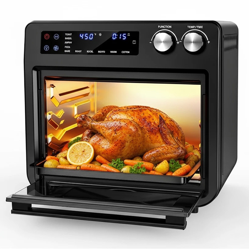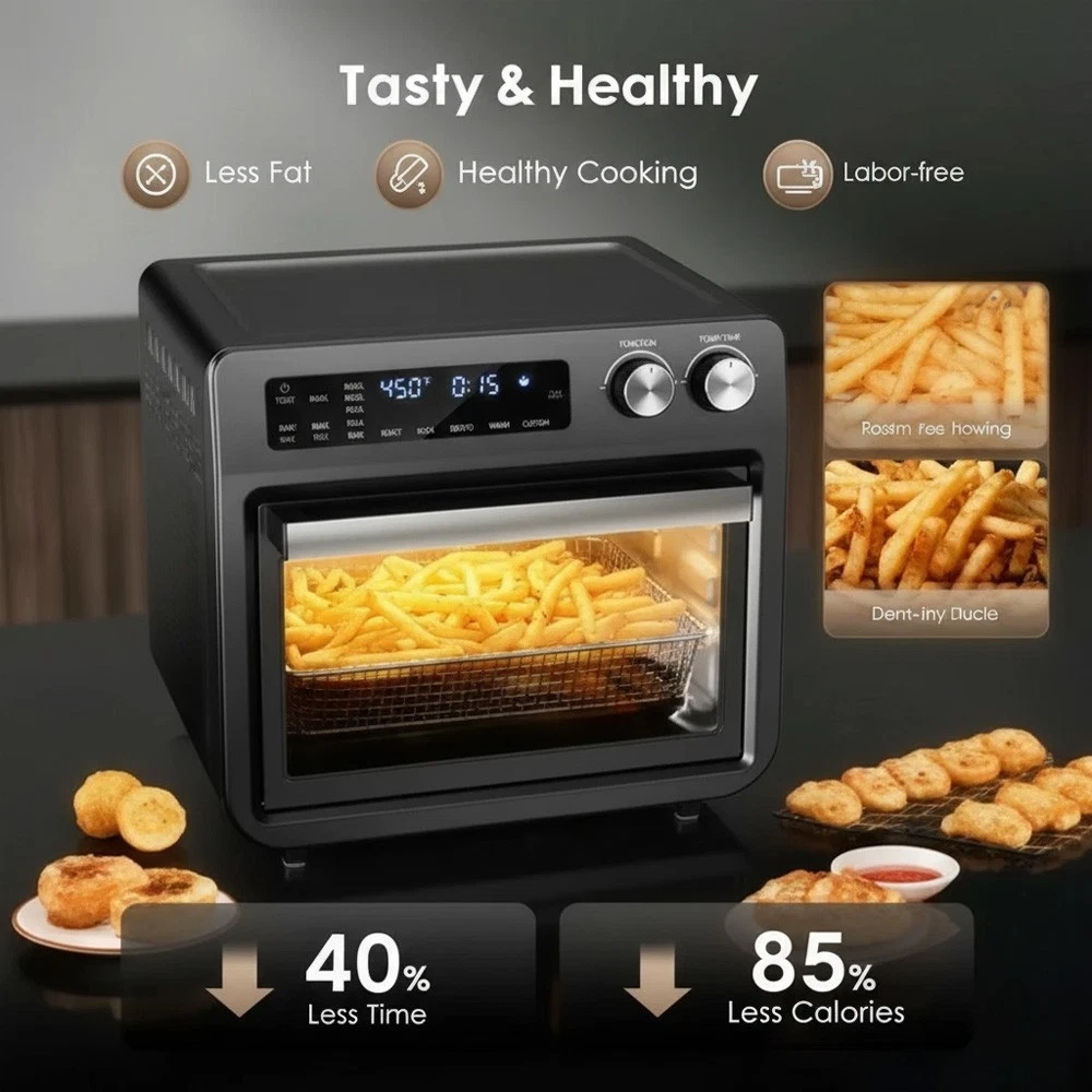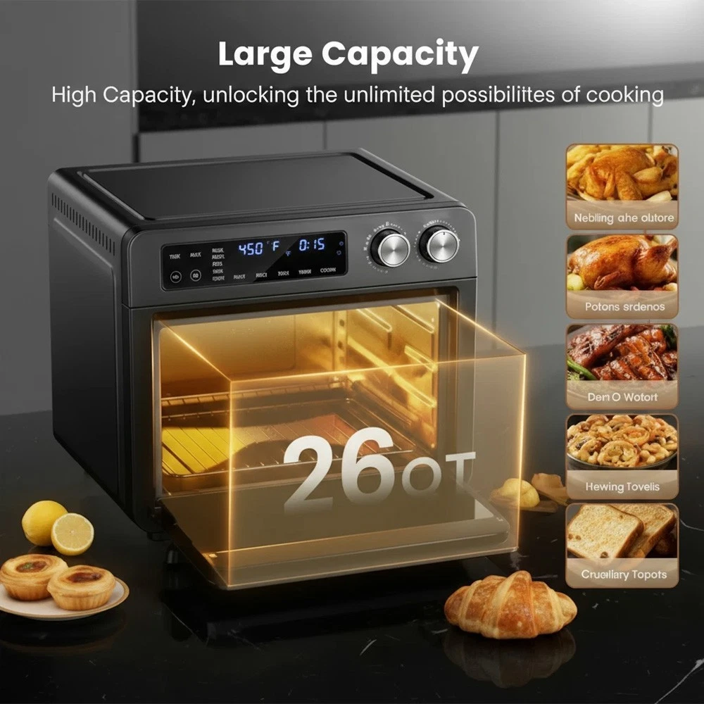 26QT 1800W digital air fryer oven with touchscreen and viewing window. The large-capacity 10-in-1 appliance allows you to air fry, bake, toast, roast, broil, dehydrate, and more. The Smart HD control panel offers precise temperature control (up to 450°F) and a timer from 0 to 6 hours for perfect results. 360° hot air circulation cooks evenly with 85% less oil. The built-in light and transparent window allow you to easily monitor your food. Includes 4 accessories: air fryer basket, baking tray, rack, and crumb tray. ETL certified, safe, and energy efficient. Perfect for family use.