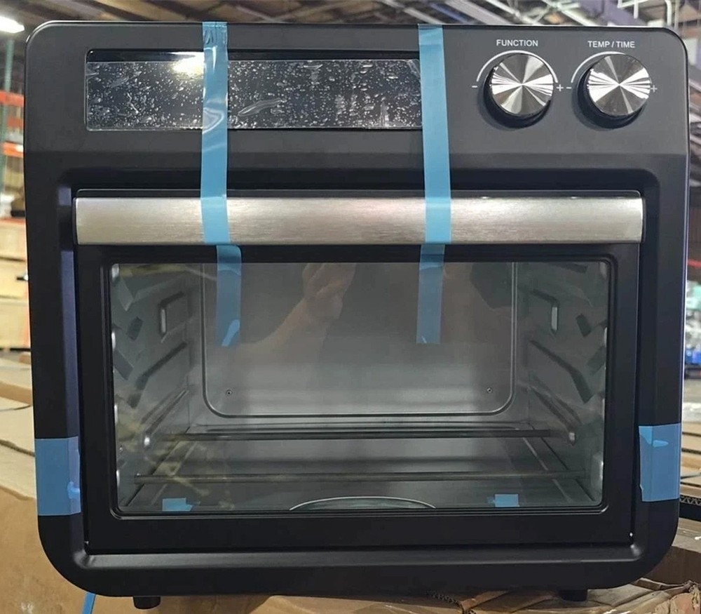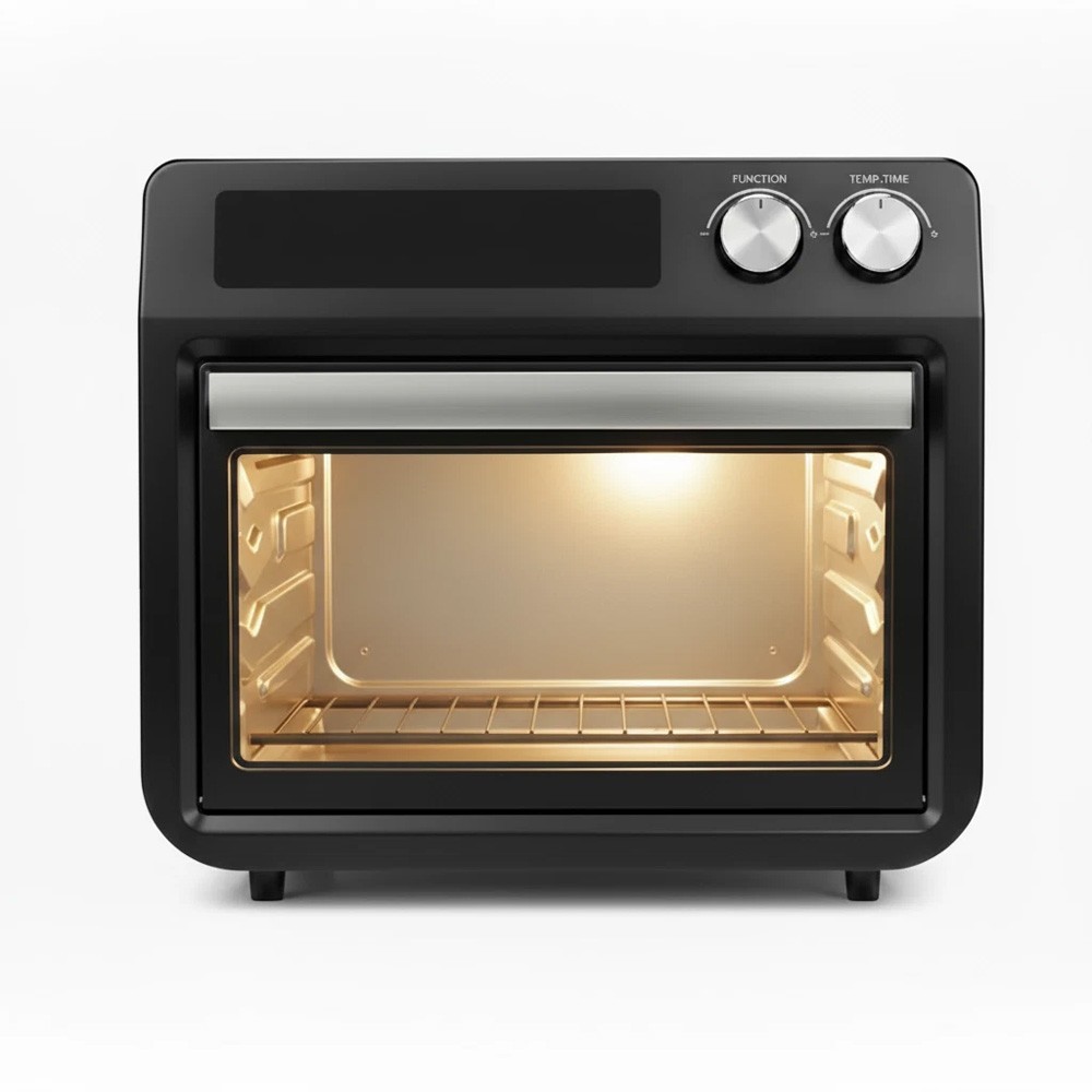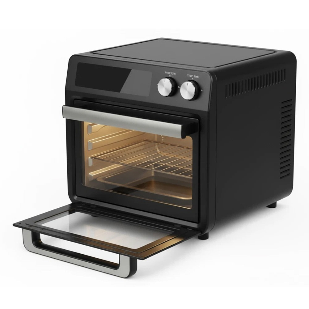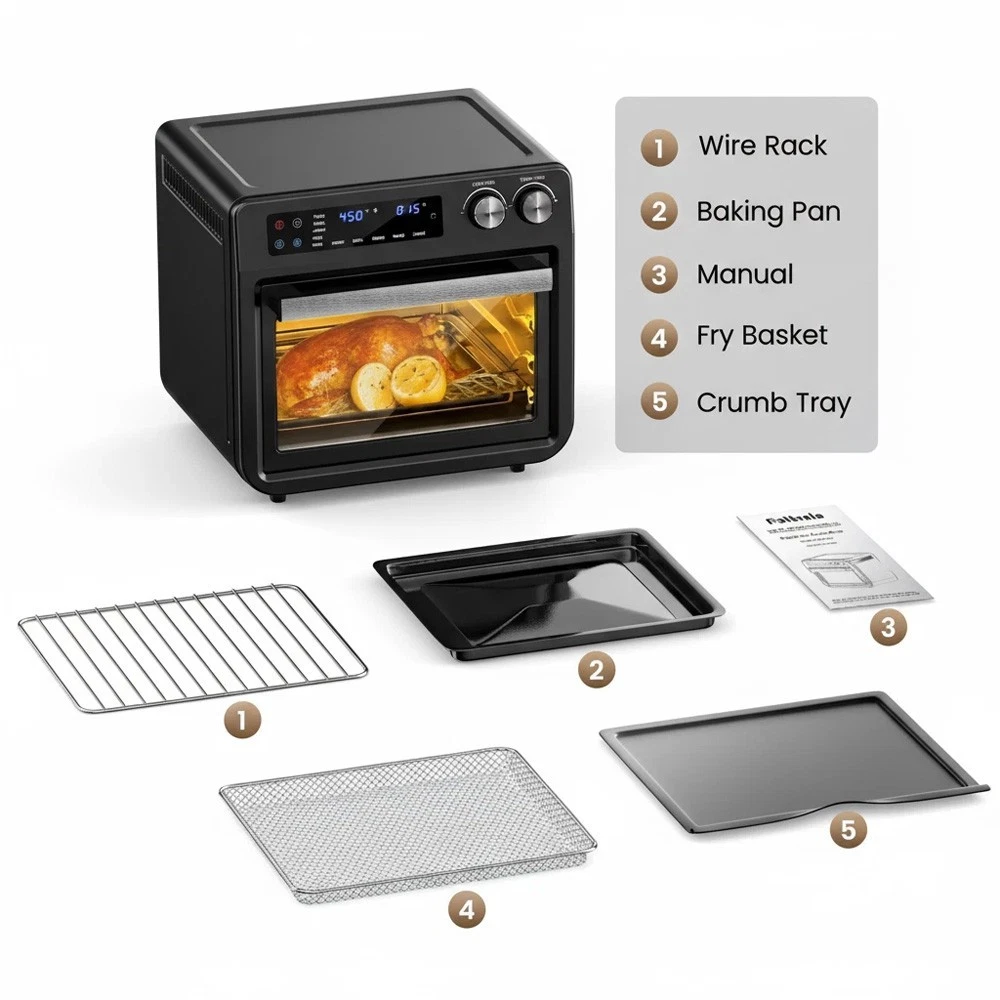26QT 1800W digital air fryer oven with touchscreen and viewing window. The large-capacity 10-in-1 appliance allows you to air fry, bake, toast, roast, broil, dehydrate, and more. The Smart HD control panel offers precise temperature control (up to 450°F) and a timer from 0 to 6 hours for perfect results. 360° hot air circulation cooks evenly with 85% less oil. The built-in light and transparent window allow you to easily monitor your food. Includes 4 accessories: air fryer basket, baking tray, rack, and crumb tray. ETL certified, safe, and energy efficient. Perfect for family use.