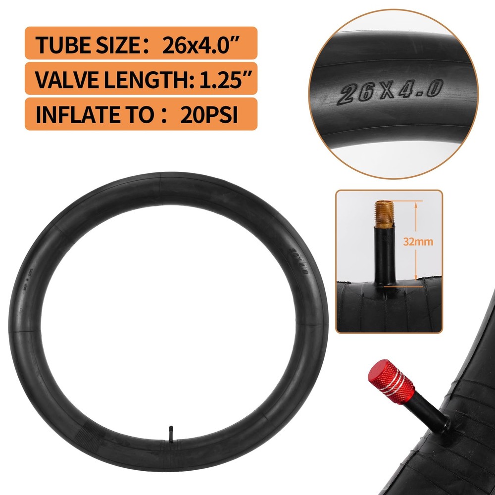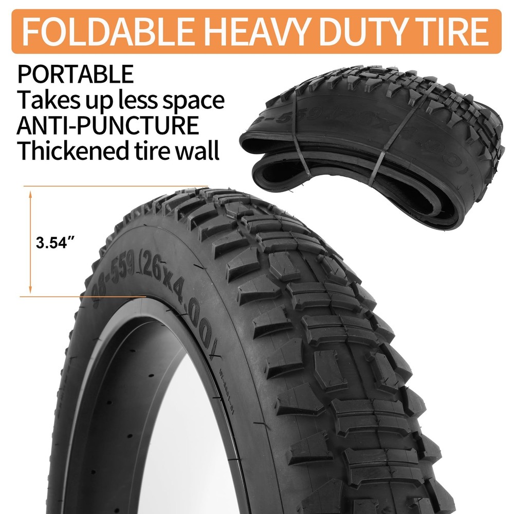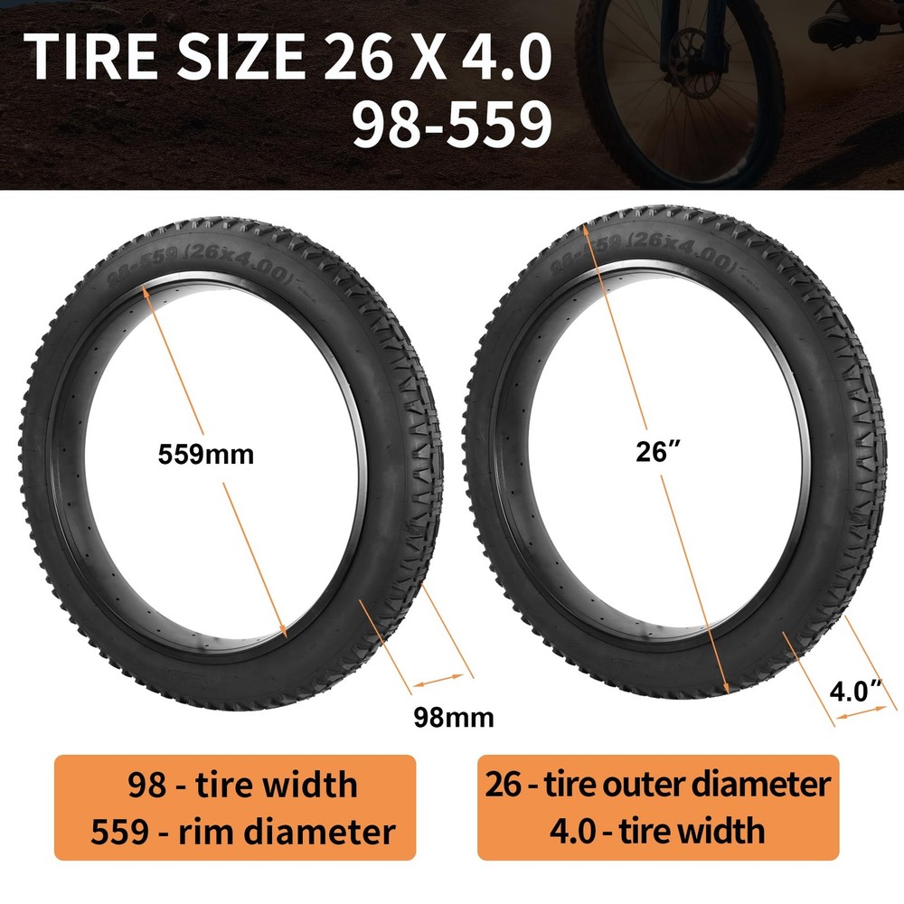 Heavy Duty 26X4 98-559 E-Bike Fat Tires, High-Performance Wear-Resistant 26X4.0 Fat Tire and Tube Sets for 26 Inch E-Bike Mountain Snow Bike Tire - 2Pack 26X4.0 (98-559) E-BIKE FAT TIRE - These 26X4 fat bike tires are not only suitable for e-bikes but also for mountain bikes, snowmobiles and other types of bikes. Note: Please check the details and size carefully before purchase HEAVY DUTY FOR ULTIMATE DURABILITY - Each heavy-duty 26 inch fat bike tire is made of high-quality rubber and puncture-resistant technology, with a thick tread depth of 4mm to help prevent road debris from puncturing the tire; the 26x4-inch all-terrain fat tire handles every ride with ease EASY TO HANDLE ALL KINDS OF RIDING SURFACES - The unique tread design of this 26X4 fat tire allows the rider to travel freely through forests, mountains, beaches, deserts, gravel and other rugged surfaces. Combines the high performance of off-road cornering and stability on dirt roads with the smoothness of street driving WIDE RANGE OF PRACTICAL ACCESSORIES - The 26x4 Rim Tape is used between rim and tube to perfectly protect the tube of the bike; These two tire levers have high toughness and sufficient elasticity enough to allow you to quickly maintain your tires; Beautiful aluminum alloy inflatable valve cover prevents dirt and dust from entering the tube AFTER-SALES SERVICE - If you have any questions about the quality of the product we provide you with 1 year service, in order to provide you with better service and satisfied with the product you can contact us in time; you need to provide relevant pictures and information so that we can quickly reply! AFTER-SALES SERVICE - If you have any questions about the quality of the product we provide you with 1 year service, in order to provide you with better service and satisfied with the product you can contact us in time; you need to provide relevant pictures and information so that we can quickly reply! Shipping We offer FREE shipping on all orders! We ship within Three business days of payment, usually sooner. We use a selection of shipping services such as UPS, FedEx, USPS etc. We only ship to the lower 48 states, no APO/FPO addresses or PO Boxes allowed. Local pickups and combined shipping options are not provided at this time. Return You can return a product for up to 30 days from the date you purchased it. Any product you return must be in the same condition you received it and in the original packaging. Please keep the receipt. Payment We accept payment by any of the following methods: PayPal Please pay as soon as possible after winning an auction, as that will allow us to post your item to you sooner! Feedback Customer satisfaction is very important to us. If you have any problem with your order, please contact us and we will do our best to make you satisfied. Contact Us If you have any queries, please contact us via ebay. We usually respond within 24 hours on weekdays. Please visit our eBay store to check out other items for sale! Thank you for shopping at our store.