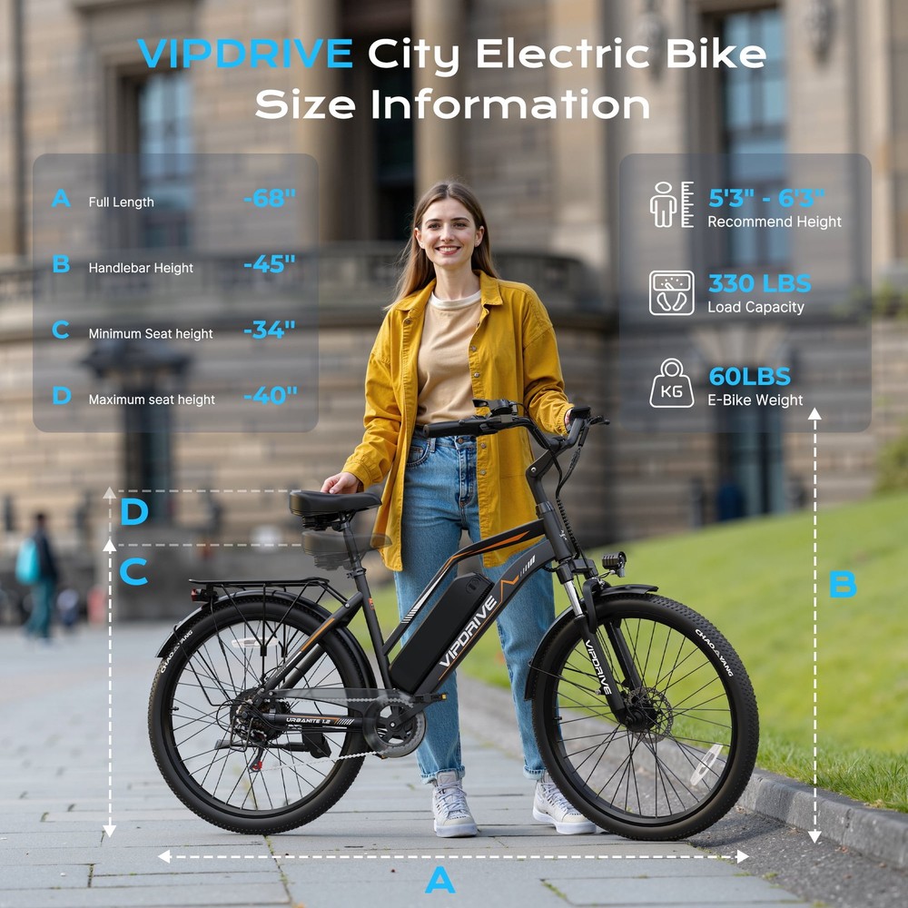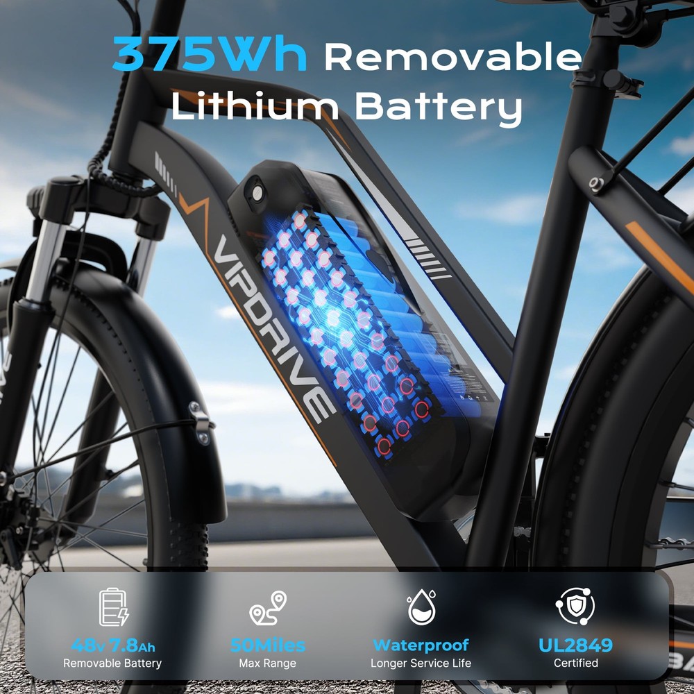 ๐๐จ๐ฐ๐๐ซ ๐๐๐๐ญ๐ฌ ๐๐ซ๐๐๐ง ๐๐ ๐ข๐ฅ๐ข๐ญ๐ฒ: Conquer city streets with VIPDRIVE Urbanite 1.2. Its robust 750W peak rear-drive hub motor propels you to 22 MPH, effortlessly handling hills and traffic. Choose your rhythm: throttle-only freedom, seamless pedal-assist, or classic cycling. Navigate commutes, errands, and urban adventures with commanding power. ๐๐ง๐๐๐๐ญ๐๐๐ฅ๐ ๐๐๐ง๐ ๐, ๐๐ง๐ซ๐ข๐ฏ๐๐ฅ๐๐ ๐๐จ๐ง๐ฏ๐๐ง๐ข๐๐ง๐๐: Go farther, do more. The 48V 7.8Ah (374.4Wh) battery delivers an impressive 50+ miles on a single charge in pedal-assist mode*, perfect for extensive commutes or multi-stop errands. Recharge in just hours at home or work. Spend less time plugged in and more time exploring your city. ๐๐ฆ๐๐ซ๐ญ ๐๐ข๐๐ข๐ง๐ , ๐๐ง๐๐ฅ๐๐ฌ๐ฌ ๐๐จ๐ฆ๐๐จ๐ซ๐ญ: VIPDRIVE prioritizes a smooth, intuitive experience. Enjoy a comfortable upright posture on the 26" city frame, aided by a plush saddle and intuitive controls. Dual-disc brakes provide confident stopping power in all conditions. Plus, your journey starts equipped โ includes essential accessories (lock, phone mount, pump) for immediate adventure. ๐๐ฎ๐ข๐ฅ๐ญ ๐๐จ๐ฎ๐ ๐ก, ๐๐ข๐๐ ๐๐ข๐ญ๐ก ๐๐จ๐ง๐๐ข๐๐๐ง๐๐: Engineered for the urban landscape, the Urbanite 1.2 features a durable frame built to withstand daily commutes. Integrated safety features (bright lighting & reflectors) ensure visibility day and night. The reliable rear hub motor offers a balanced, stable ride quality. ๐๐จ๐ฎ๐ซ ๐๐๐ฑ๐ญ ๐๐๐ฏ๐๐ง๐ญ๐ฎ๐ซ๐ ๐๐ญ๐๐ซ๐ญ๐ฌ ๐๐จ๐ฐ: The VIPDRIVE Urbanite 1.2 is more than an e-bike; it's your key to efficient, enjoyable, and empowered city living. Perfect for commuters, explorers, and anyone ready to redefine their ride. Arrives 90% pre-assembled for quick setup. Ride with assurance. Note: Our products have been certified under UL2849 safety standards. The item is UL 2849 certified with a link to the UL Product iQ