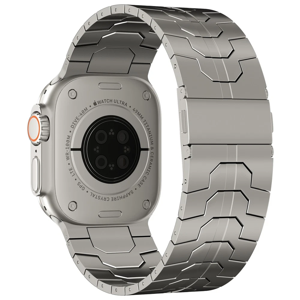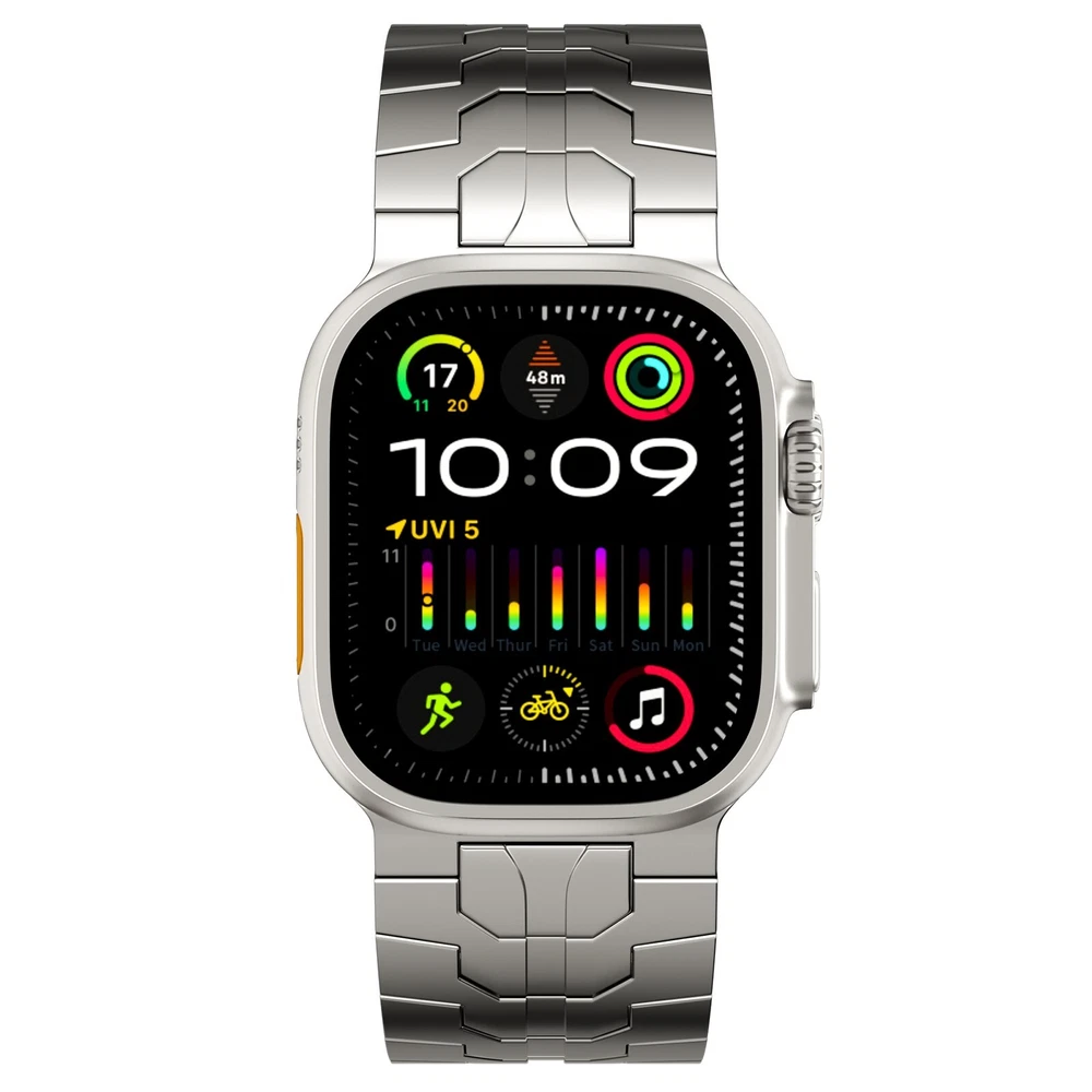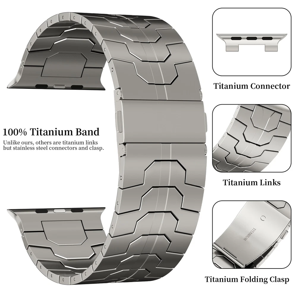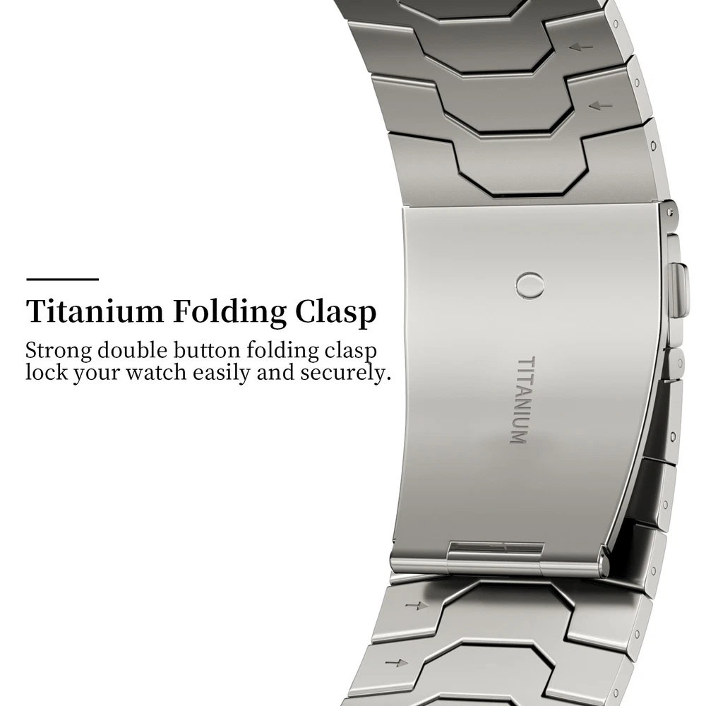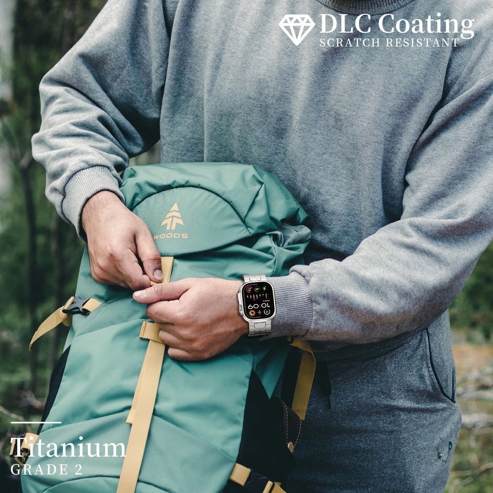 Specification Color TItanium Special Features Full titanium;DLC Coating Compatibility For Apple Watch Ultra 49mm / Series 10 46mm / Series 9 8 7 45mm / Series 6 5 4 SE2 SE 44mm Clasp Titanium Folding Clasp Connector Titanium Connector Titanium Grade Titanium Grade 2 Herring 800+HV Band Width 26mm Band Weight 64g(max) Band Thickness 2.7mm Band Length Clasp Thickness 5.6mm Wrist Size 170mm to 234mm Feature Lightweight;Corrosion-Resistant;Anti-Allergy Included Components Titanium watch band Warn tips: If you have specific requirements on packaging and components such as minor adjustment links、removal tool、tool pins and instruction, please contact online customer service. Product Description Full Titanium Band: All components include links, folding clasp, and connectors are crafted from Grade2 titanium, setting our bands apart from others with clasps and connectors made of non-titanium material 26MM Wider Design: The wider watch band best fits the Ultra. Design for any bold soul. Compatible with Apple Watch Ultra 49mm / Ultra 2 49mm / Series 10 46mm / Series 9 8 7 45mm / Series 6 SE 5 4 44mm. Fit wrist size 6.7" to 9.2"(170 to 234mm). We provide a minor adjustment link to adjust the band to fit for your wrist accurately Lightweight and Corrosion-Resistant: 64g(max). Experience the extraordinary benefits of full titanium - our titanium bands are not only lighter but also more corrosion-resistant than non-full titanium alternatives. Dive into the ocean or pool without worry, as our bands are built to withstand various environments Titanium Connectors: CNC high precision craftsmanship and unique titanium connectors ensure a tight and stable connection with your original watch interface. Make sure your watch band stays securely attached, providing a seamless and comfortable fit Titanium Folding Buckle: Sensitive skin? No problem. Our titanium folding buckle is an excellent choice, offering comfort without compromising style. Say goodbye to allergies associated with non-full titanium watch bands. Ensuring your watch band is comfortable to wear all day long DLC (Diamond-Like Carbon): Our aerospace-grade titanium bands are not only a perfect match in material and color for the original watch, but also The DLC (Diamond Like Carbon) coating gives it extra scratch prevention, durability and protection, far higher wear resistance than non DLC