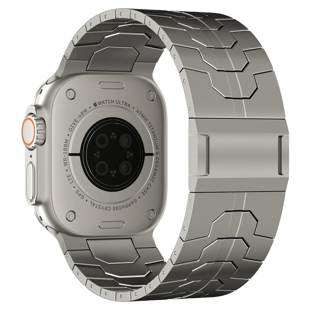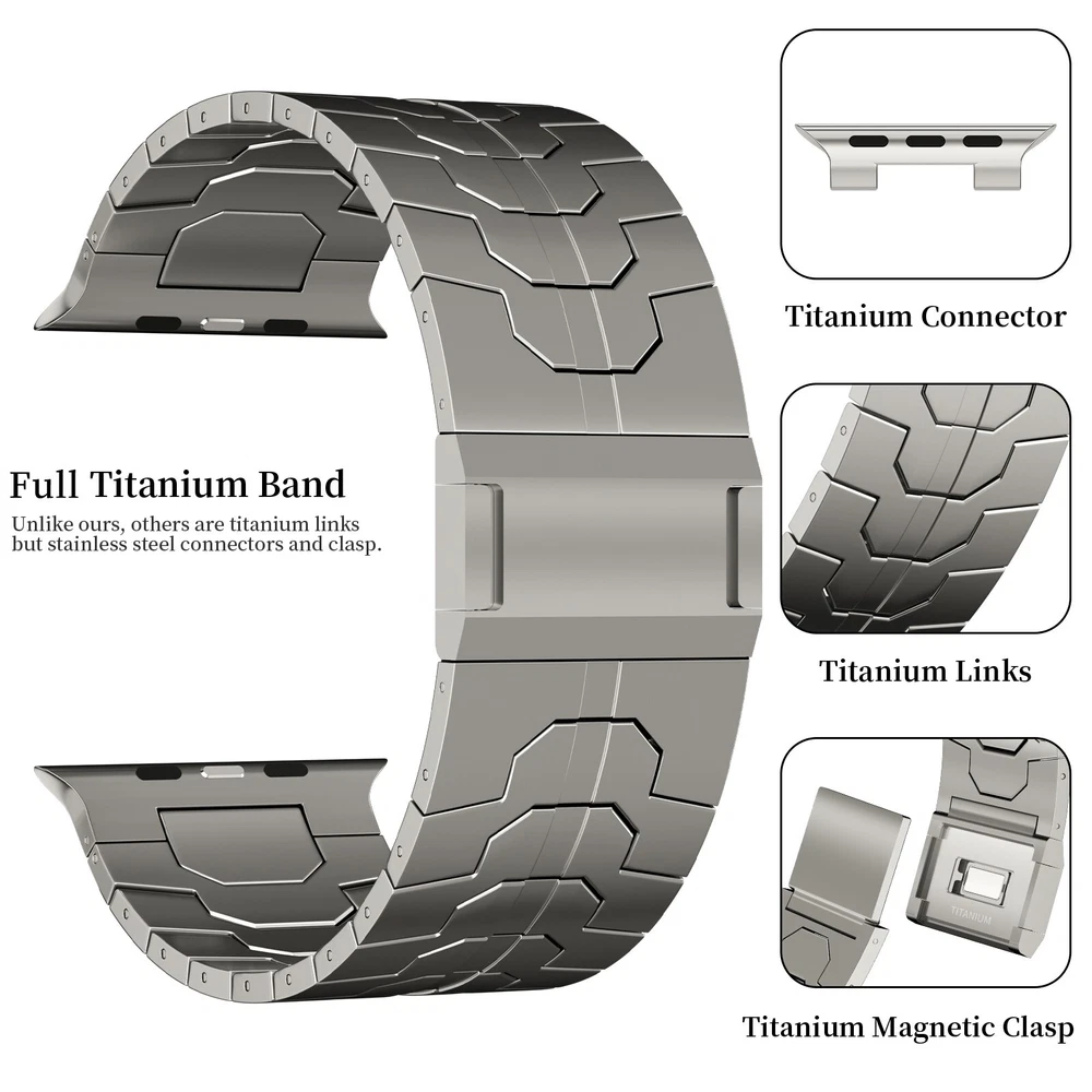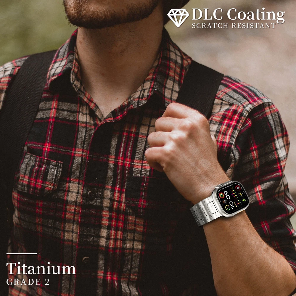 Specification Color TItanium Special Features Full titanium;DLC Coating Compatibility For Apple Watch Ultra 49mm / Series 10 46mm / Series 9 8 7 45mm / Series 6 5 4 SE2 SE 44mm Clasp Titanium Magnetic Clasp Connector Titanium Connector Titanium Grade Titanium Grade 2 Herring 800+HV Band Width 26mm Band Weight 59g(max) Band Thickness 2.7mm Band Length 210mm Clasp Thickness 5.5mm Wrist Size 170mm to 234mm Feature Lightweight;Corrosion-Resistant;Anti-Allergy Included Components Titanium watch band Warn tips: If you have specific requirements on packaging and components such as minor adjustment links、removal tool、tool pins and instruction, please contact online customer service. Product Description Full Titanium Band VS Titanium Band: All components include links, magnetic clasp, and connectors are crafted from titanium material, setting our bands apart from others with clasps and connectors made of non-titanium material 26MM Wider Design: The wider watch band best fits the Ultra. Design for any bold soul. Compatible with Apple Watch Ultra 49mm / Ultra 2 49mm / Series 10 46mm / Series 9 8 7 45mm / Series 6 SE 5 4 44mm. Fit wrist size 6.7" to 9.2"(170 to 234mm). We provide a minor adjustment link to adjust the band to fit for your wrist accurately Lightweight and Corrosion-Resistant: 59g(max). Experience the extraordinary benefits of full titanium - our titanium bands are not only lighter but also more corrosion-resistant than non-full titanium alternatives. Dive into the ocean or pool without worry, as our bands are built to withstand various environments Titanium Connectors: CNC high precision craftsmanship and unique titanium connectors ensure a tight and stable connection with your original watch interface. Make sure your watch band stays securely attached, providing a seamless and comfortable fit Titanium Magnetic Buckle & Hook and Loop Closure: Sensitive skin? No problem. Our titanium magnetic buckle is an excellent choice, offering comfort without compromising style. Say goodbye to allergies associated with non-full titanium watch bands. Ensuring your watch band is comfortable to wear all day long. Magnetic buckle & hook and loop closure lock your watch easily and securely DLC (Diamond-Like Carbon): Our aerospace-grade titanium bands are not only a perfect match in material and color for the original watch, but also The DLC (Diamond Like Carbon) coating gives it extra scratch prevention, durability and protection, far higher wear resistance than non DLC