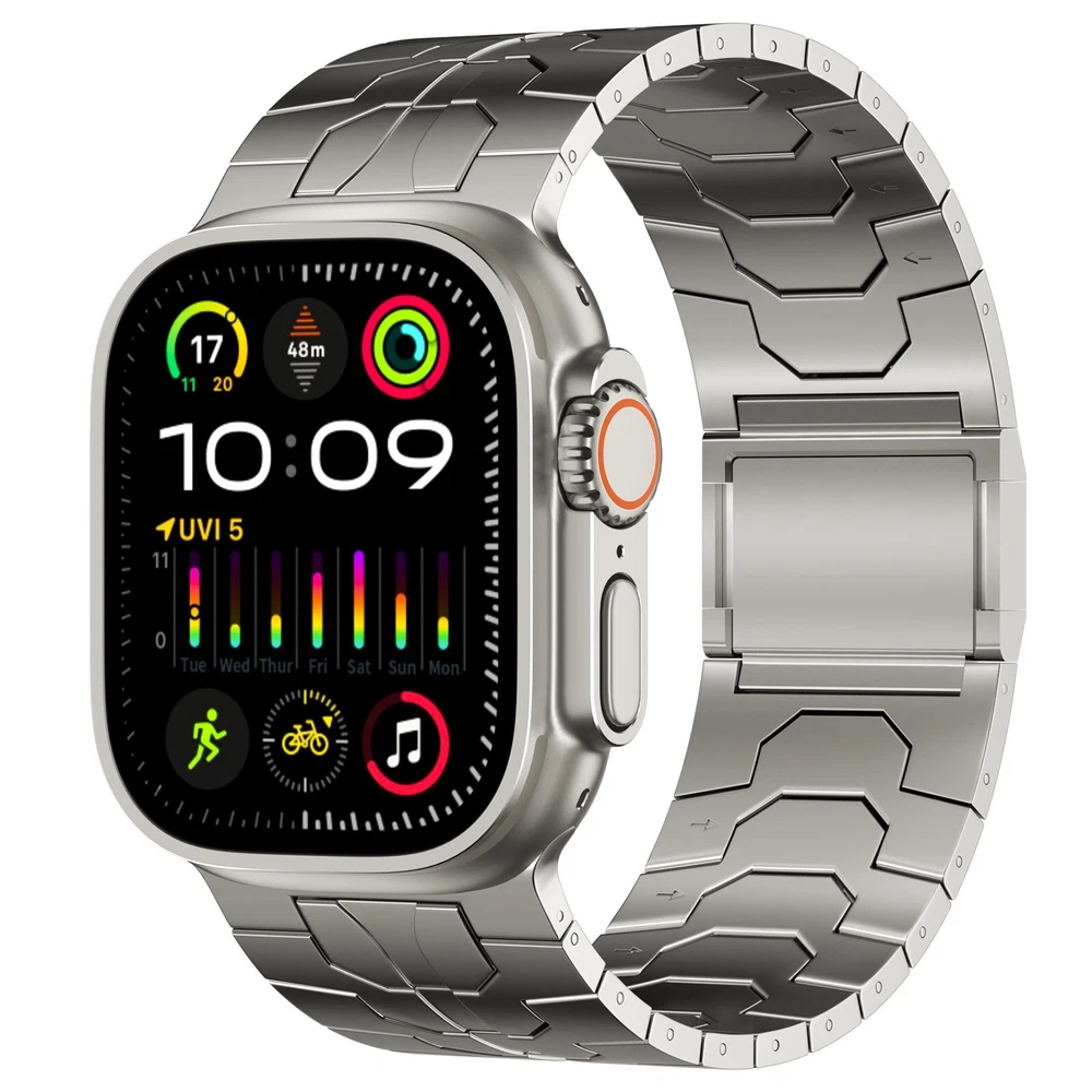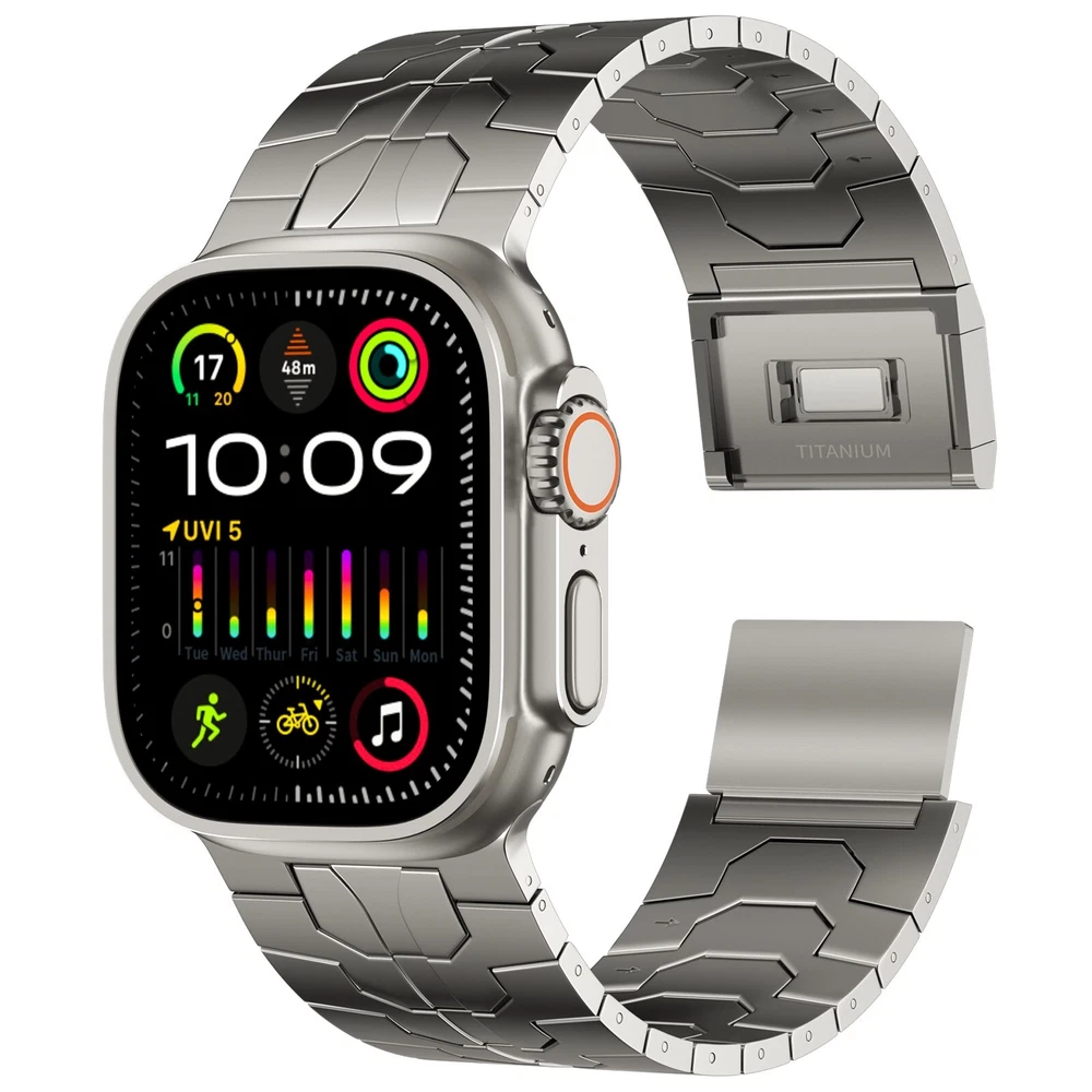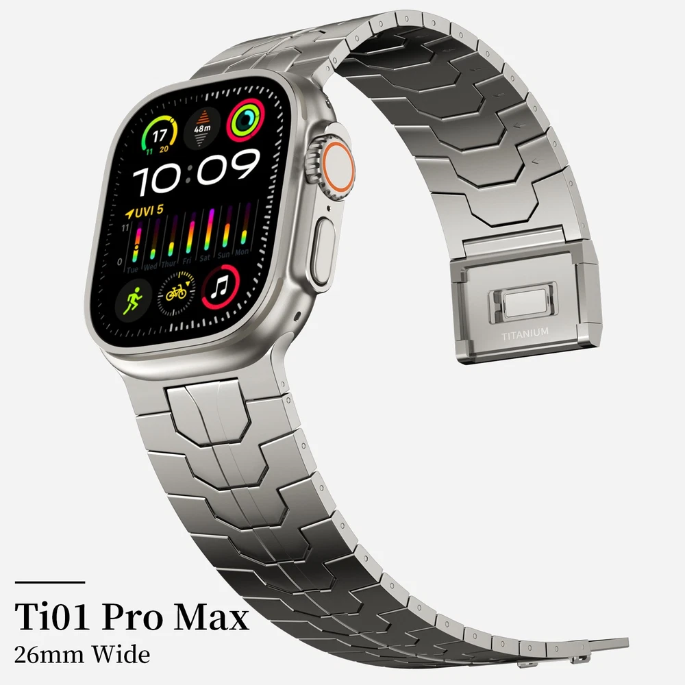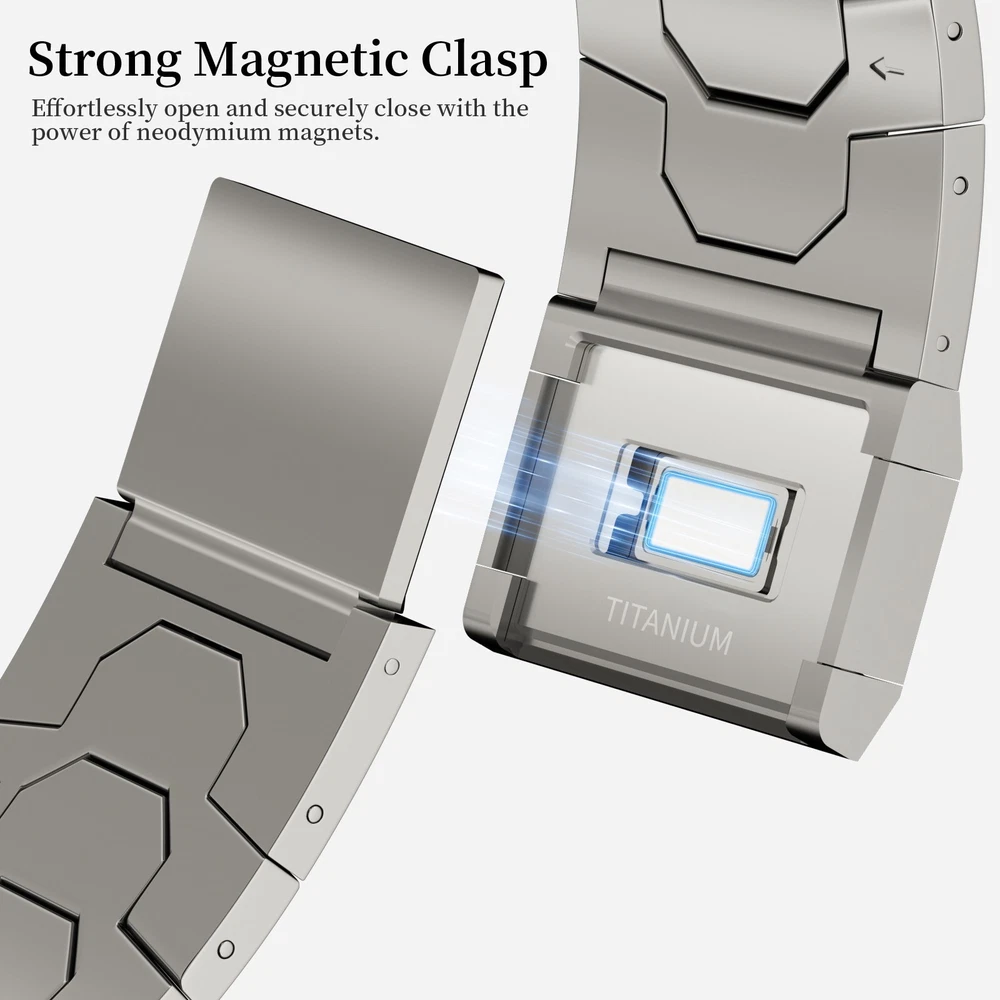 Specification Color TItanium Special Features Full titanium;DLC Coating Compatibility For Apple Watch Ultra 49mm / Series 10 46mm / Series 9 8 7 45mm / Series 6 5 4 SE2 SE 44mm Clasp Titanium Magnetic Clasp Connector Titanium Connector Titanium Grade Titanium Grade 2 Herring 800+HV Band Width 26mm Band Weight 59g(max) Band Thickness 2.7mm Band Length 210mm Clasp Thickness 5.5mm Wrist Size 170mm to 234mm Feature Lightweight;Corrosion-Resistant;Anti-Allergy Included Components Titanium watch band Warn tips: If you have specific requirements on packaging and components such as minor adjustment links、removal tool、tool pins and instruction, please contact online customer service. Product Description Full Titanium Band VS Titanium Band: All components include links, magnetic clasp, and connectors are crafted from titanium material, setting our bands apart from others with clasps and connectors made of non-titanium material 26MM Wider Design: The wider watch band best fits the Ultra. Design for any bold soul. Compatible with Apple Watch Ultra 49mm / Ultra 2 49mm / Series 10 46mm / Series 9 8 7 45mm / Series 6 SE 5 4 44mm. Fit wrist size 6.7" to 9.2"(170 to 234mm). We provide a minor adjustment link to adjust the band to fit for your wrist accurately Lightweight and Corrosion-Resistant: 59g(max). Experience the extraordinary benefits of full titanium - our titanium bands are not only lighter but also more corrosion-resistant than non-full titanium alternatives. Dive into the ocean or pool without worry, as our bands are built to withstand various environments Titanium Connectors: CNC high precision craftsmanship and unique titanium connectors ensure a tight and stable connection with your original watch interface. Make sure your watch band stays securely attached, providing a seamless and comfortable fit Titanium Magnetic Buckle & Hook and Loop Closure: Sensitive skin? No problem. Our titanium magnetic buckle is an excellent choice, offering comfort without compromising style. Say goodbye to allergies associated with non-full titanium watch bands. Ensuring your watch band is comfortable to wear all day long. Magnetic buckle & hook and loop closure lock your watch easily and securely DLC (Diamond-Like Carbon): Our aerospace-grade titanium bands are not only a perfect match in material and color for the original watch, but also The DLC (Diamond Like Carbon) coating gives it extra scratch prevention, durability and protection, far higher wear resistance than non DLC