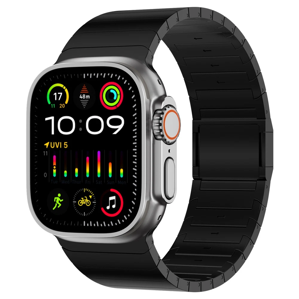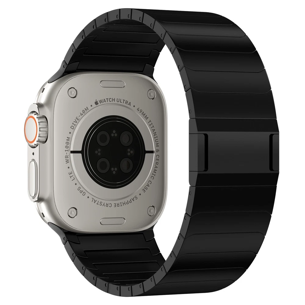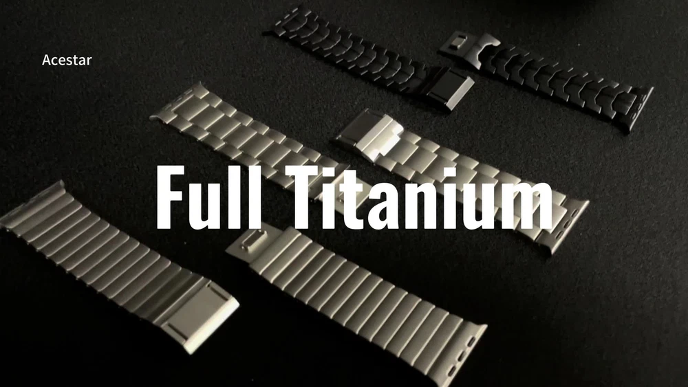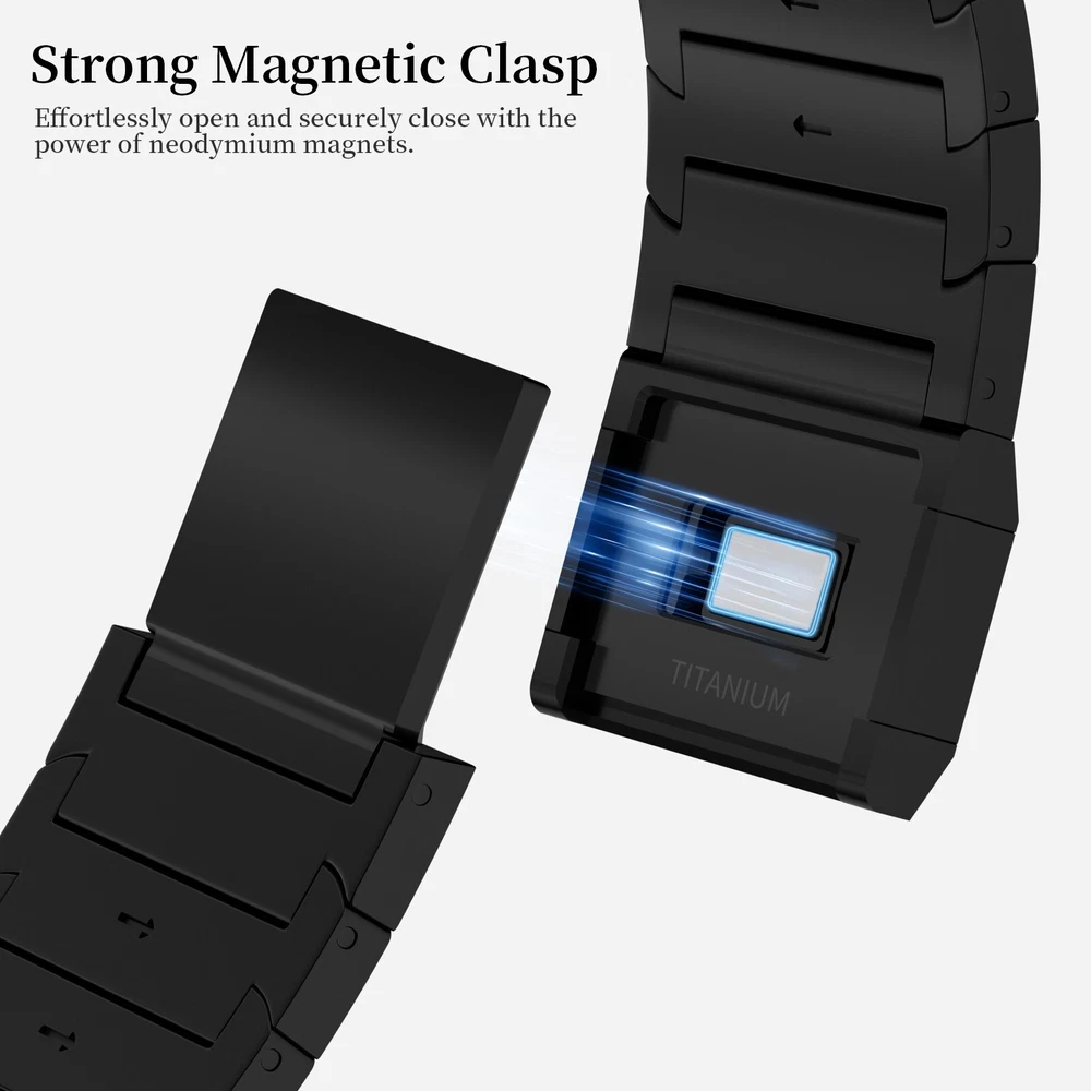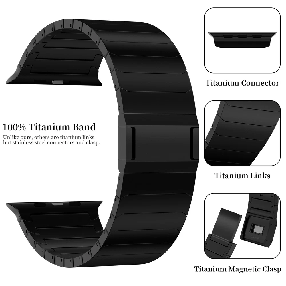 Specification Color Black Special Features Full titanium;DLC Coating Compatibility For Apple Watch Ultra 49mm / Series 10 46mm / Series 9 8 7 45mm / Series 6 5 4 SE2 SE 44mm Clasp Titanium Magnetic Clasp Connector Titanium Connector Titanium Grade Titanium Grade 2 Herring 800+HV Band Width 26mm Band Weight 72g(max) Band Thickness 3.4mm Band Length 210mm Clasp Thickness 5.5mm Wrist Size 150mm to 234mm Feature Lightweight;Corrosion-Resistant;Anti-Allergy Included Components Titanium watch band Warn tips: If you have specific requirements on packaging and components such as minor adjustment links、removal tool、tool pins and instruction, please contact online customer service. Product Description Full Titanium Band VS Titanium Band: All components include links, magnetic clasp, and connectors are crafted from titanium material, setting our bands apart from others with clasps and connectors made of non-titanium material 26MM Wider Design: The wider watch band best fits the Ultra. Design for any bold soul. Compatible with Apple Watch Ultra 49mm / Ultra 2 49mm / Series 10 46mm / Series 9 8 7 45mm / Series 6 SE 5 4 44mm. Fit wrist size 6.7" to 9.2"(170 to 234mm). We provide a minor adjustment link to adjust the band to fit for your wrist accurately Lightweight and Corrosion-Resistant: 72g(max). Experience the extraordinary benefits of full titanium - our titanium bands are not only lighter but also more corrosion-resistant than non-full titanium alternatives. Dive into the ocean or pool without worry, as our bands are built to withstand various environments Titanium Connectors: CNC high precision craftsmanship and unique titanium connectors ensure a tight and stable connection with original watch interface. Make sure your watch band stays securely attached, providing a seamless and comfortable fit Titanium Magnetic Buckle & Hook and Loop Closure: Sensitive skin? No problem. Our titanium magnetic buckle is an excellent choice, offering comfort without compromising style. Say goodbye to allergies associated with non-full titanium watch bands. Ensuring your watch band is comfortable to wear all day long. Magnetic buckle & hook and loop closure lock your watch easily and securely DLC (Diamond-Like Carbon): Our aerospace-grade titanium bands are not only a perfect match in material and color for the original watch, but also The DLC coating gives it extra durability and protection, far higher wear resistance than non DLC