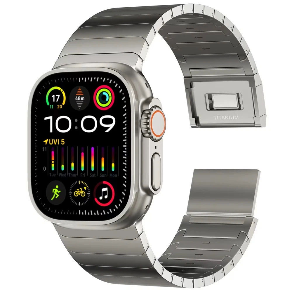 Specification Color TItanium Special Features Full titanium;DLC Coating Compatibility For Apple Watch Ultra 49mm / Series 10 46mm / Series 9 8 7 45mm / Series 6 5 4 SE2 SE 44mm Clasp Titanium Magnetic Clasp Connector Titanium Connector Titanium Grade Titanium Grade 2 Herring 800+HV Band Width 26mm Band Weight 72g(max) Band Thickness 3.4mm Band Length 210mm Clasp Thickness 5.5mm Wrist Size 150mm to 234mm Feature Lightweight;Corrosion-Resistant;Anti-Allergy Included Components Titanium watch band Warn tips: If you have specific requirements on packaging and components such as minor adjustment links、removal tool、tool pins and instruction, please contact online customer service. Product Description Full Titanium Band VS Titanium Band: All components include links, magnetic clasp, and connectors are crafted from titanium material, setting our bands apart from others with clasps and connectors made of non-titanium material 26MM Wider Design: The wider watch band best fits the Ultra. Design for any bold soul. Compatible with Apple Watch Ultra 49mm / Ultra 2 49mm / Series 10 46mm / Series 9 8 7 45mm / Series 6 SE 5 4 44mm. Fit wrist size 6.7" to 9.2"(170 to 234mm). We provide a minor adjustment link to adjust the band to fit for your wrist accurately Lightweight and Corrosion-Resistant: 72g(max). Experience the extraordinary benefits of full titanium - our titanium bands are not only lighter but also more corrosion-resistant than non-full titanium alternatives. Dive into the ocean or pool without worry, as our bands are built to withstand various environments Titanium Connectors: CNC high precision craftsmanship and unique titanium connectors ensure a tight and stable connection with original watch interface. Make sure your watch band stays securely attached, providing a seamless and comfortable fit Titanium Magnetic Buckle & Hook and Loop Closure: Sensitive skin? No problem. Our titanium magnetic buckle is an excellent choice, offering comfort without compromising style. Say goodbye to allergies associated with non-full titanium watch bands. Ensuring your watch band is comfortable to wear all day long. Magnetic buckle & hook and loop closure lock your watch easily and securely DLC (Diamond-Like Carbon): Our aerospace-grade titanium bands are not only a perfect match in material and color for the original watch, but also The DLC coating gives it extra durability and protection, far higher wear resistance than non DLC