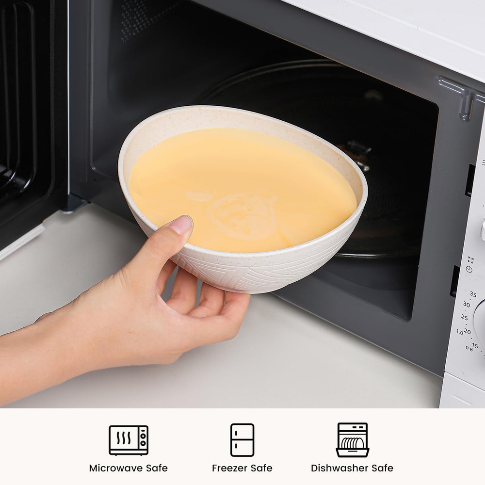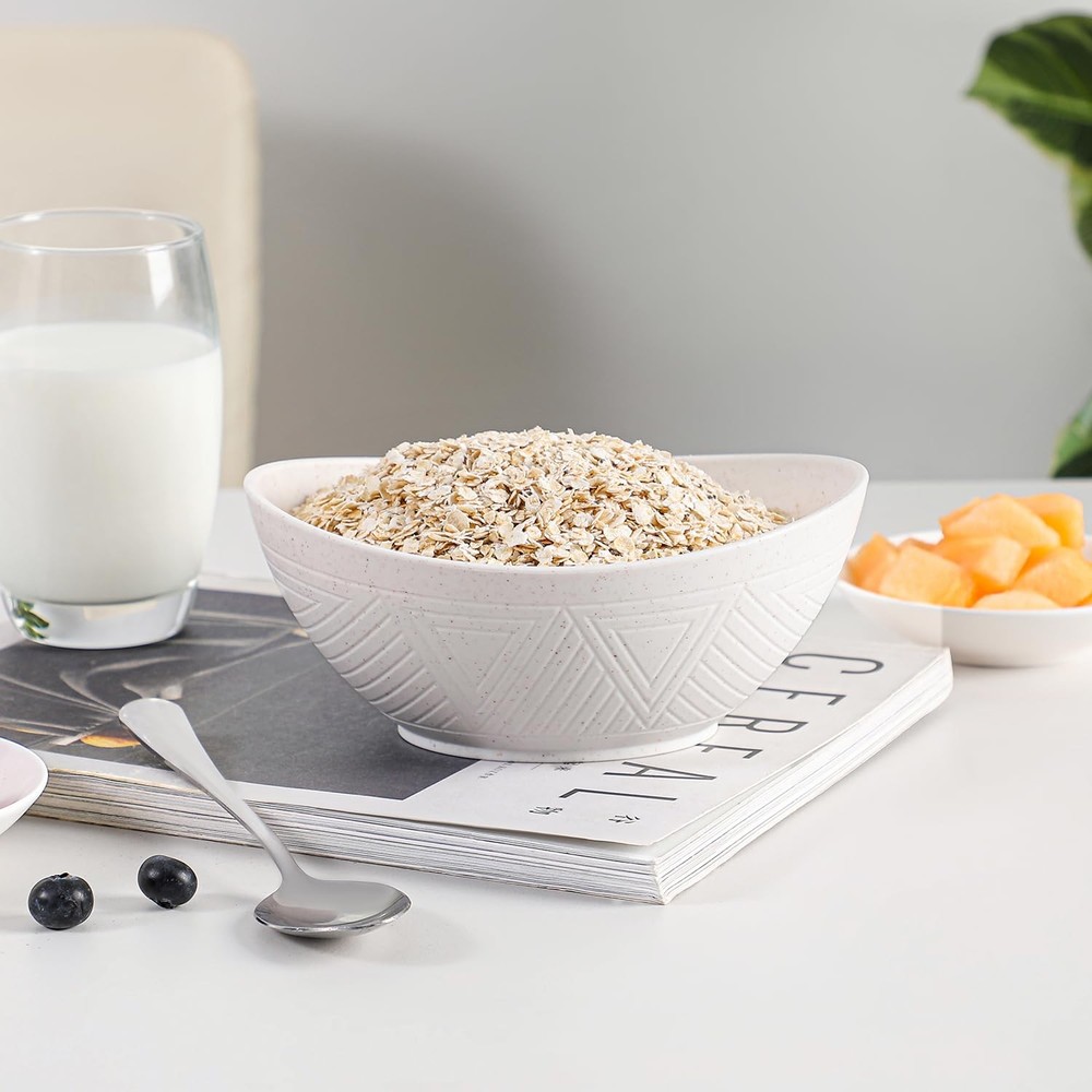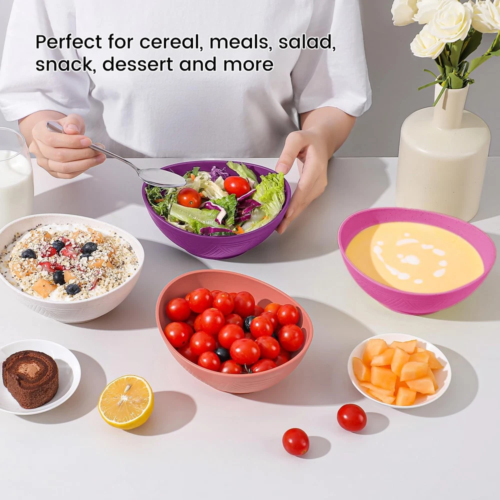 wheat straw bowls 26 oz snack bowls set of 4, made of wheat straw fiber and PP. Package includes: 4 pcs wheat straw bowls Capacity: 26 oz Shape: elliptical Color: white, rose, pink and purple 26 oz wheat straw bowls - the curved shape has a comfortable grip while enhancing your dining experience. Combination of aesthetics and functionality providing a comfortable dinning solution. The bowls set of 4 is made of wheat straw fiber and pp material which are BPA free. Providing a peaceful dining experience for your family with these wheat straw bowls. Our wheat straw bowls are lightweight and unbreakable compared to ceramic or glass bowls. No breakage when accidentally dropped, perfect for family usage. These plastic bowls reusable are easy to clean by hand wash or dishwasher. Microwave safe bowls can also be used in freezer. Note: The maximum temperature resistance is 248 ℉ (120℃). wheat straw bowls set of 4 have various color options, this set includes: white, rose, pink and purple. With a maximum capacity of 26 oz, these cereal bowls are perfect for daily usage such as cereal, salad, soup, snacks and popcorn without spillage. Wheat straw bowls are also great for everyday meals, parties, camping, traveling, etc. If you have any questions with these bowls, feel free to contact us and we will reply as soon as possible. 【Unique Shape and Pattern】 26 oz wheat straw bowls - the curved shape has a comfortable grip while enhancing your dining experience. Combination of aesthetics and functionality providing a truly comfortable and elegant serving bowls solution. 【Wheat Straw Bowls】 The bowls set of 4 is made of wheat straw fiber and pp material which are BPA free. Providing a peaceful dining experience for your family with these wheat straw bowls. 【Lightweight & Unbreakable】 Unlike ceramic or glass bowls that are heavy weight and fragile, our wheat straw bowls are lightweight and unbreakable. No breakage when accidentally dropped, perfect for family usage. 【Microwave & Dishwasher Safe】 These plastic bowls reusable are easy to clean by hand wash or dishwasher. Microwave safe bowls can also be used in freezer. Note: The maximum temperature resistance is 248 ℉ (120℃). 【Versatile Usage】 wheat straw bowls set of 4 have various color options, this set includes: white, rose, pink and purple. With a maximum capacity of 26 oz, these cereal bowls are perfect for daily usage such as cereal, salad, soup, snacks and popcorn without spillage. Wheat straw bowls are also great for everyday meals, parties, camping, traveling, etc. If you have any questions with these bowls, feel free to contact us and we will reply as soon as possible.