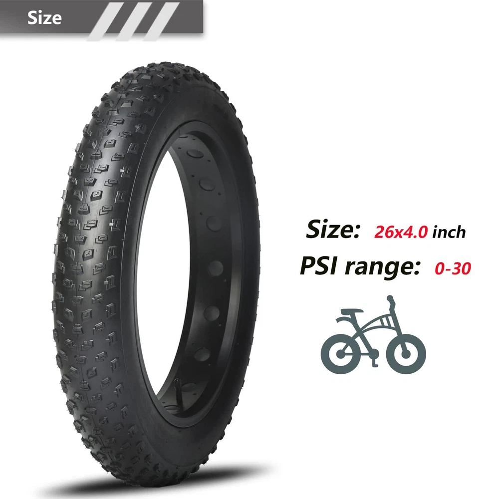 26x4.0 inch Fat Bike Tire 60TPI for Electric Bike Fat Bicycle Tire 4.0 inch Mountain Bike Tire (26x4.0 inches) SIZE:26x4.0inch Fat Bike Tire.4.0 inch extra wide tires, Provides very good stability for your riding, At the same time, it also has excellent comfort and shock absorption. Suitable for a variety of complex road conditions. 60 TPI for High Safety.In order to improve the puncture prevention level of the fat tire,it uses the 60tpi manufacturing process to make it have a better puncture prevention capability. Compared with 30tpi or 27tpi, it also has a+20% improvement in safety. Super Strong Grip.This fat bicycle tire has a unique tread pattern design, which gives it excellent grip and slip resistance, It can easily ride on mountain roads or waterlogged roads, as well as on snow roads. Foldable and Easy to Carry.This fat tire can be folded, Although it looks large, it uses a lightweight design, which is very convenient for transportation or carrying. For example, it can be used as a spare tire and put it in your bag when you ride outside. Note.SIZE:26X4.0inch fat bike tire TPI:60, PSI Range:0-30, no inner tube, Foldable. if any issue, pls feel free to contact us. Shipping We offer FREE shipping on all orders! We ship within Three business days of payment, usually sooner. We use a selection of shipping services such as UPS, FedEx, USPS etc. We only ship to the lower 48 states, no APO/FPO addresses or PO Boxes allowed. Local pickups and combined shipping options are not provided at this time. Return You can return a product for up to 30 days from the date you purchased it. Any product you return must be in the same condition you received it and in the original packaging. Please keep the receipt. Payment We accept payment by any of the following methods: PayPal Please pay as soon as possible after winning an auction, as that will allow us to post your item to you sooner! Feedback Customer satisfaction is very important to us. If you have any problem with your order, please contact us and we will do our best to make you satisfied. Contact Us If you have any queries, please contact us via ebay. We usually respond within 24 hours on weekdays. Please visit our eBay store to check out other items for sale! Thank you for shopping at our store.