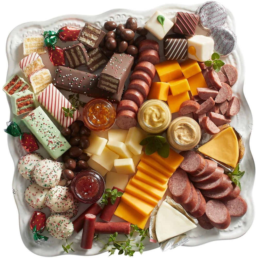 GOURMET SAVORY DELIGHTS: Indulge in a variety of savory Original, Garlic, and Caraway summer sausages. Enjoy a range of cheeses, including Cheddar, Brick, and Colby, accompanied by flavorful cheese wedges. Perfect for charcuterie boards and other holiday celebrations. SWEET TREAT EXTRAVAGANZA: Enjoy an array of delectable bonbon cookies, mini tortes, and Petits Fours for the perfect sweet touch to your holiday season with this gift box. CHOCOLATE LOVER’S PARADISE: Delight in mouthwatering chocolate-covered peanuts and a selection of fruit spreads and mustards. FESTIVE PRESENTATION: All these gourmet treats are elegantly presented in a holiday red gift box, making it the perfect gift for loved ones or a delightful addition to your holiday celebrations. GENEROUS SIZE: With a net weight of 2 lbs. 1 1/4 oz., this Swiss Colony food gift box offers an abundance of delicious options to share and savor during the festive season. This gift box is perfect for Thanksgiving, Christmas, thank you, and appreciation events. Your friends and family are sure to love the selection of goodies. VERSATILE: This food gift set is the perfect choice for anyone—adults, men, women, kids, families, teens, and students of all ages. Our gift sets offer convenient delivery and make heartfelt edible snack gifts for moms, dads, grandparents, teachers, friends, coworkers, bosses, church groups, clients, and more. Product Description The Swiss Colony is the very first and longest-running specialty food catalog in the United States. Our award-winning food gifts are handcrafted with world-class Wisconsin dairy and other premium ingredients in the largest hand-decorating bakery in the country. From traditional favorites to fresh inspired novelties, we offer one of the largest selections available anywhere of festively packaged gifts for every occasion. At The Swiss Colony, we help create memorable moments that connect families at important times through the year, from generation to generation. Chris Mouse Gifts of Perfect Taste The Swiss Colony is known for offering the best holiday food gifts…but we're more than just Christmas! Our incredible handcrafted baked goods, chocolates and other candies, and award-winning Wisconsin cheeses and sausages are great at any time of the year. Trust The Swiss Colony to deliver unique, delicious gifts for every occasion: Christmas Gifts Thanksgiving Gifts Halloween Gifts Birthday Gifts Valentine's Day Gifts Easter Gifts Mother's Day Gifts Father's Day Gifts Our Heritage The Swiss Colony began by shipping 50 packages of cheese as Christmas gifts in 1926, and eventually built the country’s largest hand-decorating bakery. Founded by Ray Kubly in 1926, we started out selling fine Wisconsin cheeses and eventually added sausages, hams and handcrafted baked goods and confections. With the nation’s largest hand-decorating bakery, we proudly combine the latest creations with award-winning Petits Fours, Butter Toffee, Christmas Fruitcakes and other favorites. The Swiss Colony is your edible gift headquarters…and we’re a name you can trust, because we’ve been doing food gifts right for more than 95 years. 27 Favorites Choose from our Green Spring box or Holiday Red box. When you want a can’t-miss holiday food gift, our single most popular gift box delivers terrific variety and unparalleled quality in an affordable package. With a large variety of cheeses, sausages and sweet treats, 27 Favorites is a one-stop party gift. The treats are in snack sizes that are easy to share with family and friends, and you can experience a nice range of tastes in a delicious sampler. 27 Favorites is truly a party in a box! Everything is beautifully arranged in an impressive gift that will keep everyone munching in style through the holidays! 2 pounds 1 1/4 ounces net weight each What’s Included: Summer Sausages (Original, Garlic and Caraway) Cheeses (Cheddar, Brick and Colby) Mini Dobosh Tortes Petits Fours Cheese spreads, fruit spreads and mustards Chocolate covered peanuts Bonbon cookies Assorted chocolates and candies Why is This Gift Box Our Top Seller? For years now, our 27 Favorites assortment has been our best-selling gift. Maybe it’s because it contains a number of The Swiss Colony’s famous products (27, to be exact). Maybe it’s the number 27. All we know is that many of our customers list 27 Favorites as their go-to gift when they want to make a good impression. Food Gifts from Our Family to Yours When you order gifts from The Swiss Colony, you can be sure your friends and family will love them. That’s because they were made by us and the people we know. Our baked goods are made and hand-decorated by hardworking people just like you here in our bakery, and each gift basket or box is carefully arranged and packaged so it looks great when it arrives…because we give them as gifts, too! Gift Baskets for Any Budget Our handcrafted food gifts are perfect for anyone on your list—whether you want a stocking stuffer or handout gift for the paper carrier or babysitter, or a grand assortment of treats artfully arranged for someone special. Offer a Sampling of Our Very Best Food Gifts Nestled in the heart of Wisconsin’s dairy country, The Swiss Colony began by bringing fine regional cheeses to a wider audience. And nothing goes better with cheese than our very own summer sausage recipes. Add handcrafted pastries and candies from our bakery, and you’ve got endless combinations of holiday treats. Each assortment provides a delicious sampler of our best-selling products to liven up any party or delight a treasured friend or family member.