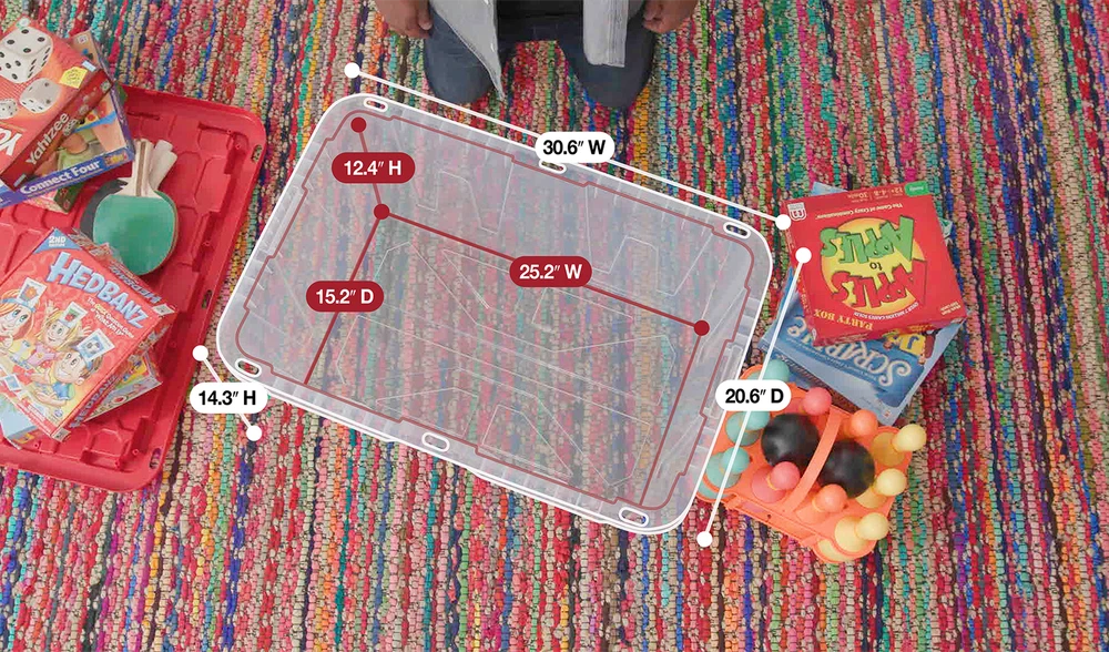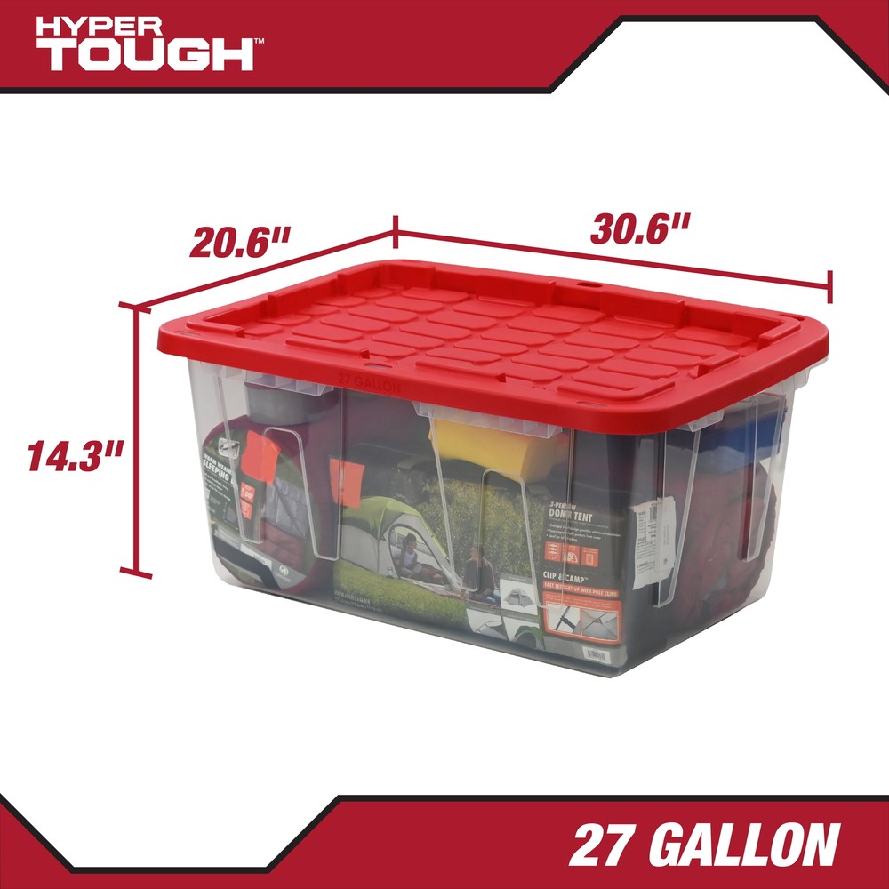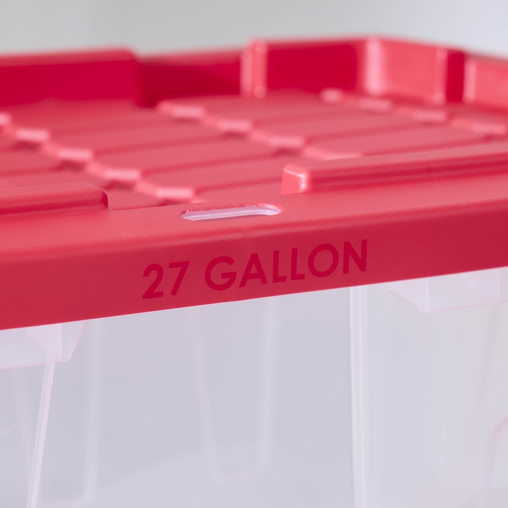 Discover the durable and reliable 27 Gallon Plastic storage container, your perfect solution for effortless organization and storage for all ages. Designed for durability, this sturdy container withstands daily use to keep your valuables safe and secure. The clear construction with a red lid allows for easy viewing of contents, eliminating the need to search through opaque bins. The 2-point red Snap Lid closure ensures a tight seal, protecting belongings from dust and damage. These containers are not only built to last but also feature a stackable design for efficient use of space. Stack them high or nest them together to maximize your storage potential without sacrificing accessibility. Equipped with preformed holes, they offer added security when secured with zip ties or locks. Whether organizing a workshop, decluttering your home, or storing keepsakes, the 27 Gallon Plastic storage container is a dependable choice. From bedrooms to basements, or garage to attic, it's the clear, secure solution for a tidier, more organized space with Storage Totes. 27 Gallon Clear Storage Bin, Red Lid, Storage for all ages 27 Gallon Capacity, 108 Quarts Outer Dimensions: 30.6 IN W x 20.6 IN D x 14.3 IN H (77.7 cm x 52.3 cm x 36.3 cm) Comfort carry handles Easy to clean surface, wipe with damp cloth Stacks up to 5 storage bins high for maximum vertical storage
