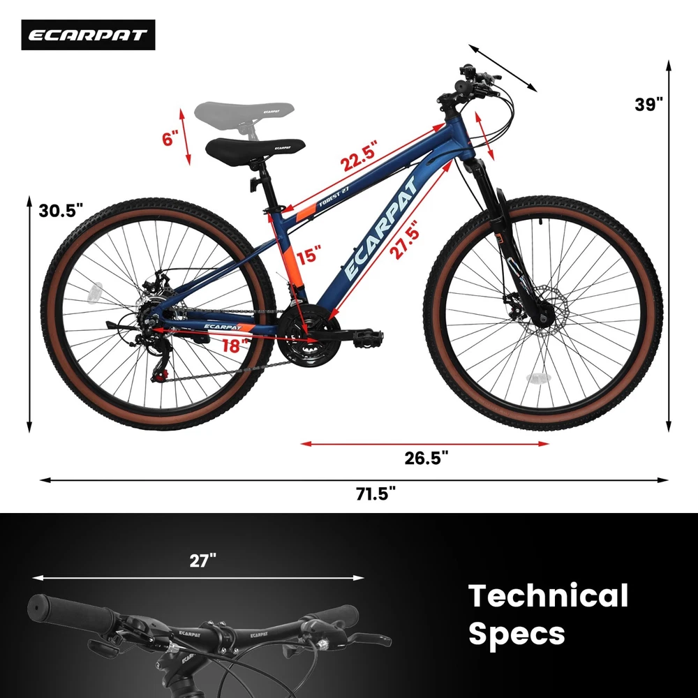 ECARPAT A27302 27 inch wheel mountain bike, 21-speed disc brake trigger transmission, aluminum frame unisex mountain bike Specification Shipping Payment Warranty After Service Communication ECARPAT A27302 27 inch wheel mountain bike, 21-speed disc brake trigger transmission, aluminum frame unisex mountain bike Product details 【Aluminum alloy frame】 With an aluminum alloy frame, it has high rigidity and strong shock absorption, and the upgraded interior looks solid and beautiful. Blue and orange with a low-key sense of luxury. 【21-speed Shimano Drivetrain】 Smooth shifting with Shimano's handles ensures smooth shifting during riding. 【Front and rear dual disc brakes】 Dual disc brakes for more precise and tight parking and control. 【QUICK INSTALLATION IN 20 MINUTES】 The Elecony bike arrives 85% assembled and includes free pedals and assembly tools. It is easy enough to put together in 20 minutes. The bike can be fully assembled with ease with the help of tutorial videos, and we are more than happy to help with any problems you may have during the assembly process. Product details: ECARPAT A27302 27 inch wheel mountain bike, 21-speed disc brake trigger transmission, aluminum frame unisex mountain bike Product Type: General Item Main Material: Aluminium Dimensions: Assembled Length (in.): 71.50 Assembled Width (in.): 27.00 Assembled Height (in.): 39.00 Assembled Weight (lbs.): 35.00 Package Length (in.): 56.00 Package Width (in.): 29.00 Package Height (in.): 8.50 Package Weight (lbs.): 42.00 Shipping Our shipping rates include the cost of shipping, handling, packaging and related manpower costs. We offer various modes of shipping. Please choose according to your needs. Combine shipment is available! Items are generally shipped out the next business day after your payment has been verified (Sat. & Sun. excluded). Customers out of America are recommended to contact us for postage cost before placing an order. We are not responsible for undeliverable address. We reserve the right to charge the shipping fee again for returned items due to wrong address. Sorry local pickup is not available. After Service Return Policy Marketplace RMA guidelines must be followed for processing all return requests: Unshipped Items Return Policy:25 % restocking fee will be charged for unshipped item returns without valid reason within 30 days of the original order being processed. Shipped Items Return Policy:For quality or other issues, the Buyer can request a refund or reshipment within 7 days after the end customer has received the item. The reshipment fee will be borne by the Seller. Warranty Policy: Marketplace RMA guidelines must be followed during after-sales services Beginning from the date of delivery, purchased products include a 3 month warranty.In the event of manufacturing defects, the Buyer can request a refund, partial reshipment or full reshipment within the warranty period. Please note that the warranty policy does not apply to the following situations: Damage resulting from negligence, abuse, normal wear and tear or natural disaster and accidents, including but not limited to: burns, cuts, tears abrasions, scratches, watermarks, indentation or pet damage. Damage resulting from unauthorized modifications, except with written approval from Seller. Products not purchased through the Giga Cloud Marketplace. Products with their own individual warranty policy. Please contact us first for after-sales questions. If you need to return the goods, please be sure to return them to our designated warehouse address. Otherwise, we reserve the right to refuse your refund request. 【 Specified return warehouse address: OUXIN, 8167880430, Suit B 1555 S Dupont Ave, Ontario, CA, 91761】 Communication Before bidding, please read the above terms and conditions carefully. The bidding winner will be considered to agree with all terms and conditions listed. We have always been doing our best to provide the best service and reliable products for every customer. Please contact us to resolve the issue before leaving negative feedback.