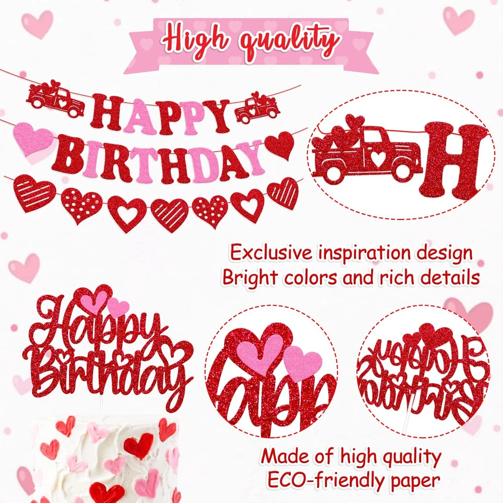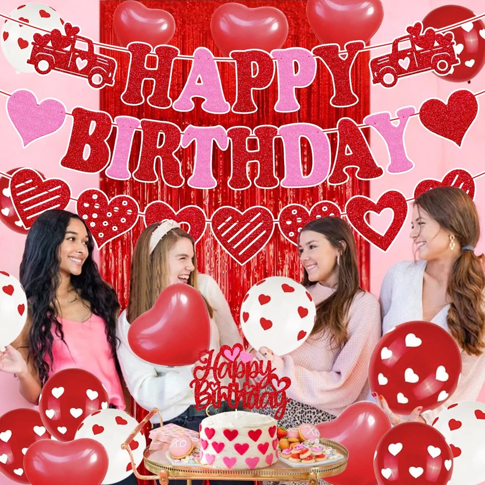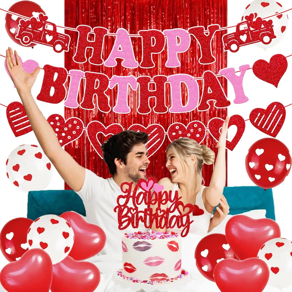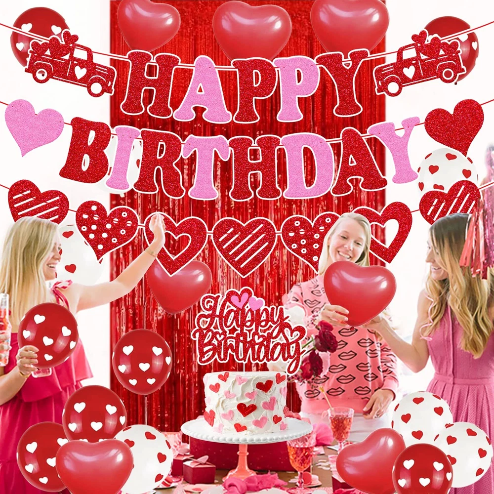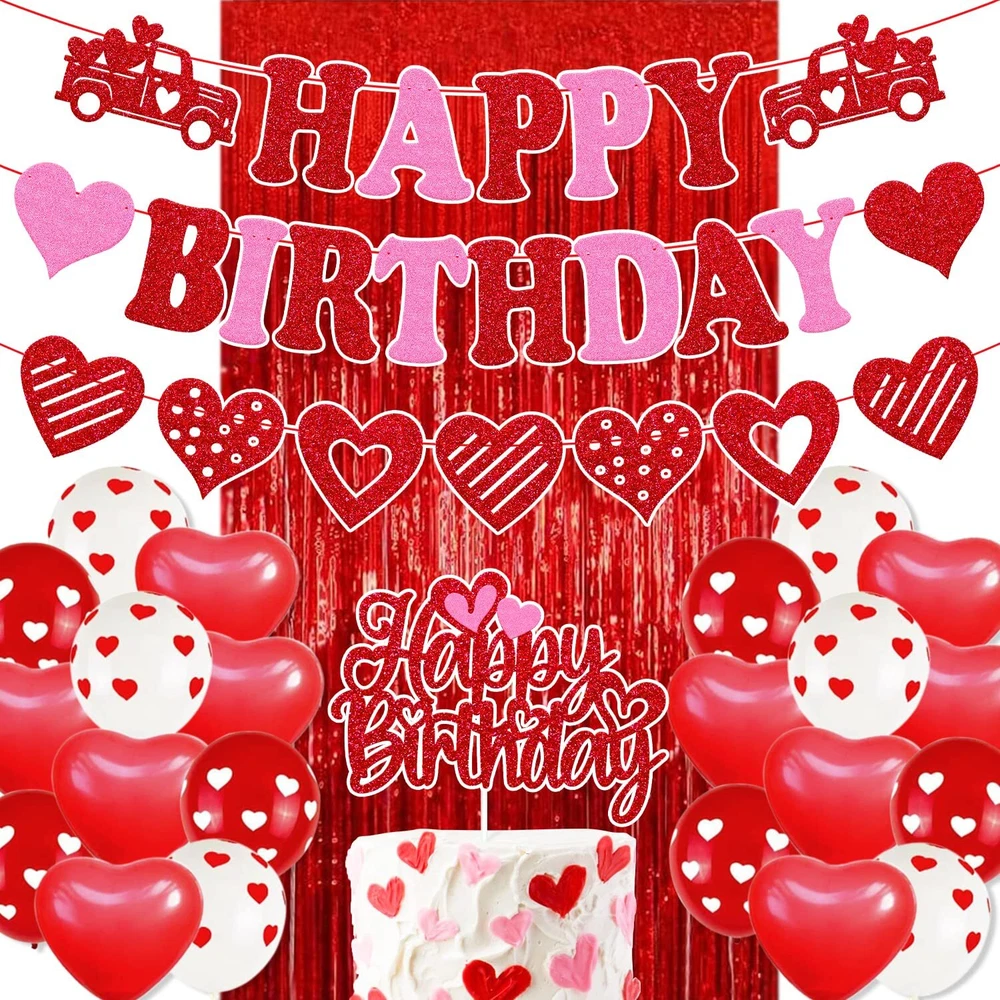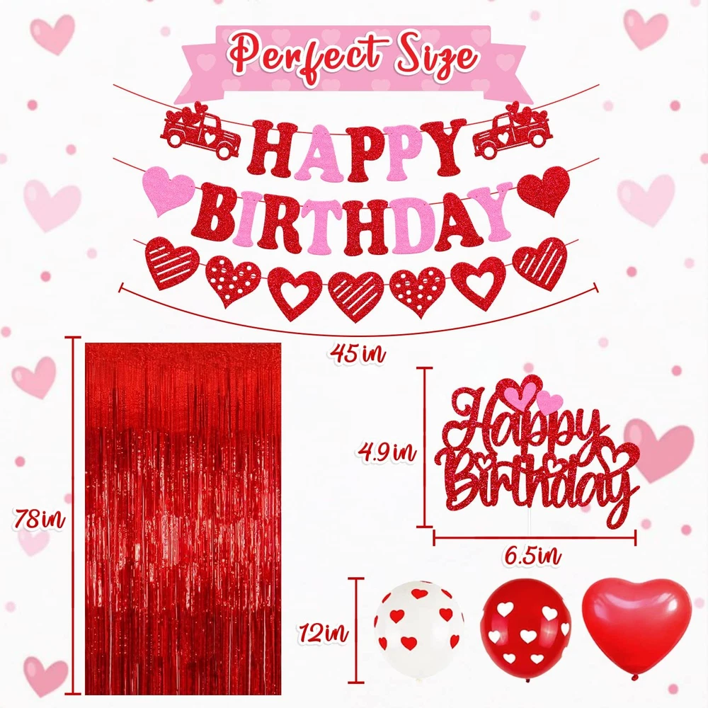 27 PCS Valentine's Birthday Decorations Happy Birthday Banner Valentine's Birthday Cake topper Red Hanging Swirls Latex Balloons Red Foil Curtains Backdrop Heart Wedding Car Romantic Baby Shower Theme for Bday Party Supplies PACKAGE INCLUDES:3 PCS valentine’s day themed happy birthday banner, 1 Pack valentine’s day themed happy birthday cake topper, 10 PCS red love heart shape latex balloons, 6 PCS red balloons with white hearts ,6 PCS white balloons with red hearts,1 pc red foil curtain. PERFECT SIZE:Valentine’s day themed happy birthday banners are pre-strung. Each banner is approx 45 inches in length. Made of high quality glitter red/pink cardstock, the reverse side is white.Valentine’s day themed happy birthday cake topper is pre-assembled. The valentine’s day themed happy birthday cake decorations is approx 4.9” inches tall x 6.5” inches wide.The red/white latex balloon is approx. 12” inches,red foil curtain is approx 78” inches high. PERMIUM QUALITY PARTY DECORATIONS:Valentine’s day themed birthday party banner decorations are made of premium glitter red/pink cardstock. Valentine’s themed birthday cake topper is made of double side red card stock,Sturdy cardstock and glitter will not shed off. PREMIUM QUALITY PARTY SUPPLIES: The 12” inches balloons are made of sturdy and biodegradable natural latex. Thicker and stronger than general balloons. Don't worry about blowing or exploding when inflated gas.Red foil curtain are durable and can be used many times. Will not fade when soaked in water or exposed to the sun. PRE-ASSEMBLED: Valentine’s day themed birthday banner will comes fully assembled and NO DIY, just unpack and hang it on the wall or other places you want to decorate .Valentine’s day themed birthday cake topper is pre-handmade, Great for the 8-10 inches party cake. High-Value Valentine’s Day Themed Birthday Party Supplies:All accessories of the valentine’s day themed birthday decorations are essentials for your romantic party.Valentine’s day themed birthday party decorations is sure to be a hit for your romantic themed birthday party! The addition of this precious and sparkle happy birthday party decorations will be the perfect touch to any ages birthday decorations.