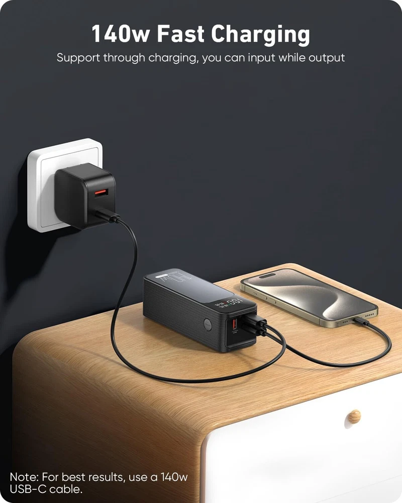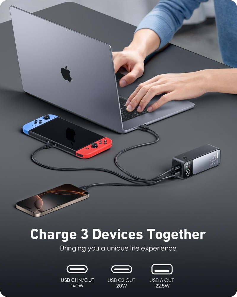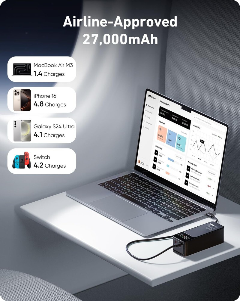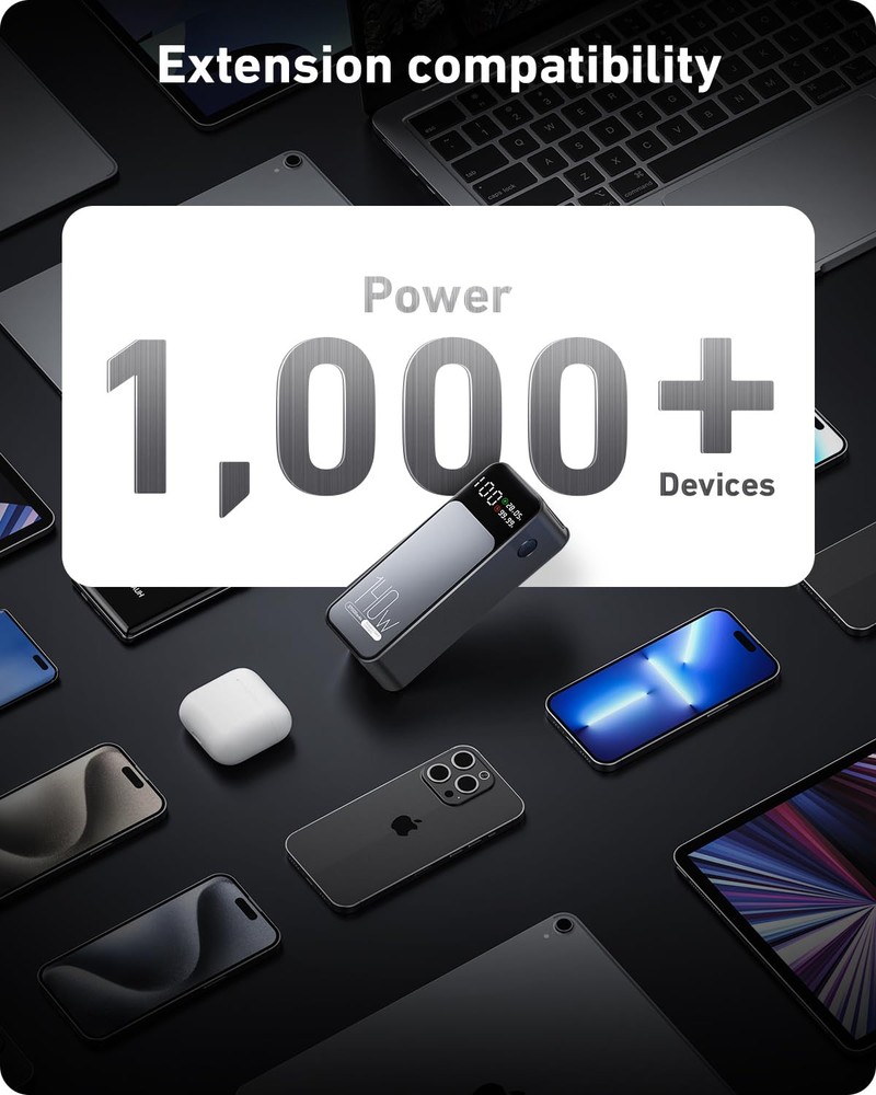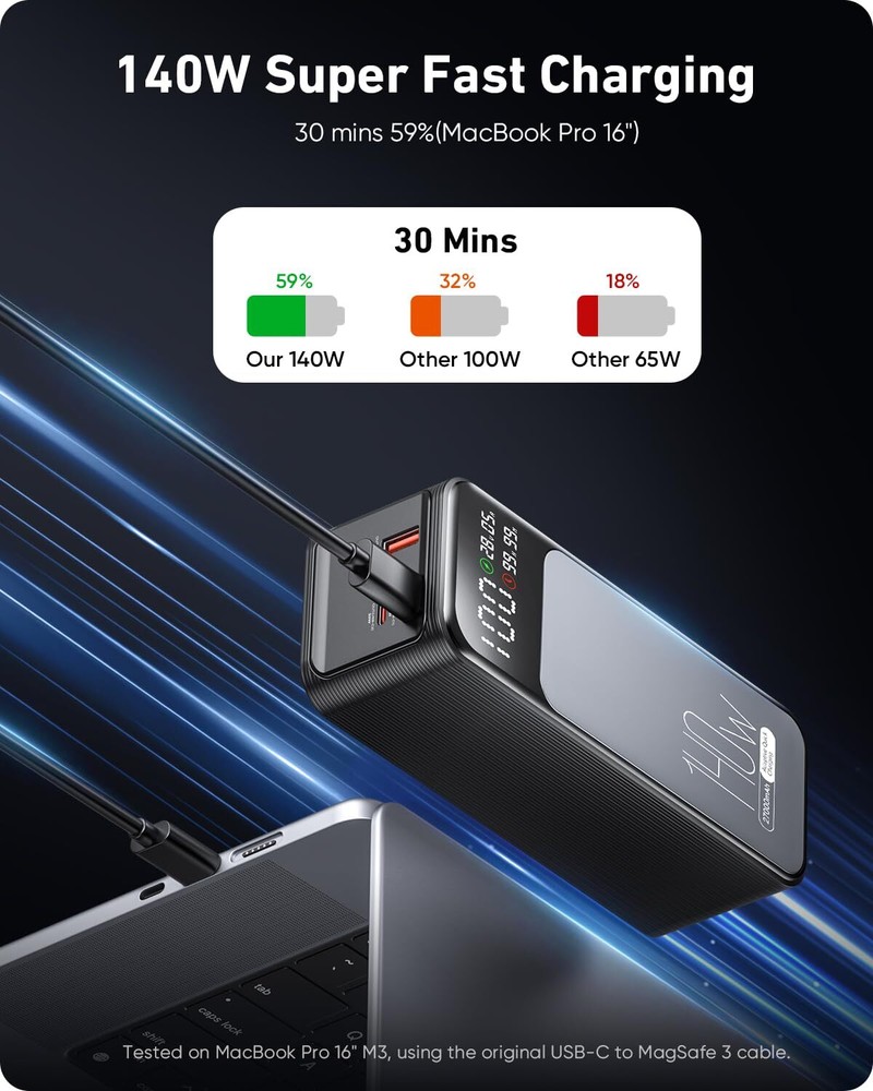 140W Two-Way Fast Recharge: Portable charger power bank with PD3.1 and QC4+ etc for fast charging to laptops and phones. In just 30 minutes, you'll have a MacBook Pro 16" at 59%, SteamDeck at 57%, iPhone 16 Pro Max at 70%. The laptop power bank refills its own battery quickly in 1 hour. It’s ready to go again in no time, keeping up with your fast-paced lifestyle. High-Capacity Power for All Devices: With a 27,000mAh capacity, this laptop power bank can recharge MacBook Air M3 up to 1.4 times or iphone 16 up to 4.8 times. Power through your day, ensuring your devices stay powered during long trips or heavy usage. Convenient & Airline Approved: Get through TSA and boardyour flight on time with this laptop battery power bank that meets boarding standards.This laptop portable charger is the size of a soda can.Making it a perfect choice for light travel or commuting. Smart LED Display & Super bright flashlight: The smart digital display on this portable laptop charger provides real-time insights on output/input power and estimates the recharge time, keeping users informed and their devices ready.This laptop portable charger is also equipped with a super bright flashlight. With 4 modes, it can help you light up the darkness. Perfect companion for power outages, night walks, reading and emergencies. Wide Compatibility: Portable laptop charger supports power 1,000+ devices from big to small. Whether you have an Android, Apple, or another brand of device, this charger's got you covered. A universal solution for all your charging needs.
