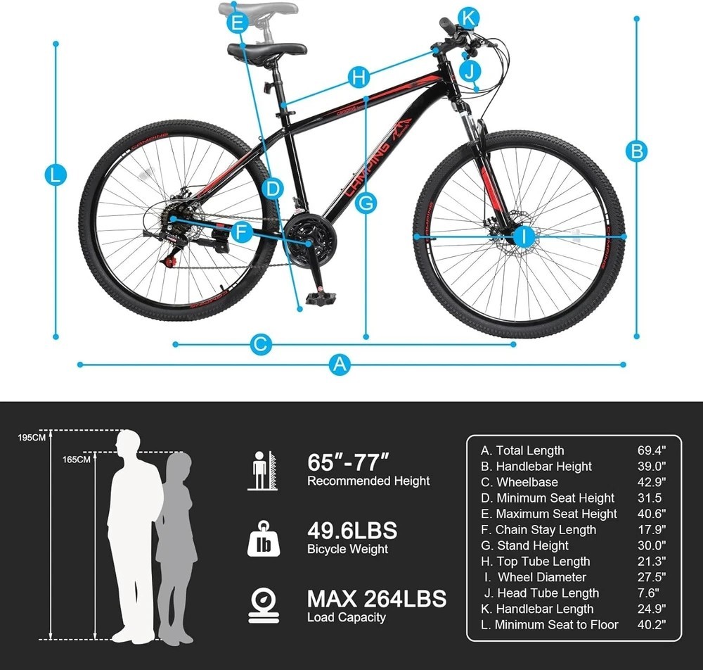 About this item PROFESSIONAL 21-SPEED SHIFTING SYSTEM: The 21-speed transmission system with quick, precise gear changes makes this mountain bike can easier to adapt to different terrain. Made of non-slip and explosion-proof materials, our tires can easily conquer gravel paths, dirt paths, and rocky roads POWERFUL SHOCK ABSORBING AND BRAKING: The shock-absorbing cushion is matched with a thickened shock-absorbing front fork that is fitted with a double shock absorption effect. Mechanical dual disc brakes have a strong braking force and can provide a more sensitive braking response than other brakes COMFORTABLE RIDING EXPERIENCE: Lightweight aluminum alloy wheels are matched with specially designed spokes that can better assist reduce wind resistance during riding. The lock-out suspension fork handles bumps and dips for a smoother-feeling ride DURABILITY & ADJUSTABILITY: Made of high-carbon steel frame, this adult bikes is strong and durable and will not deform. This mountain bike features a quick-adjust seat post clamp, you make easier adjustments seat to the right height EASY TO INSTALLMENT: The 27.5-inch bike arrives with 85% assembled. You only need to assemble the handle, cushion, front wheel and pedal, adjust the brake and gear to complete the assembly. PLEASE CONTACT US BY EMAIL IF YOU ENCOUNTER ANY PROBLEM THAT CANNOT BE RESOLVED Product Description Shipping We offer FREE shipping on all orders! We ship within Three business days of payment, usually sooner. We use a selection of shipping services such as UPS, FedEx, USPS etc. Local pickups and combined shipping options are not provided at this time. Return You can return a product for up to 30 days from the date you purchased it. Any product you return must be in the same condition you received it and in the original packaging. Please keep the receipt. Payment We accept payment by any of the following methods: PayPal Please pay as soon as possible after winning an auction, as that will allow us to post your item to you sooner! Feedback Customer satisfaction is very important to us. If you have any problem with your order, please contact us and we will do our best to make you satisfied. Contact Us If you have any queries, please contact us via ebay. We usually respond within 24 hours on weekdays. Please visit our eBay store to check out other items for sale! Thank you for shopping at our store. Disclaimer We are working with different suppliers in USA to deliver the item to your doorstep. If you have any issues regarding the item, Feel free to ask.
