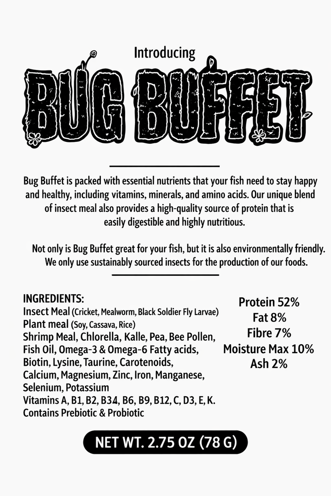 2.75oz Bug Buffet Insect Based Fish Food – High Protein Treat Provide your fish with a nutritious, protein-rich treat with Bug Buffet Insect Based Fish Food . Perfect for freshwater and marine aquariums, these insect-based morsels support healthy growth, vibrant colors, and active fish. Features: All-natural insect formula, high in protein for a balanced diet Promotes health, growth, and vitality Easy to feed as a daily treat or dietary supplement Ships from a USA distributor for fast, reliable delivery Safe and suitable for a variety of fish species Give your fish the natural nutrition they need with Bug Buffet , a healthy and delicious aquarium treat.!