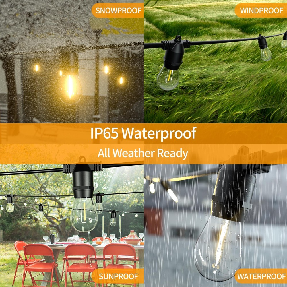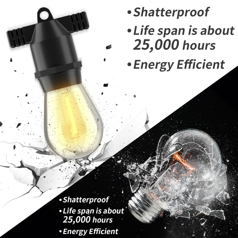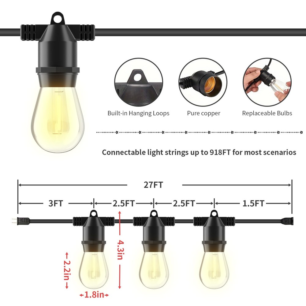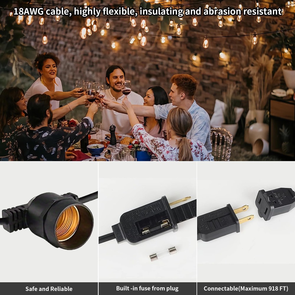 27FT LED Outdoor String Lights, IP65 Waterproof, S14 Shatterproof Outside String Lights (Maximum 918FT) Edison Vintage Bulbs Patio, Balcony, Deck, Garden Lights 【Ultra Energy-Saving】These stylish and functional LED energy-saving outside string lights dramatically reduce your 95% electricity bills compared with incandescent bulb ones. 30,000 hours long lifespan could reduce maintenance costs on changing bulbs frequently. 【Weatherproof and Shatterproof】 Plastic bulbs assured you and your family safe while hanging the string lights for the patio, free worry from glass shards, and greatly reduce bulb change especially for outdoor use. IP65 waterproof patio string lights can withstand snow, sun, dampness, wind, rain, and extreme temperatures for outside use. Inside the E26 socket is pure copper, faster electric conduction, less heating. 【Vintage Bistro Ambience】 bistro lights use vintage Edison bulbs to create a great ambience on your patio. These outdoor party lights are bright enough to grill and eat, without being overpowering. Install by attaching with a clip or a stake in the ground. They put out 2,700K warm white light and the life is up to 30,000 hours. 【Connectable and easy to install】 Each outdoor hanging lights strand contains 10 (totally 20) E26 based hanging sockets, provided with 1W S14 LED bulbs(*22). The distance between bulbs is approximately 2.5FT. These Edison string lights can end to end connect up to 34 sets, which is long enough for all kinds of activities! Built-in 0.25 inch hanging loops are convenient for using cup hooks, guide wires, zip ties, or screw nails to hang the string lights for the patio perfectly. 【Applications】 These LED string lights are suitable for indoor, outdoor, dorm, café, bistro, camping, balcony, gazebo, canopy, house, village, apartment, festival, wedding, birthday, Christmas, party decoration