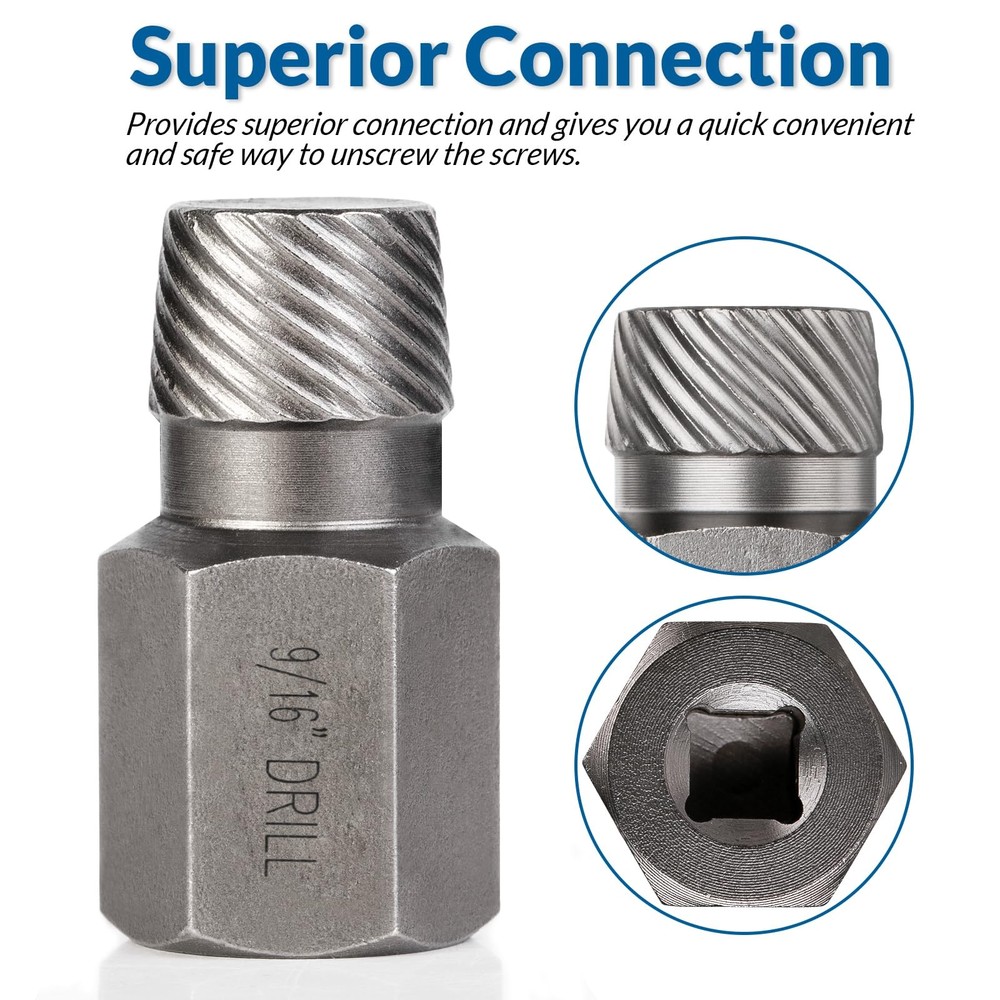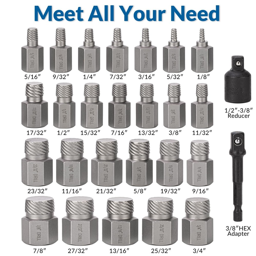 The 27PCS Screw Extractor Set is a comprehensive tool kit designed to help professionals and DIY enthusiasts easily remove damaged studs, bolts, and screws. This set is perfect for various applications such as automotive repairs, construction projects, and household maintenance. The extractor set includes 27 different pieces, each specifically designed to tackle different sizes and types of damaged fasteners. The set features a 3/8" inch drive hex-head, providing a secure grip and compatibility with standard ratchets, sockets, and wrenches. The multi-spline rounded bolt remover tool is the highlight of this set. It is engineered with precision to grip rounded, damaged, or stripped bolts and screws firmly. This allows for effective extraction without further damaging the surrounding materials. Crafted from high-quality materials, the screw extractor set is built to withstand heavy-duty use and provide long-lasting performance. The reliable construction ensures that the extractors maintain their shape and grip, even when dealing with stubborn or rusted fasteners. Using the 27PCS Screw Extractor Set is straightforward and user-friendly. Simply select the appropriate extractor from the set, insert it into the damaged fastener, and apply clockwise force to loosen and remove the fastener. The set also comes with a handy storage case, keeping all the pieces organized and easily accessible. Investing in the 27 PCS Screw Extractor Set will save you time and effort when dealing with damaged fasteners. No more frustration or wasted money on expensive replacements - this set provides a cost-effective solution to remove damaged screws, bolts, or studs with ease and precision. 【Easy Removal】Our bolt extractor set come with double head stud extractor set can be connected directly with a wrench, without the need for a connecting sleeve. Solve the problem of difficulty in removing damaged bolts in tight spaces. 【Portable and Storable】This easy out extractor set is placed in a storage box for easy access and portability, you can perform maintenance like a pro anytime anywhere. Multi spline extractor removal tool is also easy to operate for a bike, boat, truck or SUV. 【Sturdy and Solid】Each stripped screw and bolt extractor is made of high hardness chrome-molybdenum steel for superior durability. The material of molybdenum steel and the complex processing make the extractor harder. Each surface is precision machined and resistant to corrosion. Internal left-handed spiral design for extra grip and faster tapping. 【Excellent Compatibility】All the stud removal socket set's sizes are engraved on the socket for easy identification.The screw bolt extractor remover contains 7/8",27/32",13/16",25/32",3/4",23/32",11/16",21/32",5/8",19/32",9/16",17/32",1/2",15/32",7/16",13/32",3/8",11/32",5/16",9/32",1/4",7/32",3/16",5/32",1/8", and a 3/8"-1/4" hex adapter, a 3/8"-1/2" hex adapter, meets almost all your needs. 【Versatile usage】Suitable for both power tools and hand tools, including Wrench/ Ratchet/ Drill/ Impact. The high-density spiral design helps faster remove broken screws, bolts, nuts, studs, fittings, threaded pipes, and pins. Not only as automotive tools, but also as a helper of home decor or craft production.