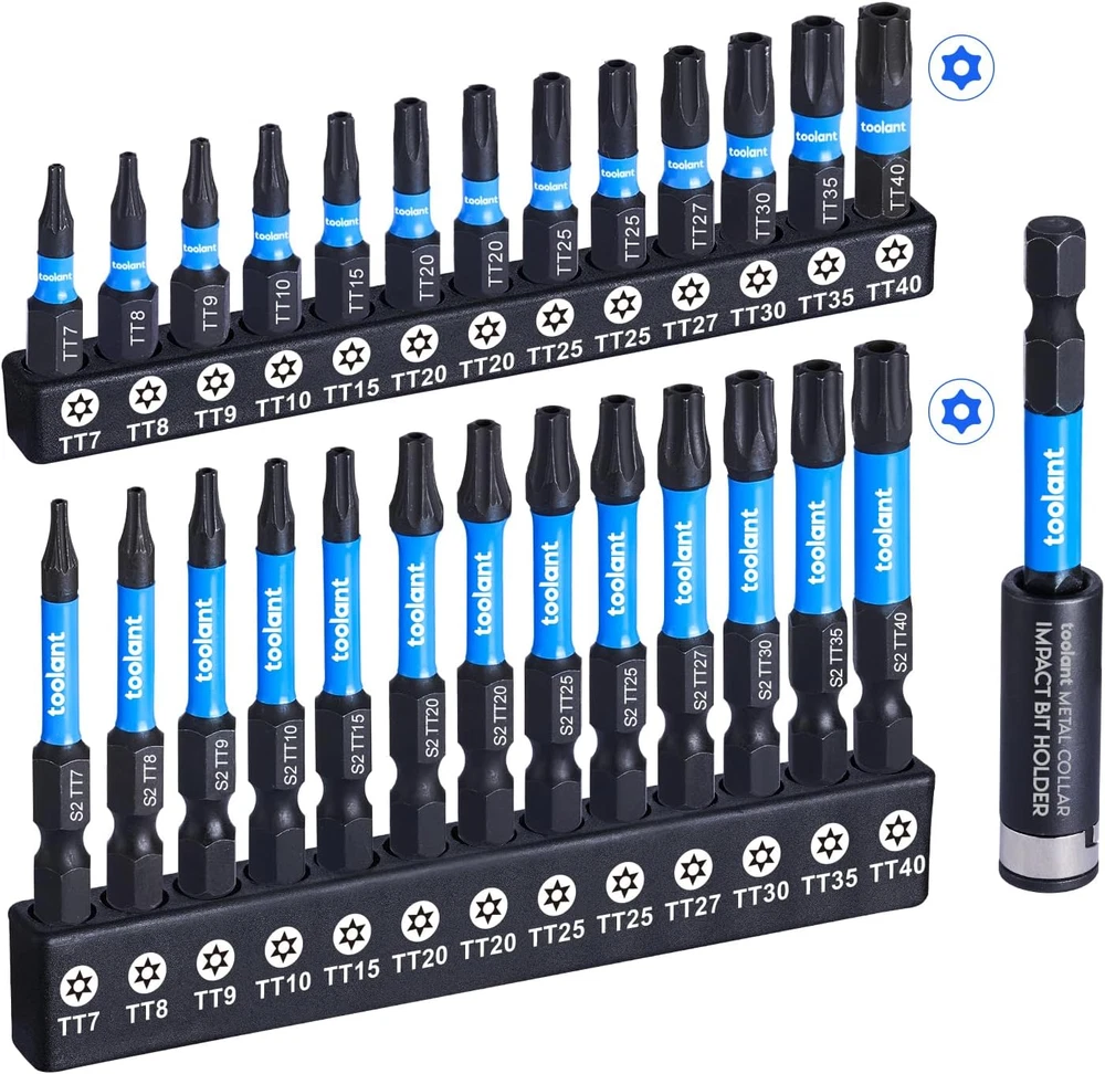 Store New Arrivals Add to Favorite View Feedback Contact Impact Torx Bit Set 27Pcs (TT7-TT40), S2 Steel Security Torx Bit Set, Tamper Proof Star Bit Set with CNC Machined Tips, 1"&2" Long Impact Bits with Magnetic Bit Holder and Storage Box Description Item model number 1 Part Number 1 Batteries Required? No Finish Manganese Phosphate Number of Pieces 27 Item Package Quantity 1 Country of Origin China Material S2 Alloy Steel Torque 1800 Inch Pounds Global Trade Identification Number 06975500463492 Compatible Fastener Range 1 inches Drive System Torx Item Weight 9.5 ounces Batteries Included? No Item Length 2 Inches Finish Type Manganese Phosphate Size 26+1PCS toolant impact security torx bit set 26+1pcs. Torsion zone to absorb torque peaks to avoid breakage. 10 times life expectancy versus standard bits. For impact driver, drill and screwdriver. 2” tamper proof torx bits 13pcs (tt7, tt8, tt9, tt10, tt15, tt20*2, tt25*2, tt27, tt30, tt35, tt40), 1” tamper proof torx bits 13pcs (tt7, tt8, tt9, tt10, tt15, tt20*2, tt25*2, tt27, tt30, tt35, tt40), 3” magnetic impact bit holder for tight space screw driving. CNC machined tips, S2 alloy steel body, hardened core to increase bit strength and reduce fracture. Manganese Phosphate surface to prevent rust. Strengthened magnetic impact torx bits helps you easy pick up screws. The magnetism doesn’t decay after multiple uses. (The 1” bits are not magnetic by themselves but only when connected with the magnetic bit bolder) Widely used in home repairs, automobiles, woodworking and other screw driving applications. All day after-sale service. Thanks for choosing toolant. Product Description toolant Impact Torx Bit Set Features&Applications 1 Torsion Zone 2 S2 Alloy Steel 3 CNC Machined Tip 4 Phosphating Surface 5 Torx&Security Torx 1 Tools 2 Bike 3 Automotive 4 Woodworking toolant Impact Bit Set Add to Cart Add to Cart Add to Cart Add to Cart Add to Cart Customer Reviews 4.7 out of 5 stars 3,072 4.8 out of 5 stars 89 4.7 out of 5 stars 5,283 4.5 out of 5 stars 561 4.5 out of 5 stars 214 Price $13.99 $ 13 . 99 $24.99 $ 24 . 99 $12.99 $ 12 . 99 $11.99 $ 11 . 99 $39.99 $ 39 . 99 Material S2 Alloy steel S2 Alloy steel S2 Alloy steel S2 Alloy steel S2 Alloy steel Impact resistance √ √ √ √ √ Drive System torx impact bit set hex philips torx Magnetism √ √ √ √ × Size T7-T40 1"& 3.5" Metric:1.5-8mm SAE:5/64”-5/16” ph2 1",2",4"&6" T30-T70 Number of Pieces 27 52 20 11 8 ABOUT US We offer the best prices around on high quality products. Our E-store includes media such as books, movies, music and games while offering electronics, toys, sporting apparel, clothing, tools, general home, garden items and more. SHIPPING We are always working hard to ensure your package arrives as soon as possible. Please understand that some factors like weather, high postal traffic, and the performance of shipping companies are outside of our control. We offer free shipping to the lower 48 states and ship within 2 business days of payment, usually sooner. We do not accept P.O. Boxes. Please provide a physical address. RETURNS We offer a 30-Day Return Policy on items which you are not completely satisfied with. You have the option for a full-refund or an exchange of the item. No returns are available on items shipped outside of the USA. PAYMENT We accept PayPal. CONTACT US This page content is yet to come Please ad us to your favorite seller and visit again later Thank You CUSTOMER SATISFACTION We try our very best to make sure every customer is completely satisfied. If there's a problem, message us! We're happy to help.