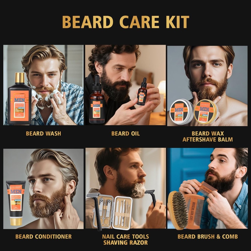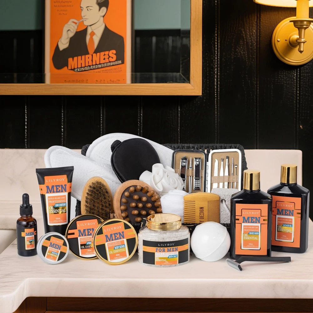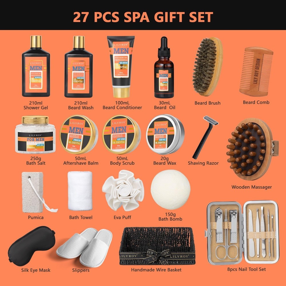 27Pcs Valentines Day Gifts Spa Gift Basket for Men - Bath and Body Gift Basket Set for Dad with Massager | Perfect Gifts for Christmas, Fathers Day, Birthday Gift Beard Bath Spa Gift Set for Men Product Details Scent: Oak Sandalwood Brand: LILY ROY MPN: LR2025013 UPC: Does not apply EAN: Does not apply Item Form: Liquid Scent: Oak Sandalwood Brand: LILY ROY Product Benefits: Brightening, Cleansing, Moisturizing, Nourishing, Smoothing, Softening Skin Type: Combination, Dry, Normal, Oily Package Dimensions : 11.18 x 7.72 x 6.81 inches; 4.41 Pounds Manufacturer : LILY ROY Best Sellers Rank: #108,693 in Beauty & Personal Care (See Top 100 in Beauty & Personal Care) #329 in Bath & Shower Sets #329 in Bath & Shower Sets Customer Reviews: 4.7 4.7 out of 5 stars (406) 27 PCS SPA GIFT BASKETS FOR MEN: 210mL Shower Gel, 210mL Beard Wash, 100mL Beard Conditioner, 50mL Aftershave Balm, 50mL Body Scrub, 30mL Beard Oil, 250g Bath Salt, 150g Bath BOMB, 20g Beard Wax, 8pcs Nail Tool Set, Eva Puff, Bath Towel, Beard Brush, Beard Comb, Wooden Massager, Silk Eye Mask, Slippers, Pumica packaged in a nice natural beautiful basket. The 27 pcs men spa set offers the most luxurious and perfect bath experience BATH GIFT BASKET SET FOR MEN: Sandalwood has a warm, forest scent, and this bath set creates a warm feel like a holiday CHRISTMAS SPA GIFT SET FOR MEN: Lily Roy's at-home spa kit for men contains premium quality and Mit Free, Paraben-Free, Cruelty-Free shower spa essentials that are rich in Vitamin E, Shea Butter, and Essential Oil to help moisturize and soothe the skin SPA GIFTS FOR MEN: Great gift baskets for men on Valentine's Day, Father's Day, Anniversary, Birthday, Christmas. The recipient will like it COMES WITH A REUSABLE WEAVED BASKET: Its upscale and beautiful basket makes a multi-purpose storage solution to keep your beauty essentials. It also creates a unique decoration for your bathroom, vanity table, powder area, and more. It also has a gift note card for you to personalize it