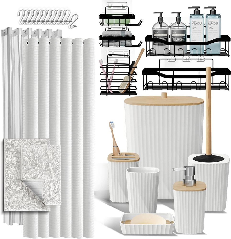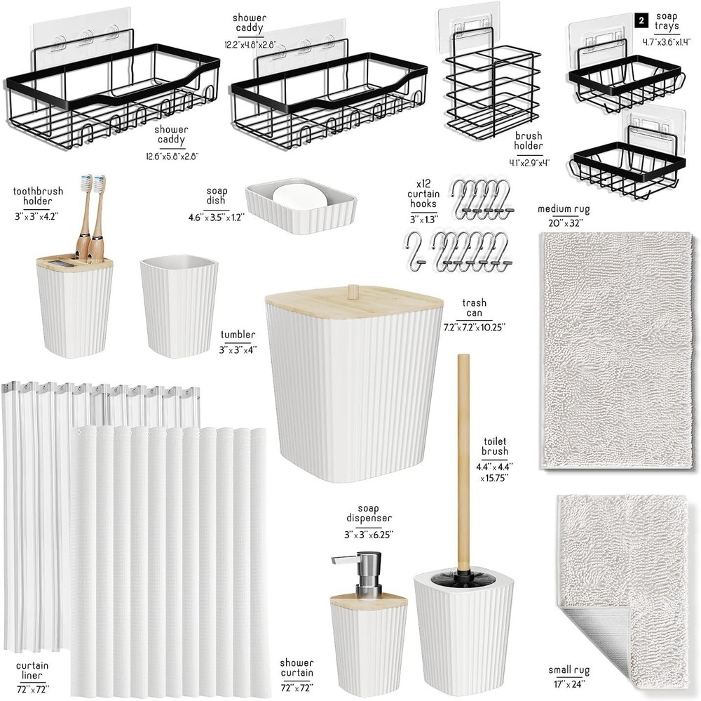 Bathroom Accessories Set with Shower Caddy and Bath Rugs 27PC Bathroom Accessory Set with Shower Caddies White Bath Rugs, Shower Curtain Set, Toilet Brush, Trash Can, Soap Dispenser, Toothbrush holder 100% Polyester White Bathroom Accessories Set: Incorporate white bathroom decor with our coordinated bathroom accessory set for bathroom organization. Our bamboo bathroom accessories are easy to set up and clean, transforming your bathroom into a spa-like retreat. 27 Piece Bathroom Set Includes: 5 Piece shower caddy set, 2 chenille Bathroom rugs (1 Large 20”x32” and 1 Small 17”x24”), Toothbrush holder, Tumbler, Soap dispenser, Soap dish, Bathroom trash can, Toilet brush and holder set, fabric shower curtain set with clear shower curtain liner and 12 shower curtain hooks. Boho White Shower Curtain: Our shower curtains for bathroom measure 72” x 72” and are made of durable, wrinkle-resistant polyester with a waffle texture, and includes a clear shower curtain liner with weighted magnets at the bottom to keep it in place, and 12 rust-resistant shower curtain rings. Efficient In Shower Storage Solution: Maximize and elevate your space with this versatile adhesive shower caddy set, perfect for organizing toiletries in the bathroom, bedroom, living room, or for use in the kitchen, its robust construction ensures a heavy-duty weight capacity, securely holding your essentials without sagging. Rustproof Durability and Easy Installation Bathroom Caddy: Made from high-quality stainless steel, this shower caddy set is designed to resist rust and corrosion, these self-adhesive shower shelves can be easily installed on tiles, tempered glass, marble, and wood walls without any drilling required ensuring long-lasting performance and durability.